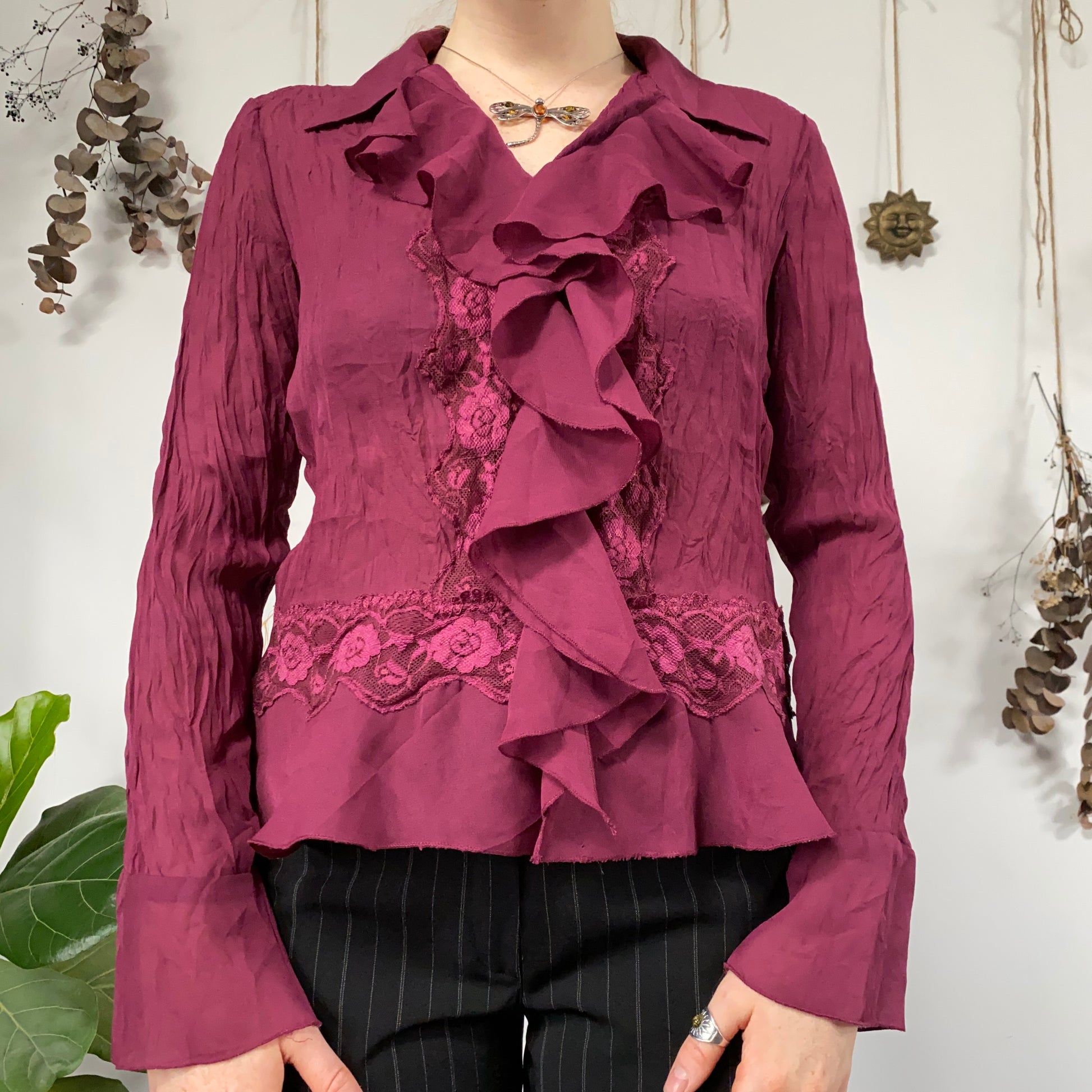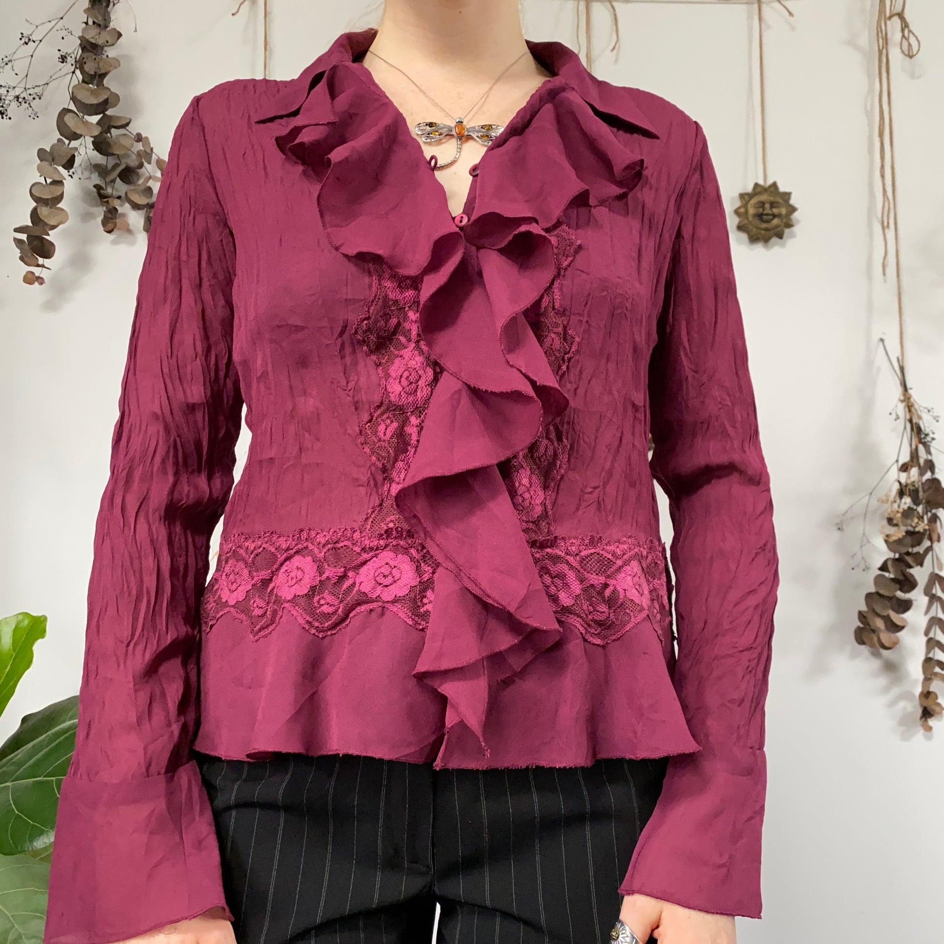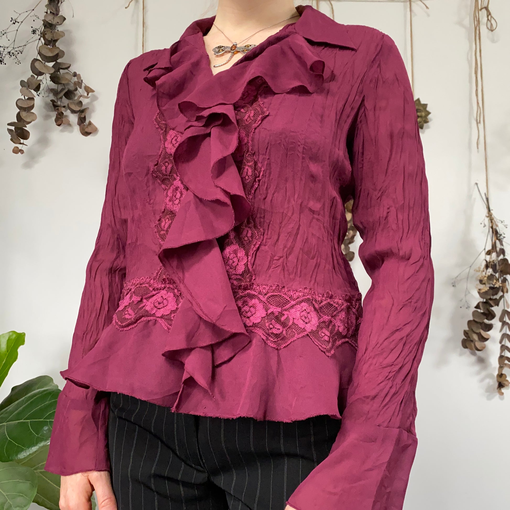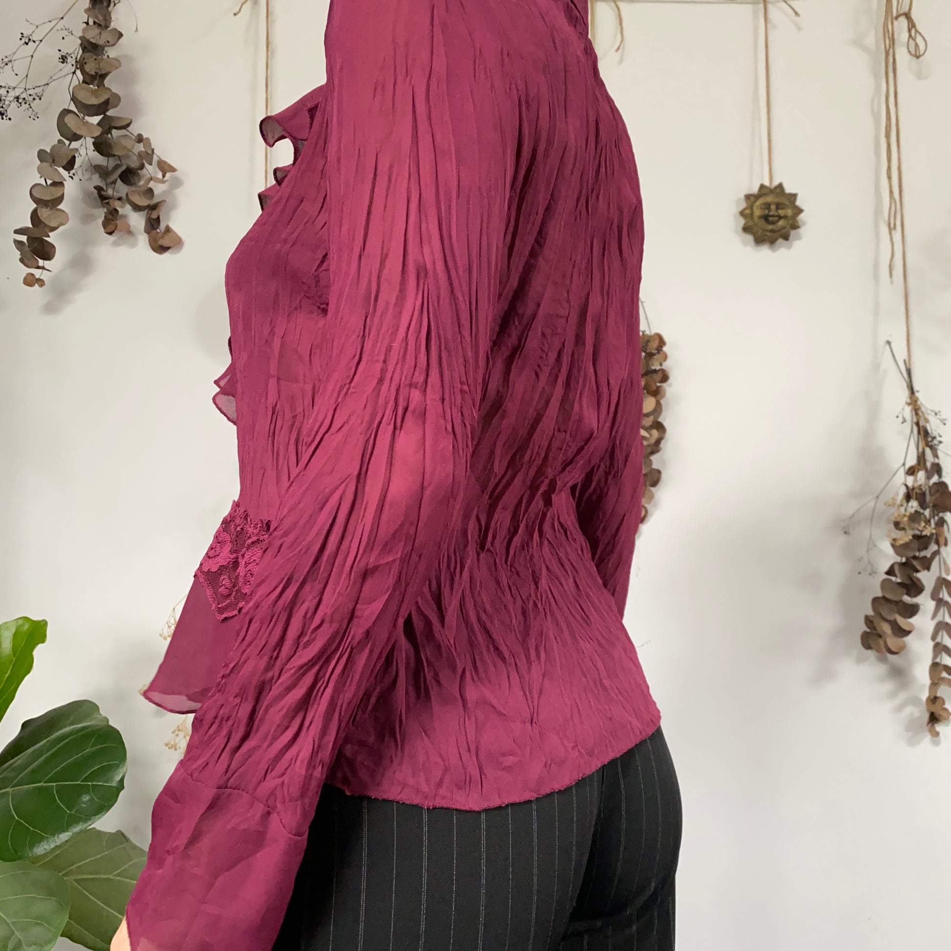 Vintage berry crinkled ruffle blouse, buttons down the front