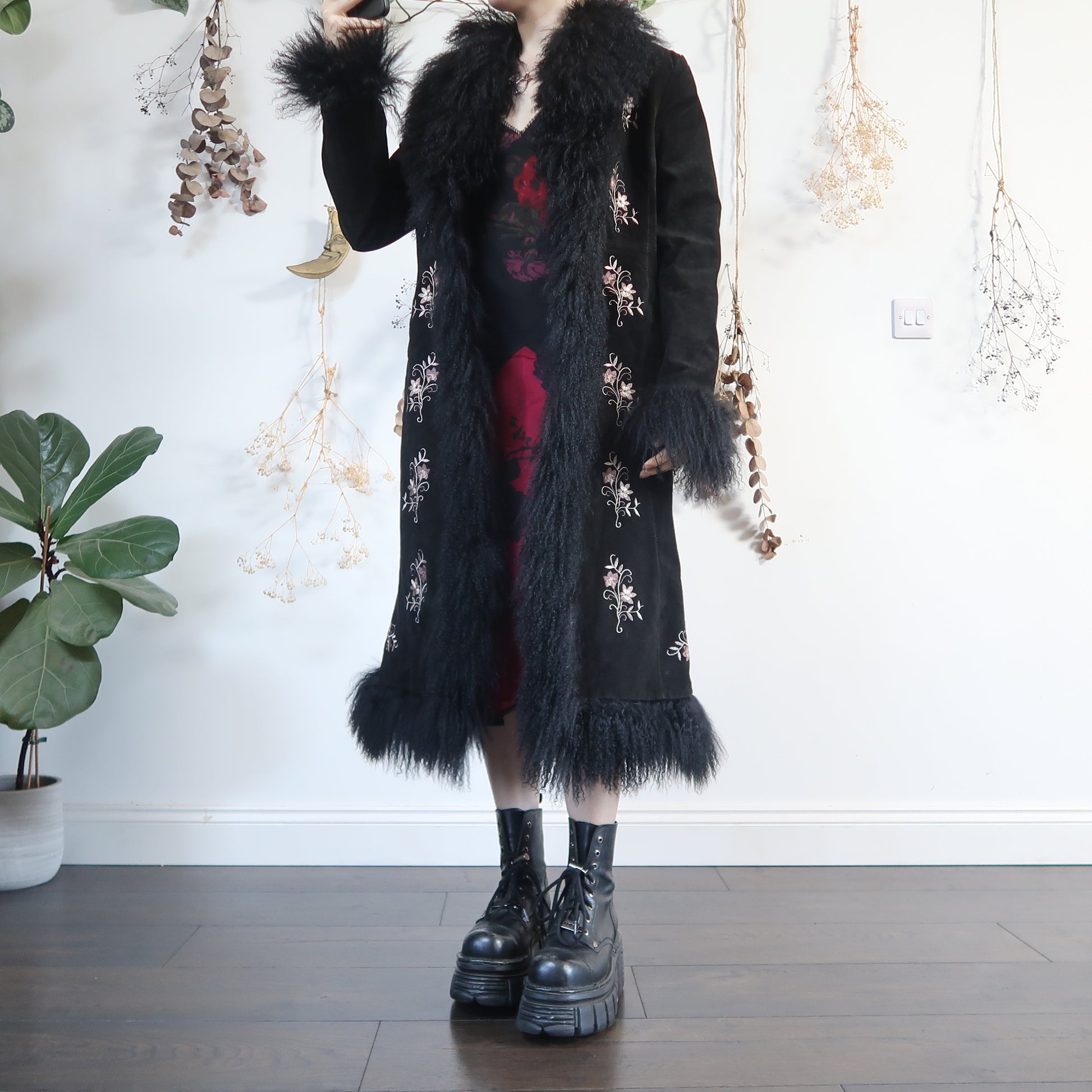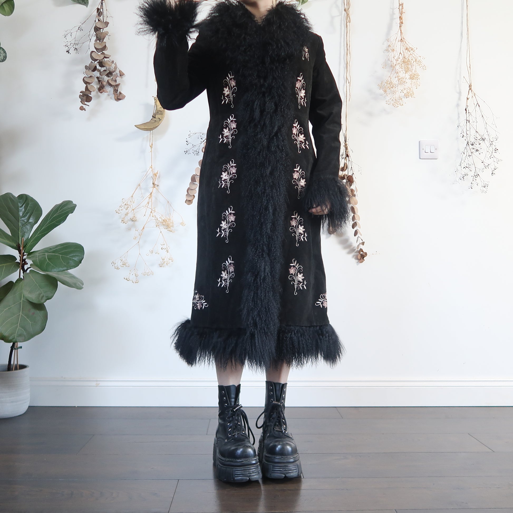 Vintage early 00s black suede afghan coat with real mongolian fur trim and embroidered detail