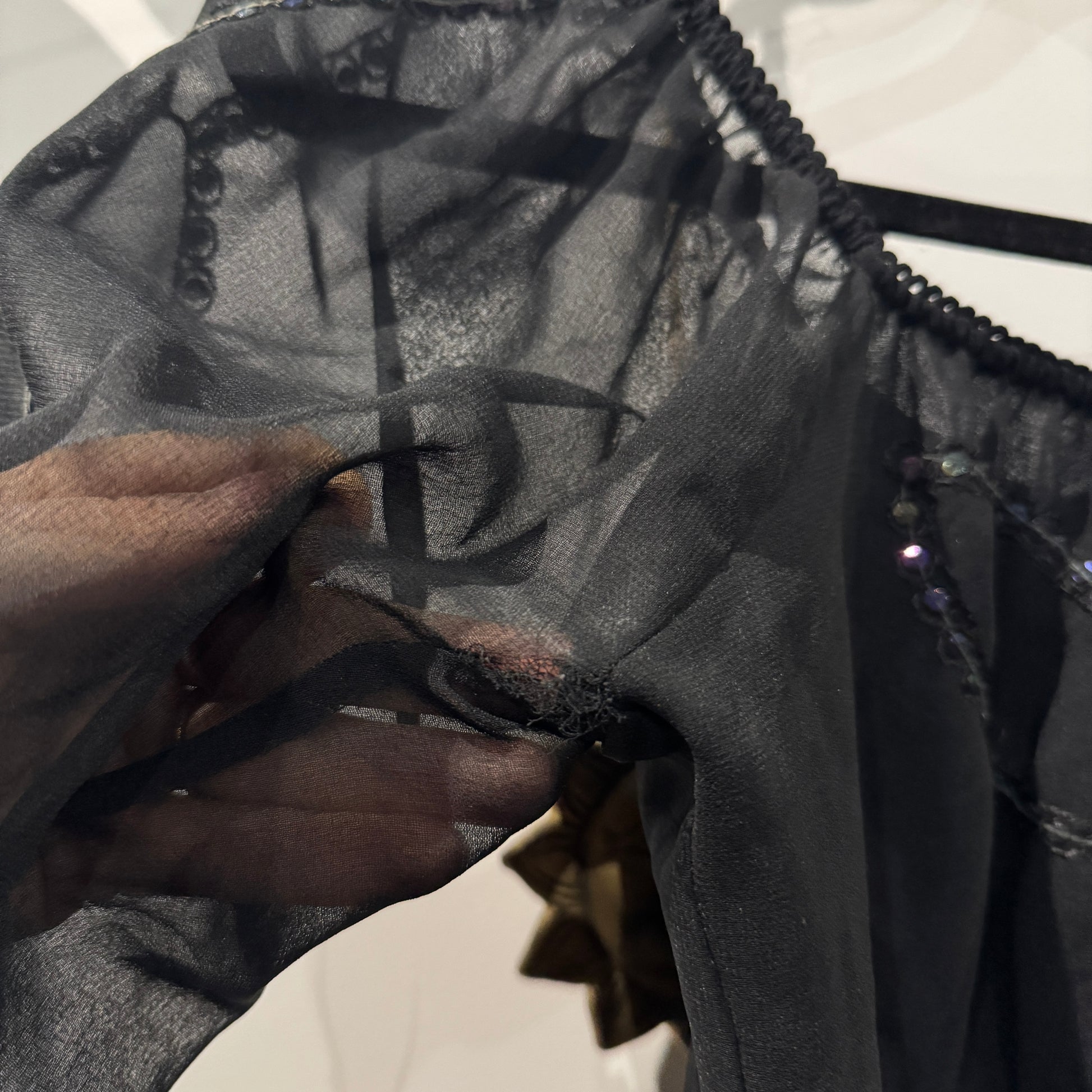 Vintage black blouse with sheer flared sleeves, embroidered and sequin detailing, and an elasticated neckline. Ties at the back