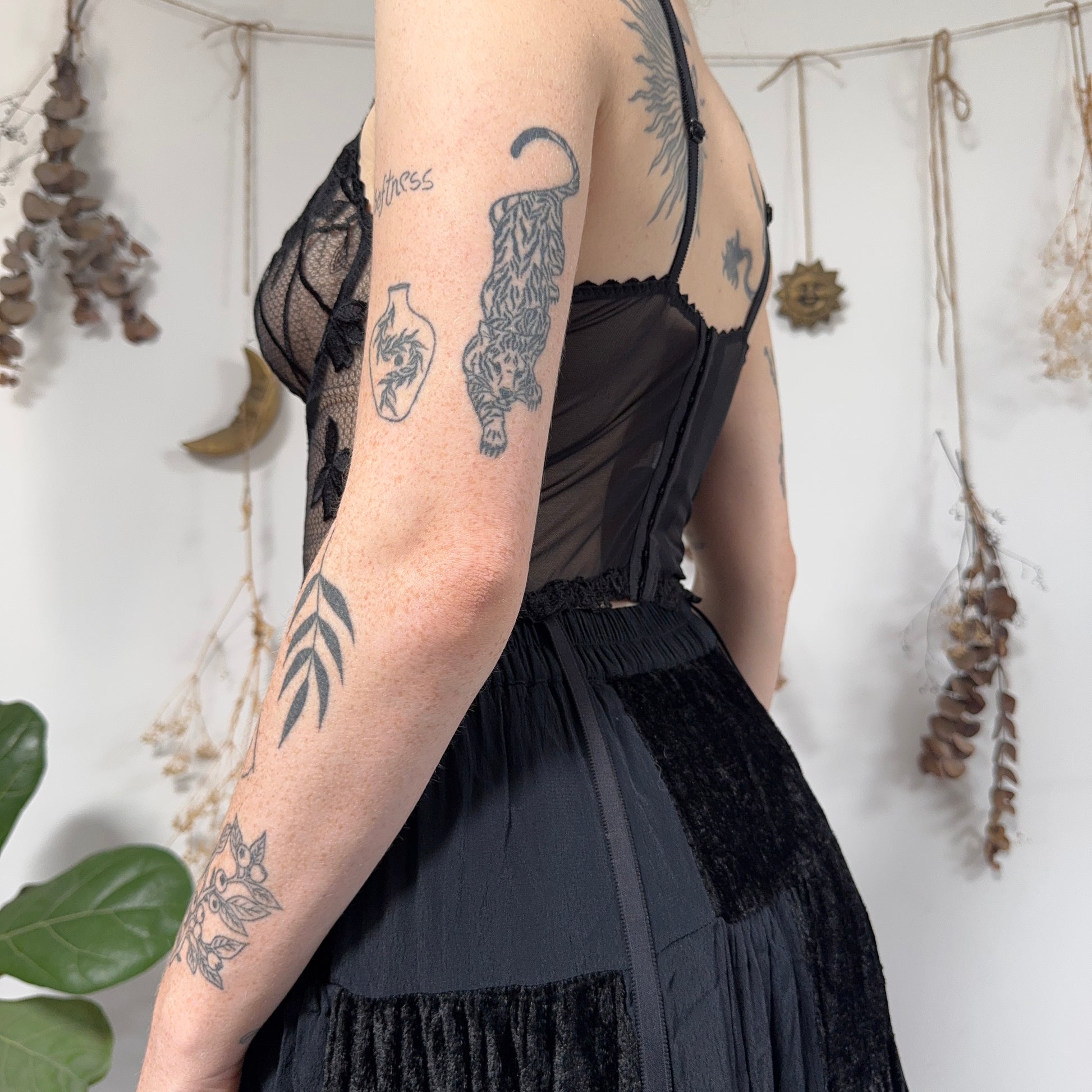 Vintage black sheer mesh embroidered corset top with suspender straps