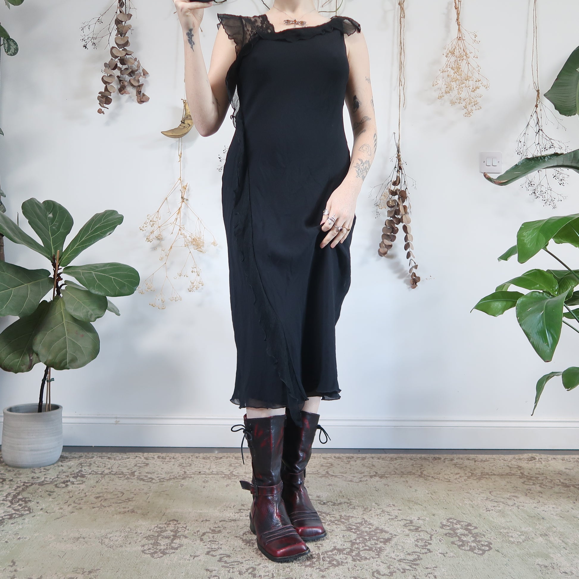 Vintage black asymmetric midi dress with one lace sleeve and a silk ruffle down one side