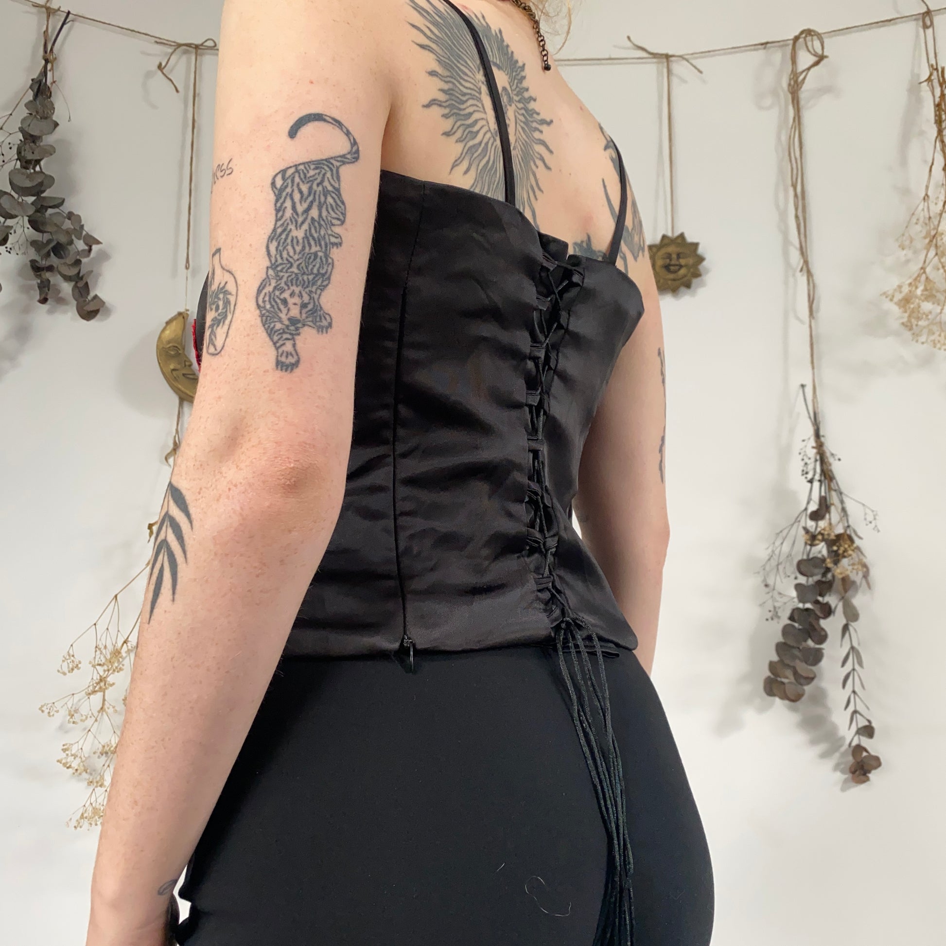 Vintage black satin corset with red floral detail, lace up back which can be loosened