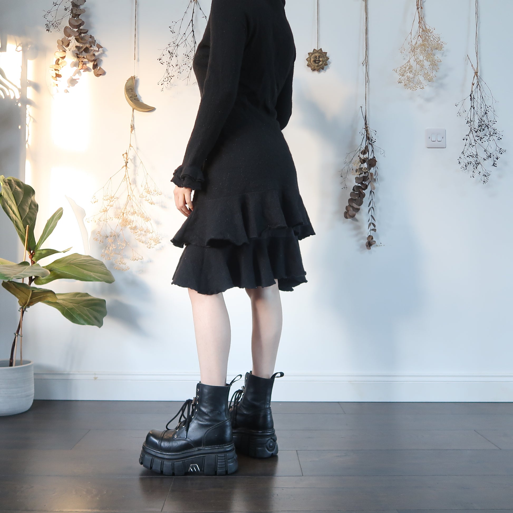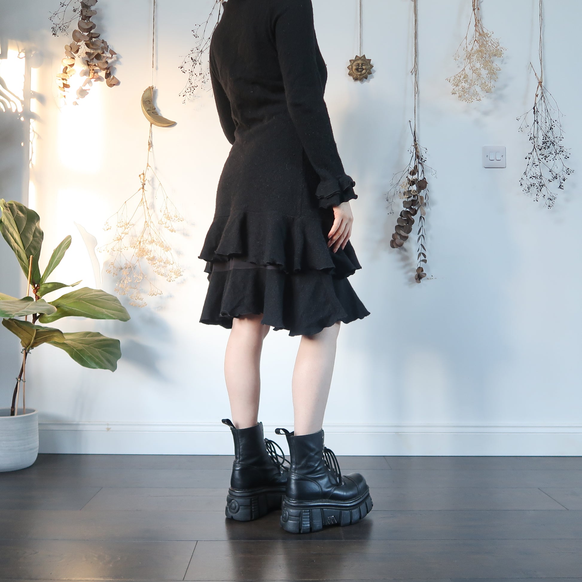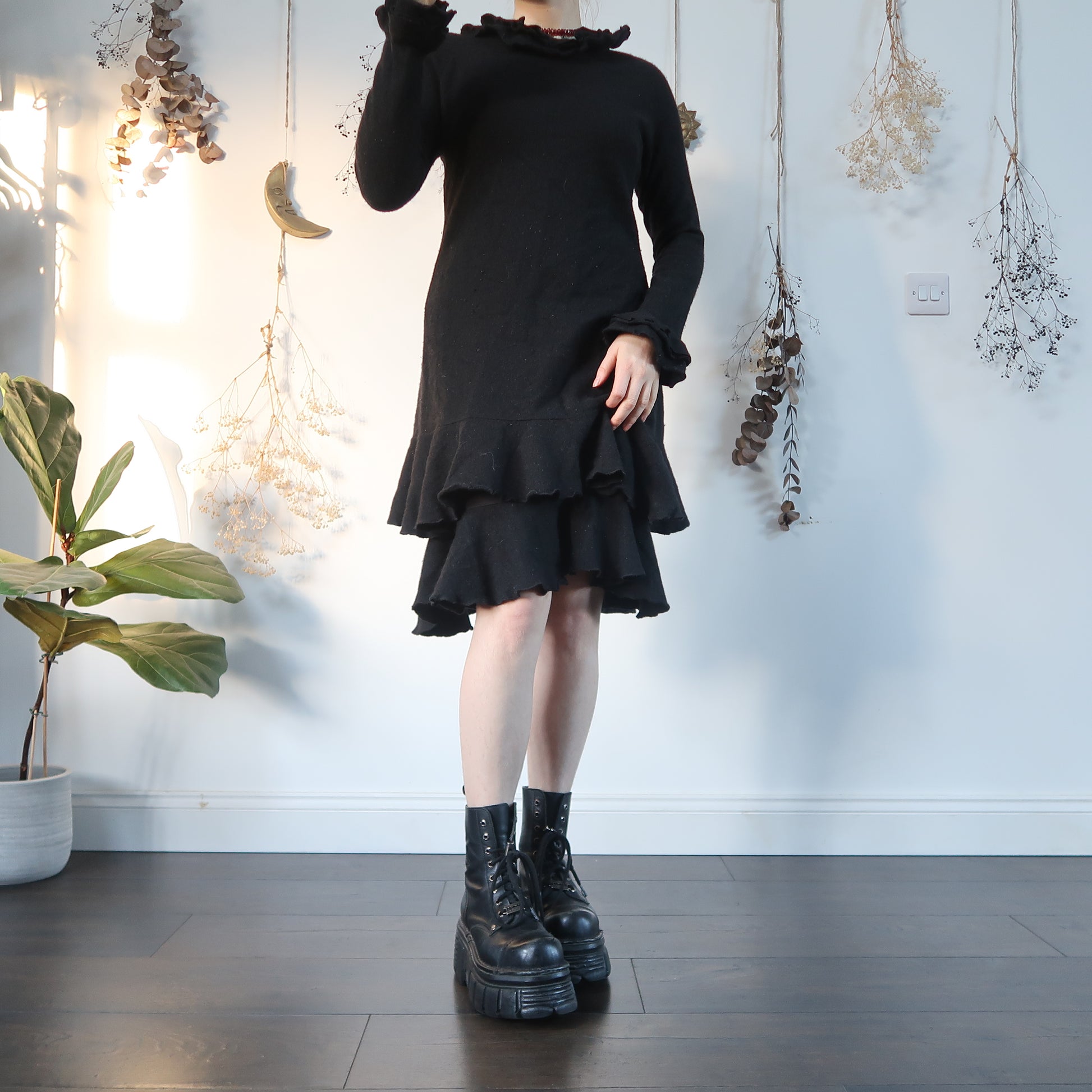 Vintage black knit layered midi dress with a ruffle collar and cuffs