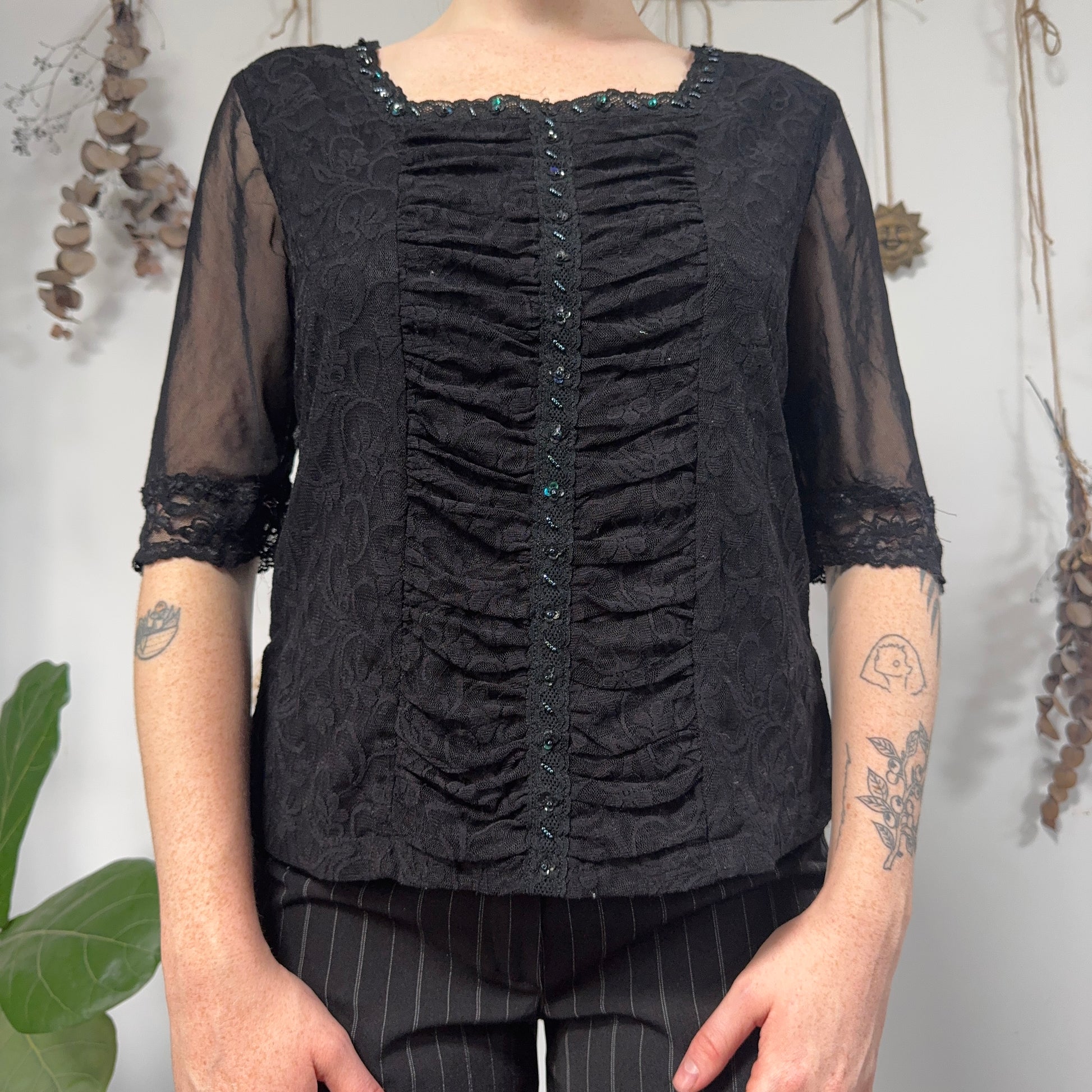 Vintage black lace mesh blouse with ruching down the front, beaded detail and sheer mesh sleeves