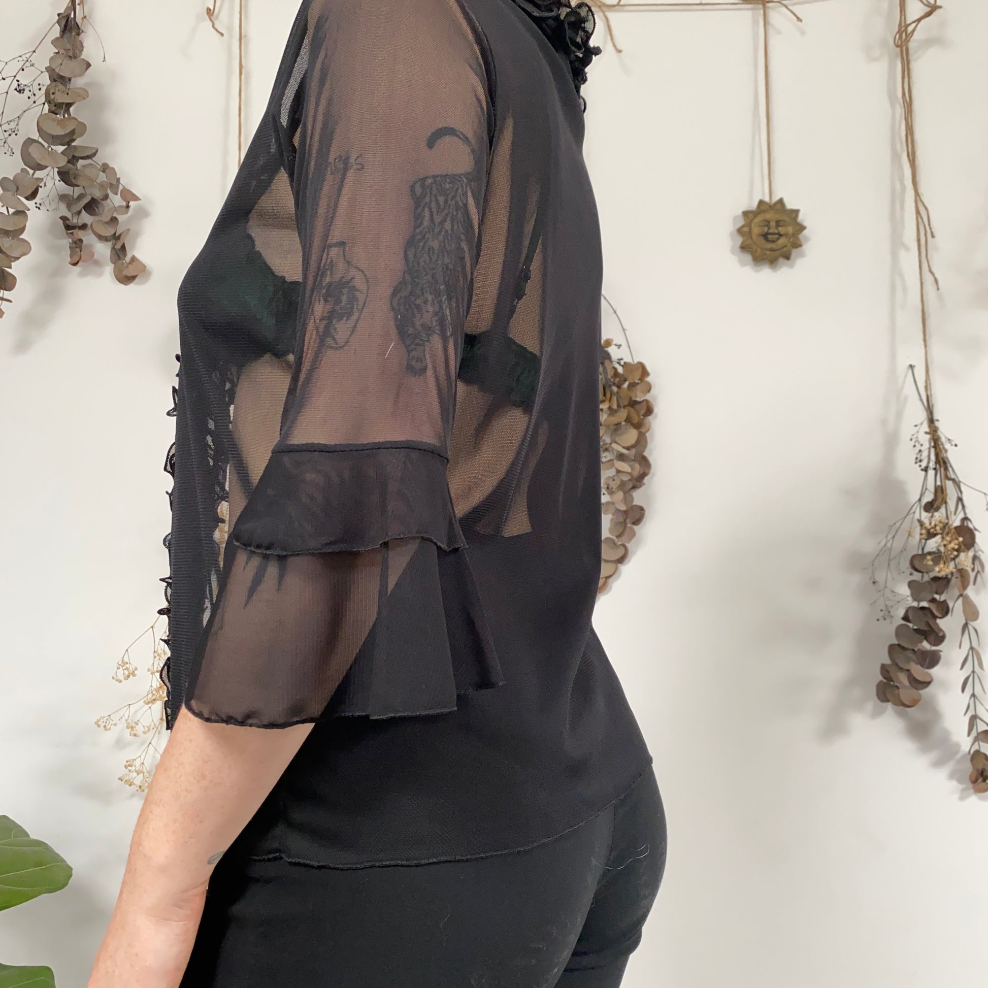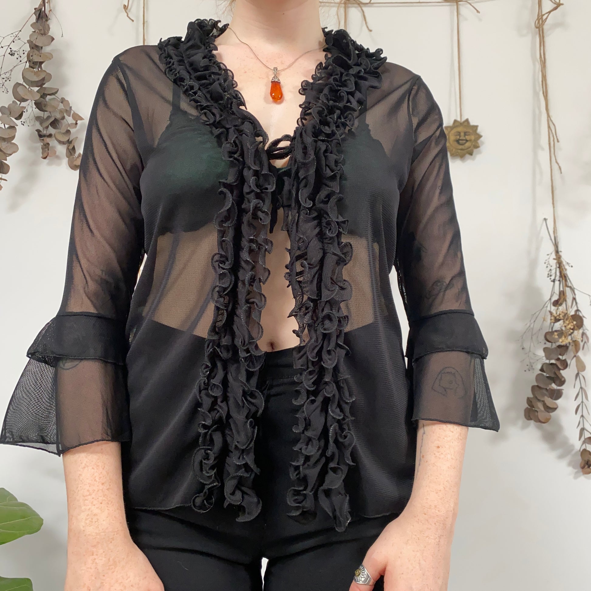 Vintage black sheer mesh tie up ruffle top with flared sleeves
