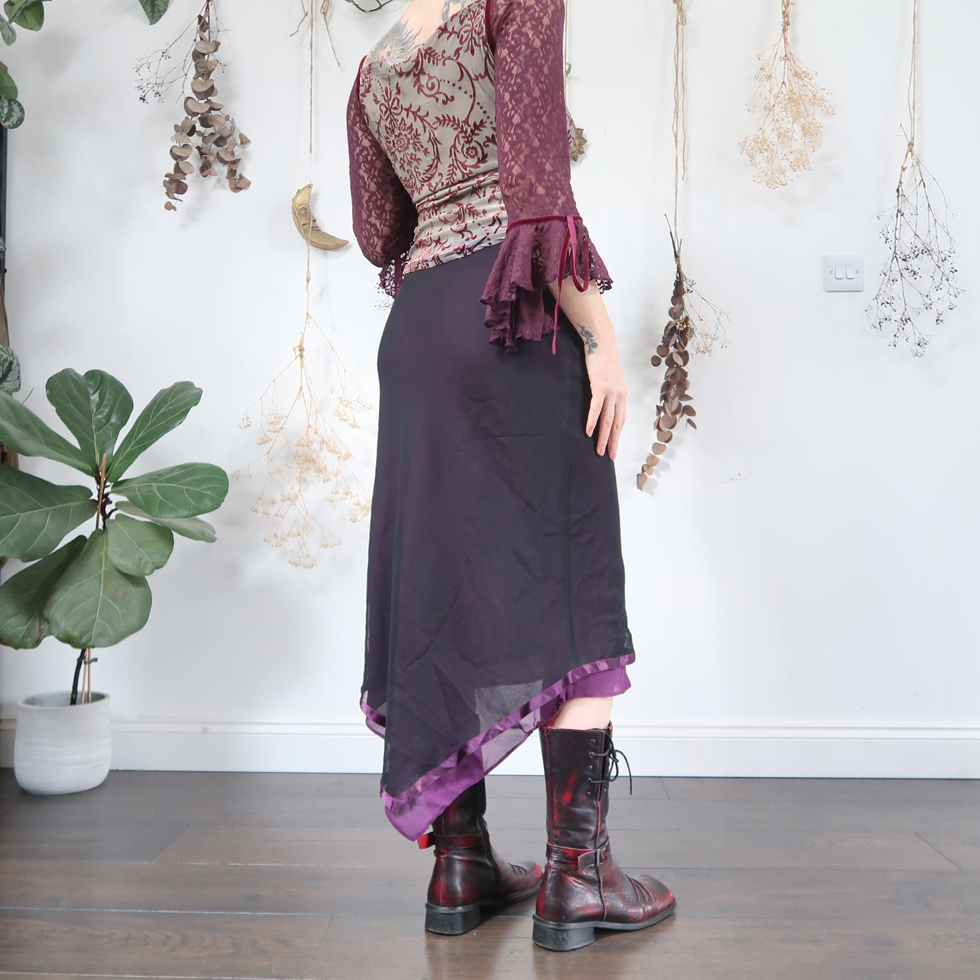 Vintage black and purple midi skirt with a dipped hankie hem at the back