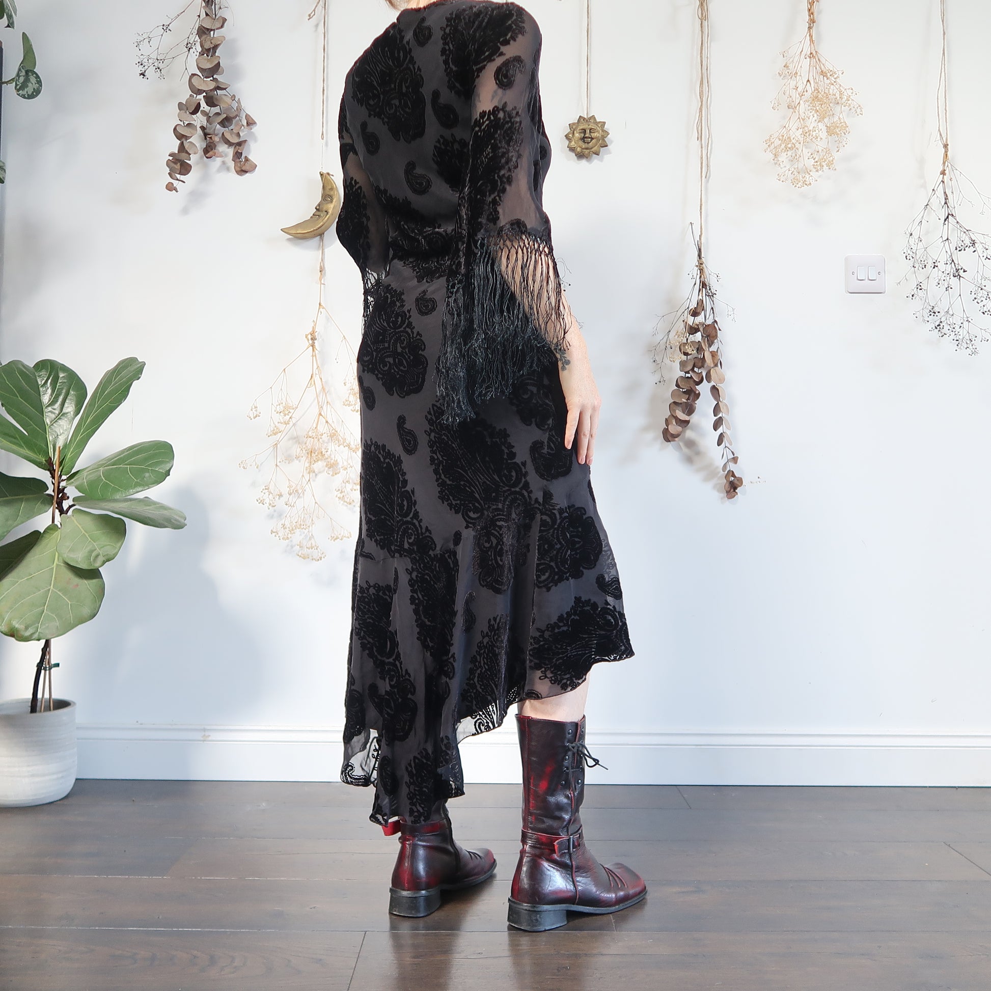 Vintage Rene Derhy black velvet embossed dress with stunning flared fringed sleeves. Stevie Nicks dress of dreams!