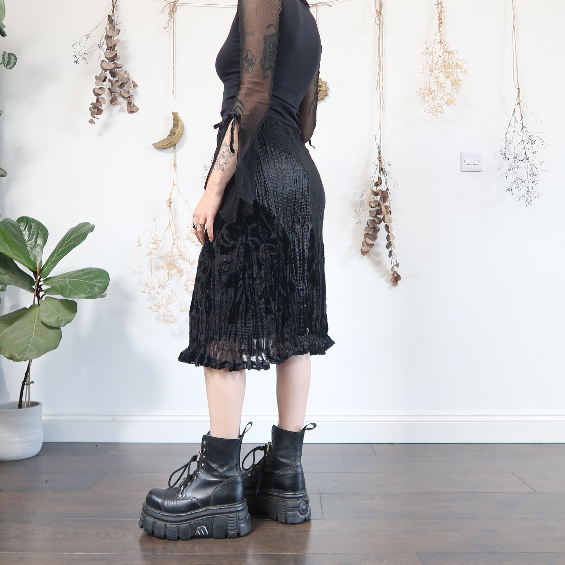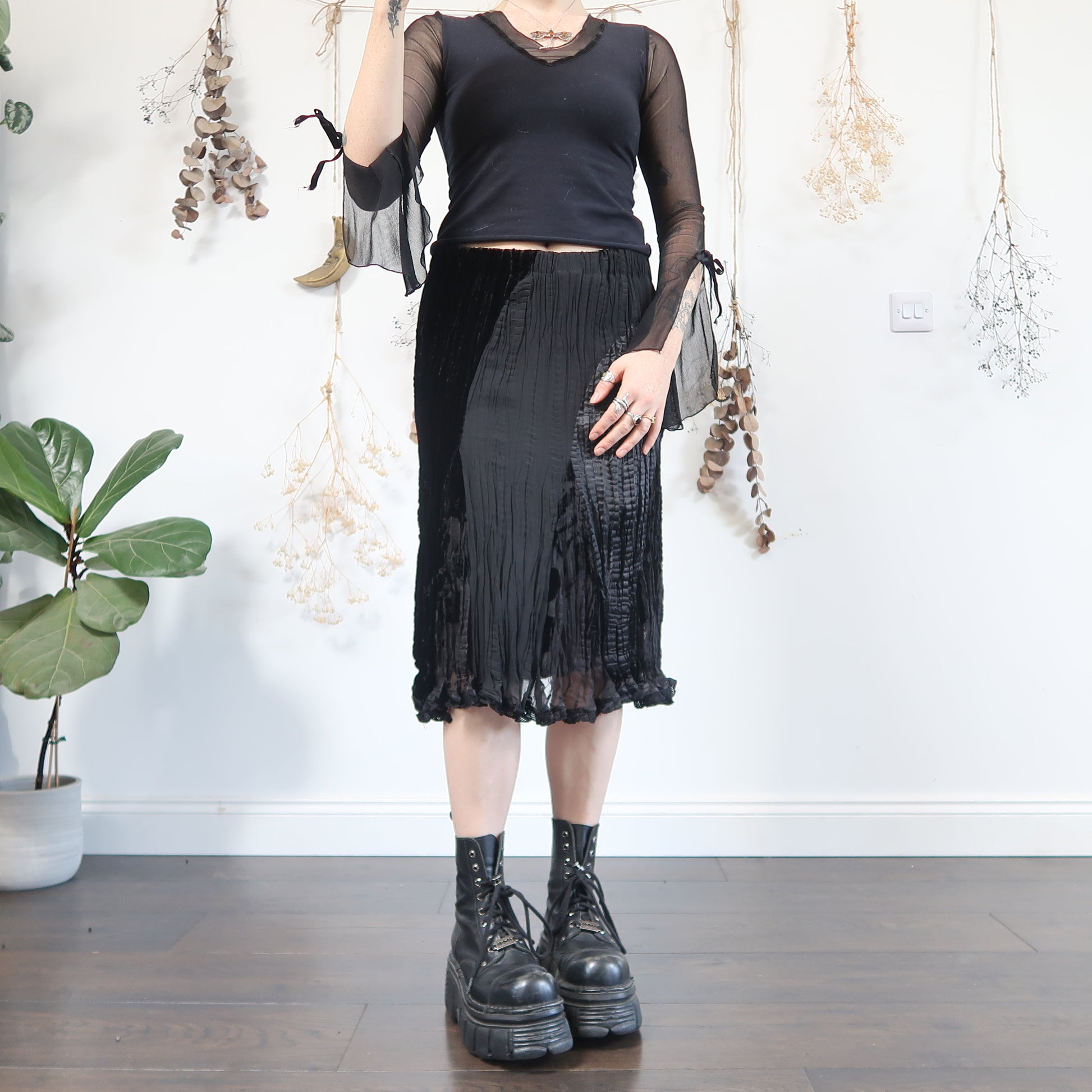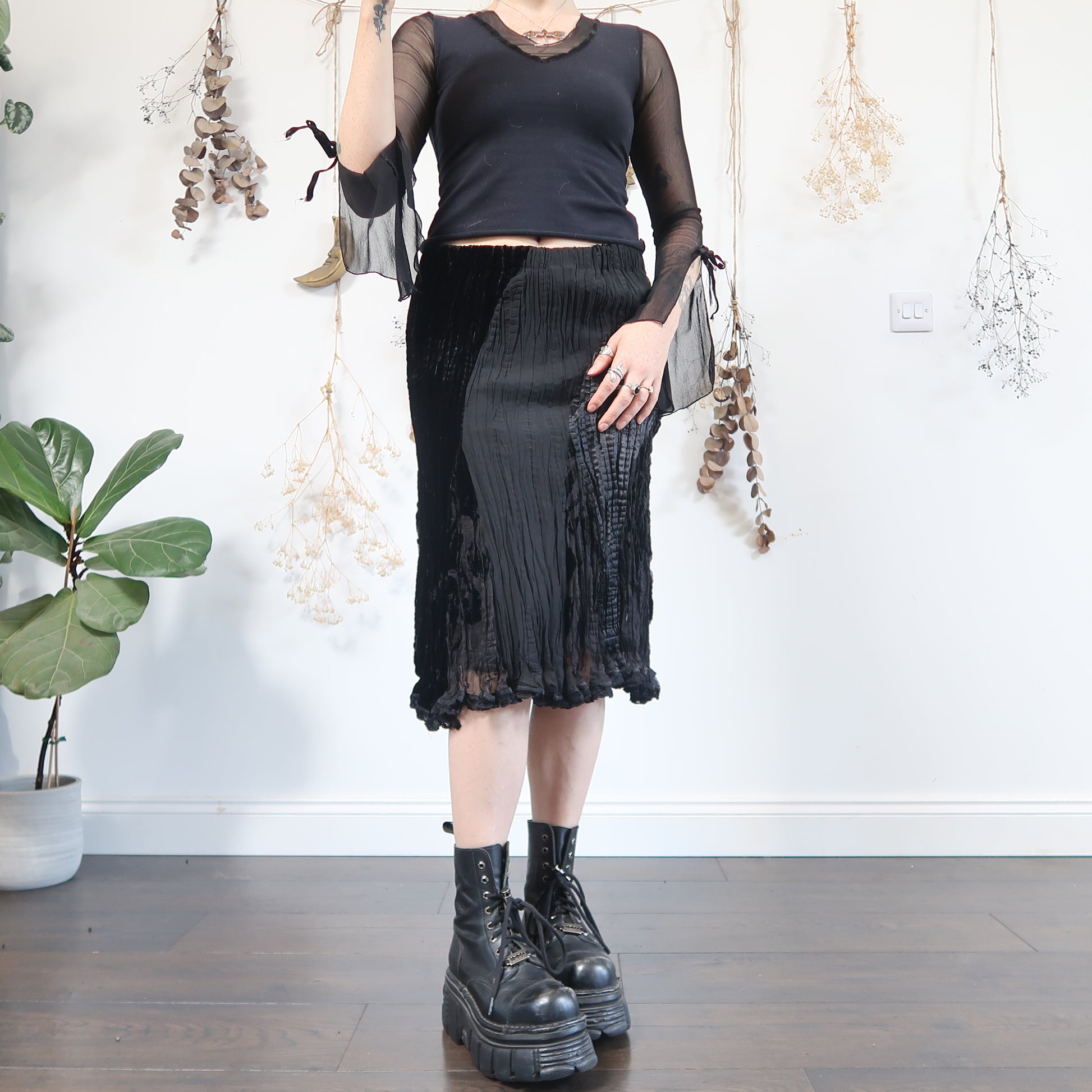 Vintage black velvet and crinkle satin midi skirt