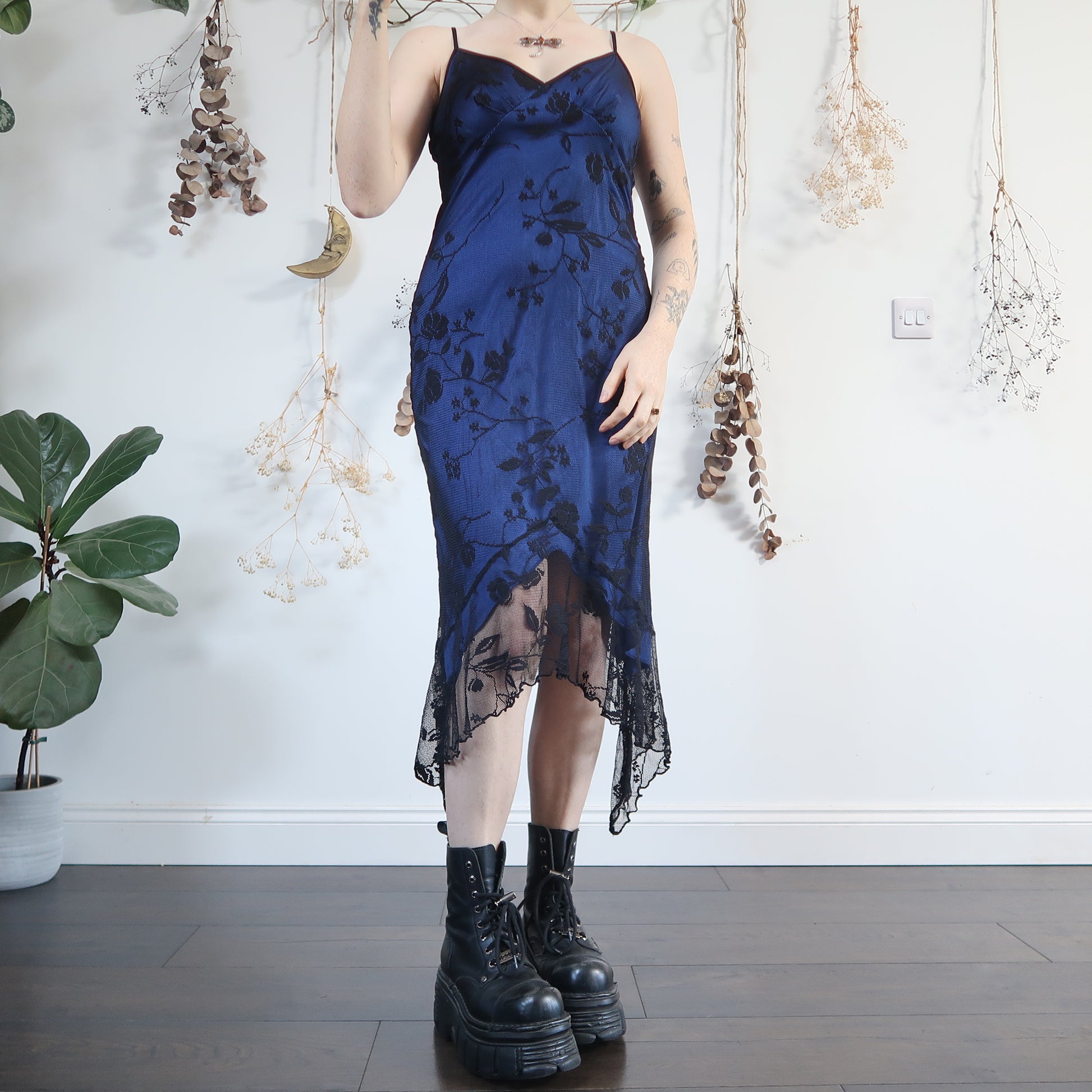 Vintage blue and black lace overlay midi dress with asymmetric hem