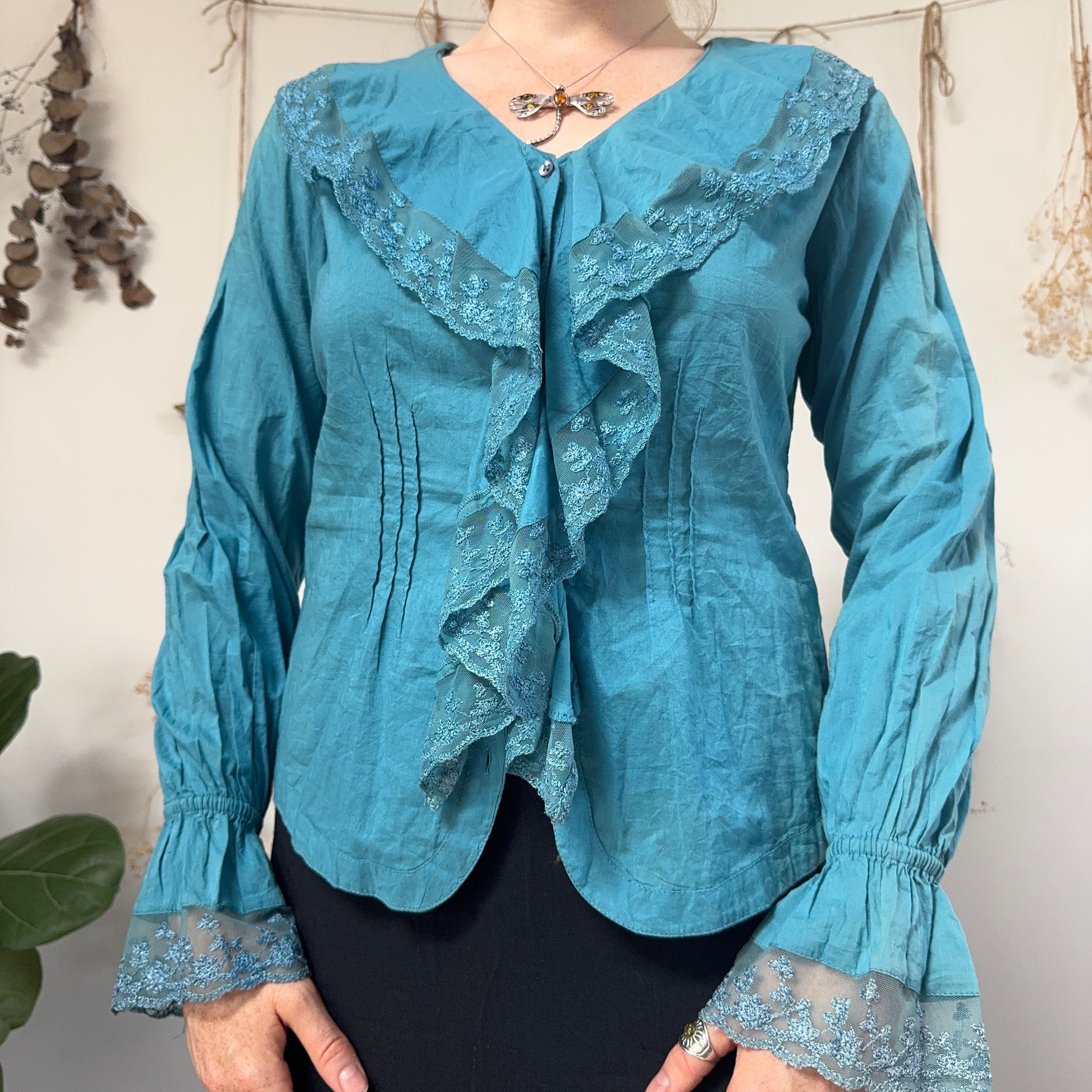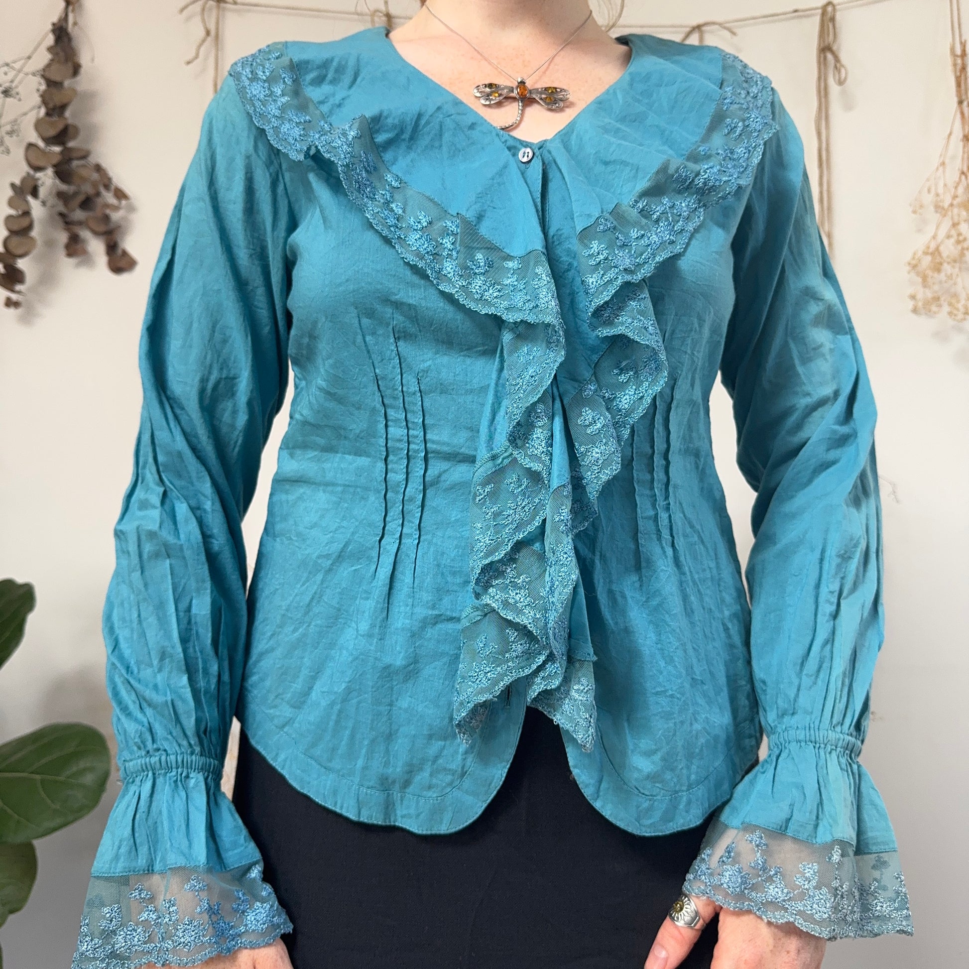 Vintage blue button down ruffle blouse with embroidered mesh trim