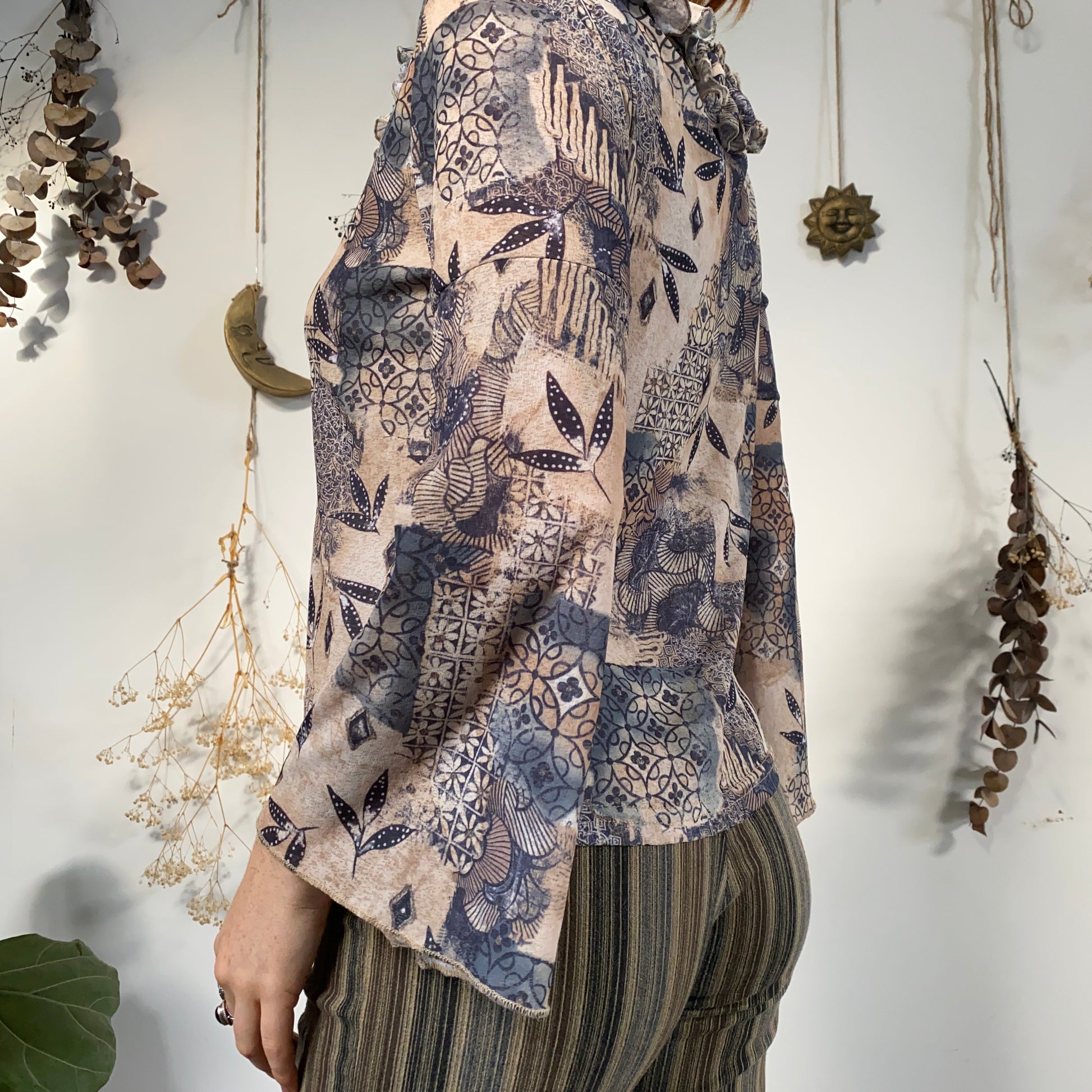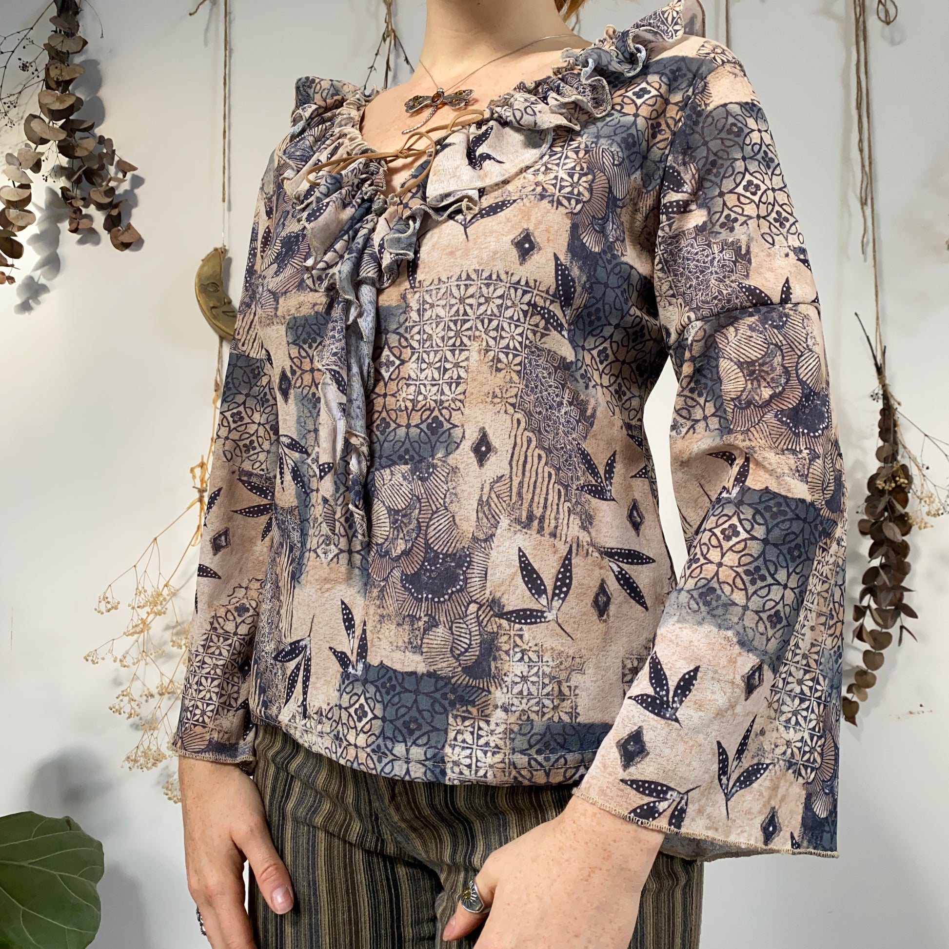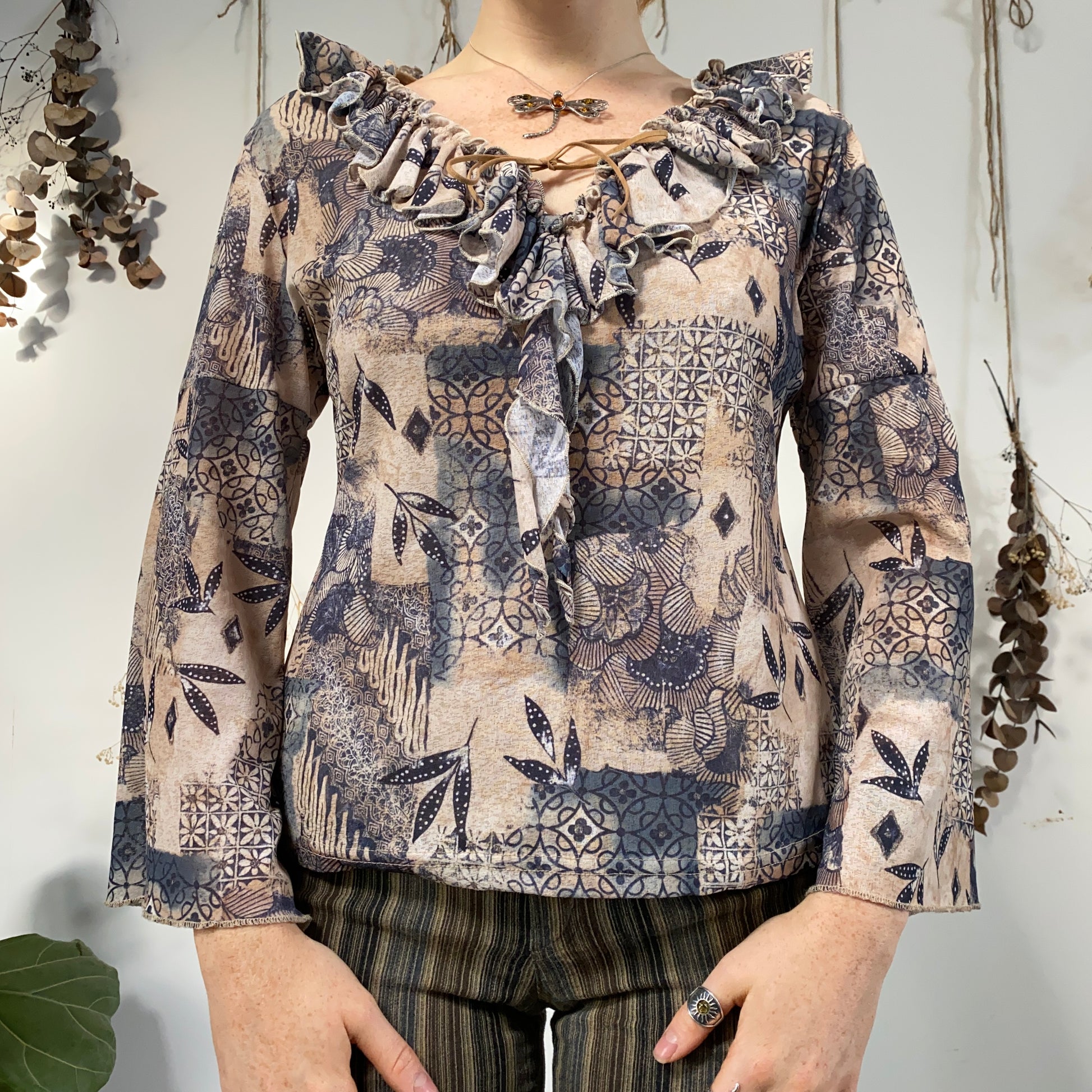 Vintage earthy blue patterned mesh top with ruffle, flared sleeves and tie detail