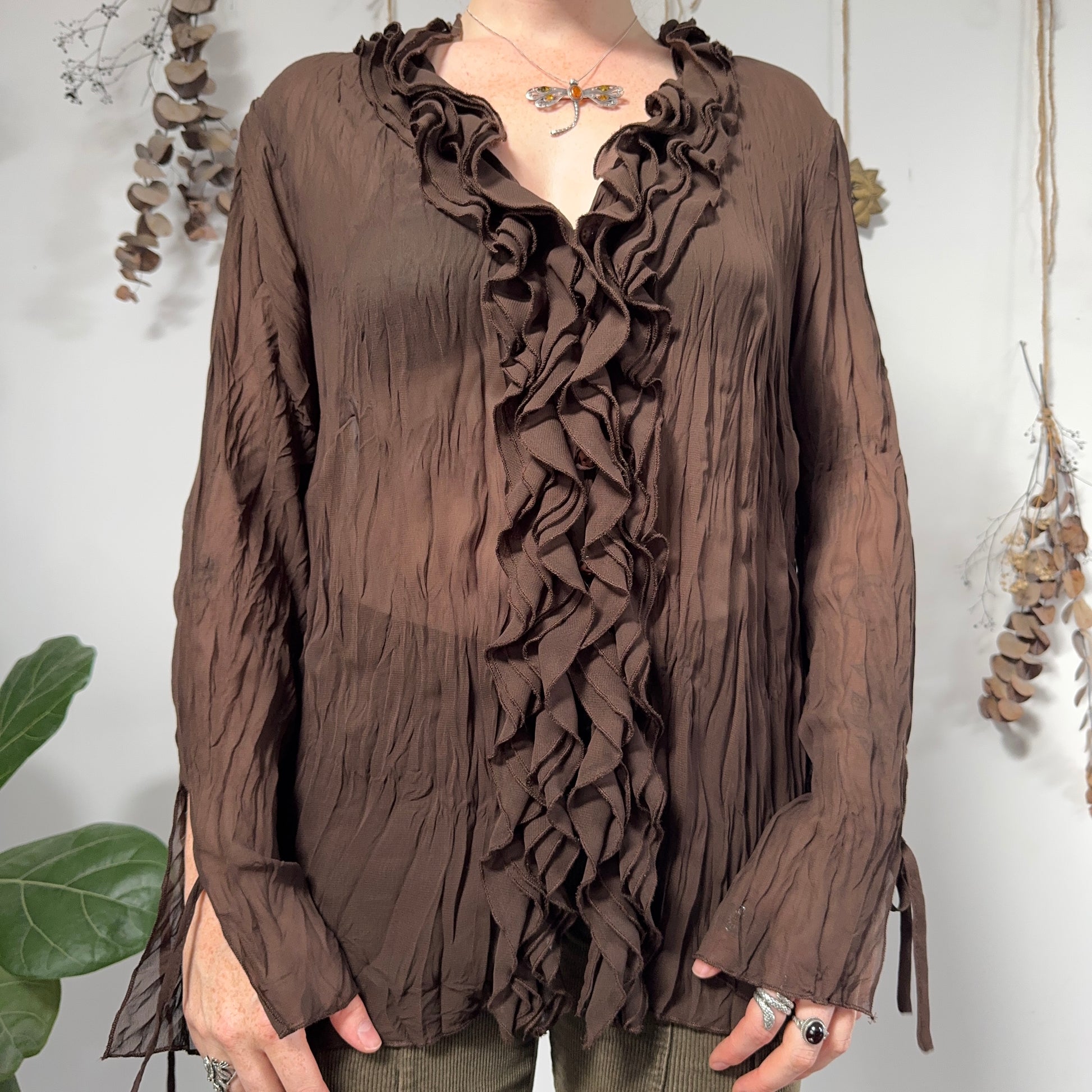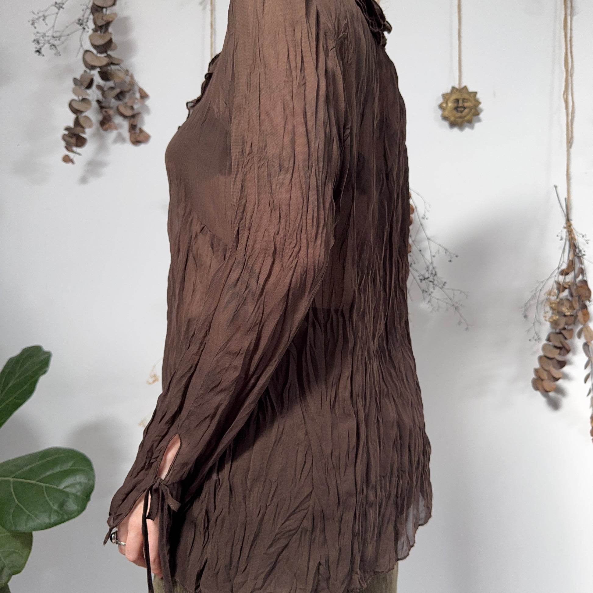 Vintage brown crinkled semi sheer ruffle blouse