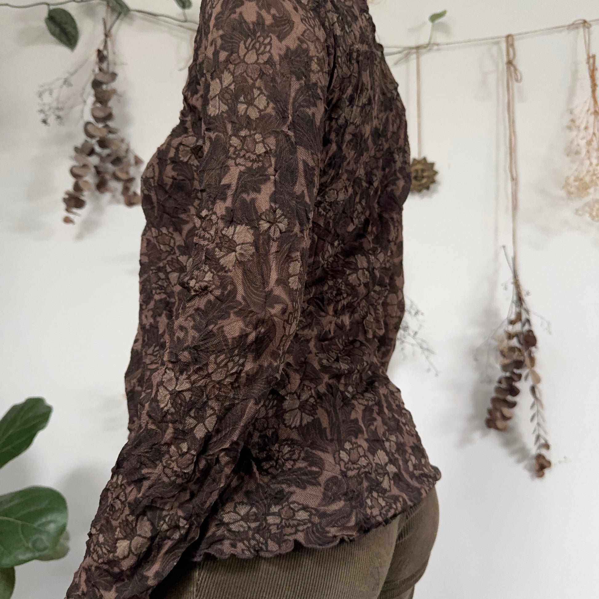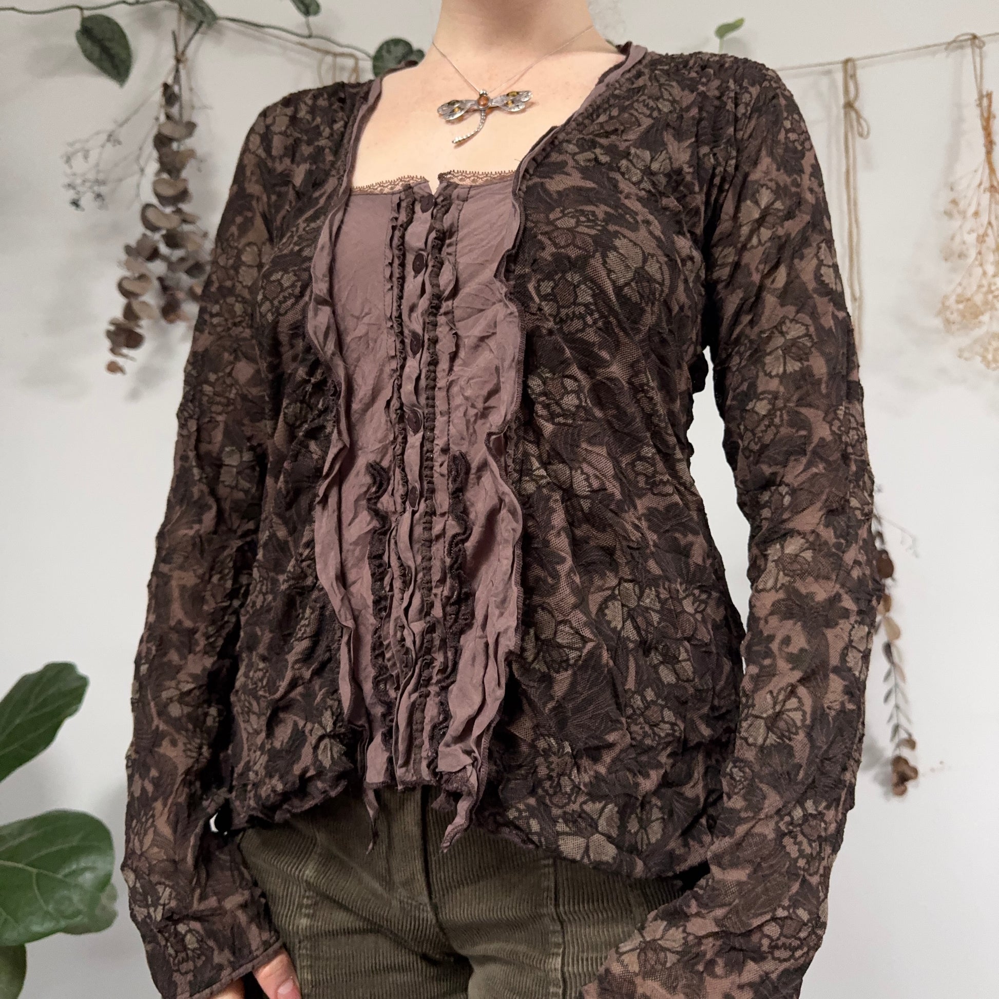 Vintage brown floral mesh button down ruffle blouse