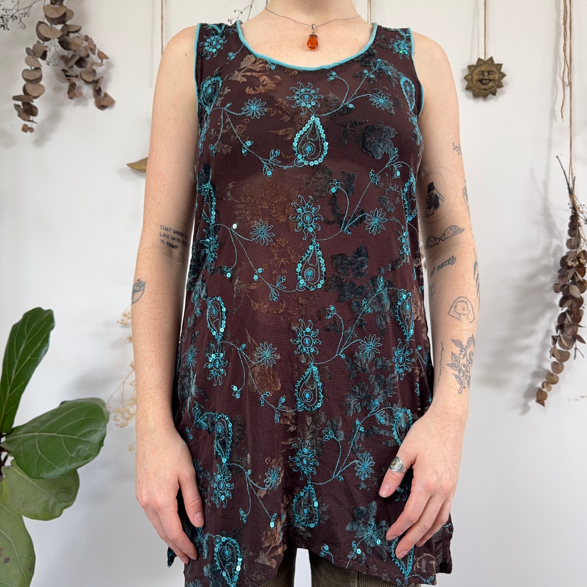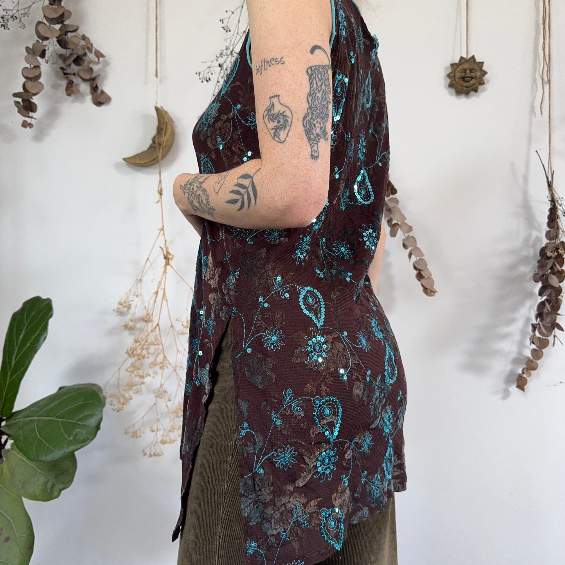 Vintage brown mesh mini dress with blue sequins, embroidery, flocking and slits on both sides