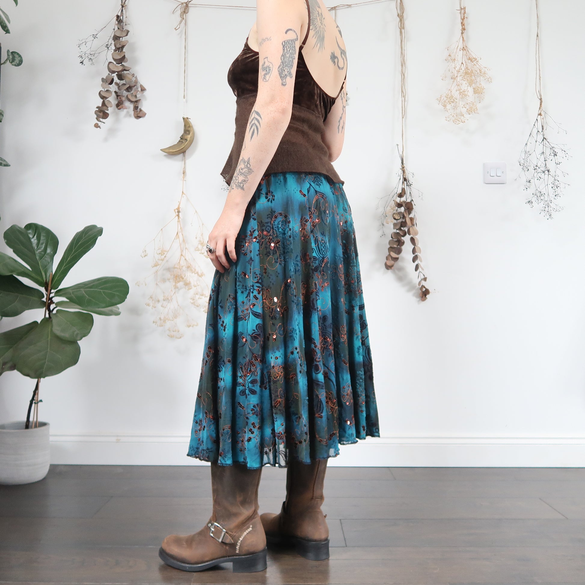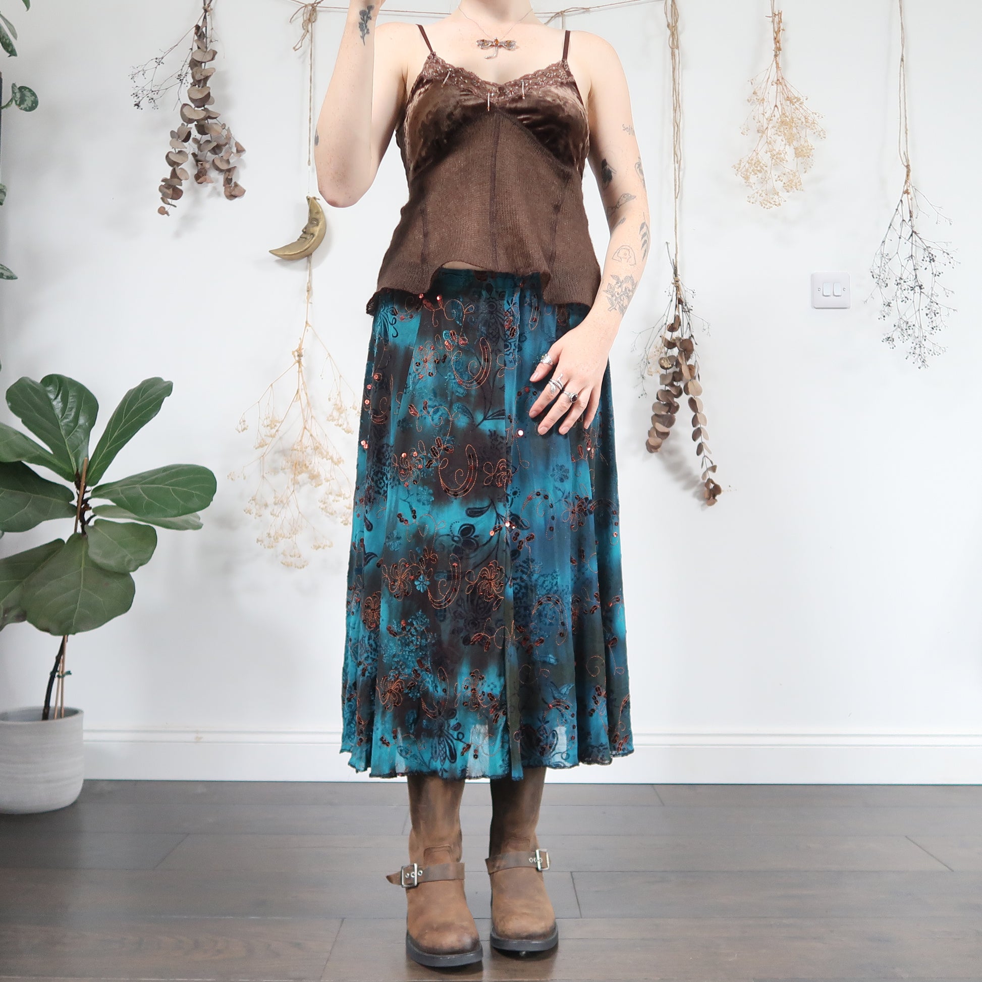 Vintage brown and blue skirt with copper embroidery, sequins and velvet embossing
