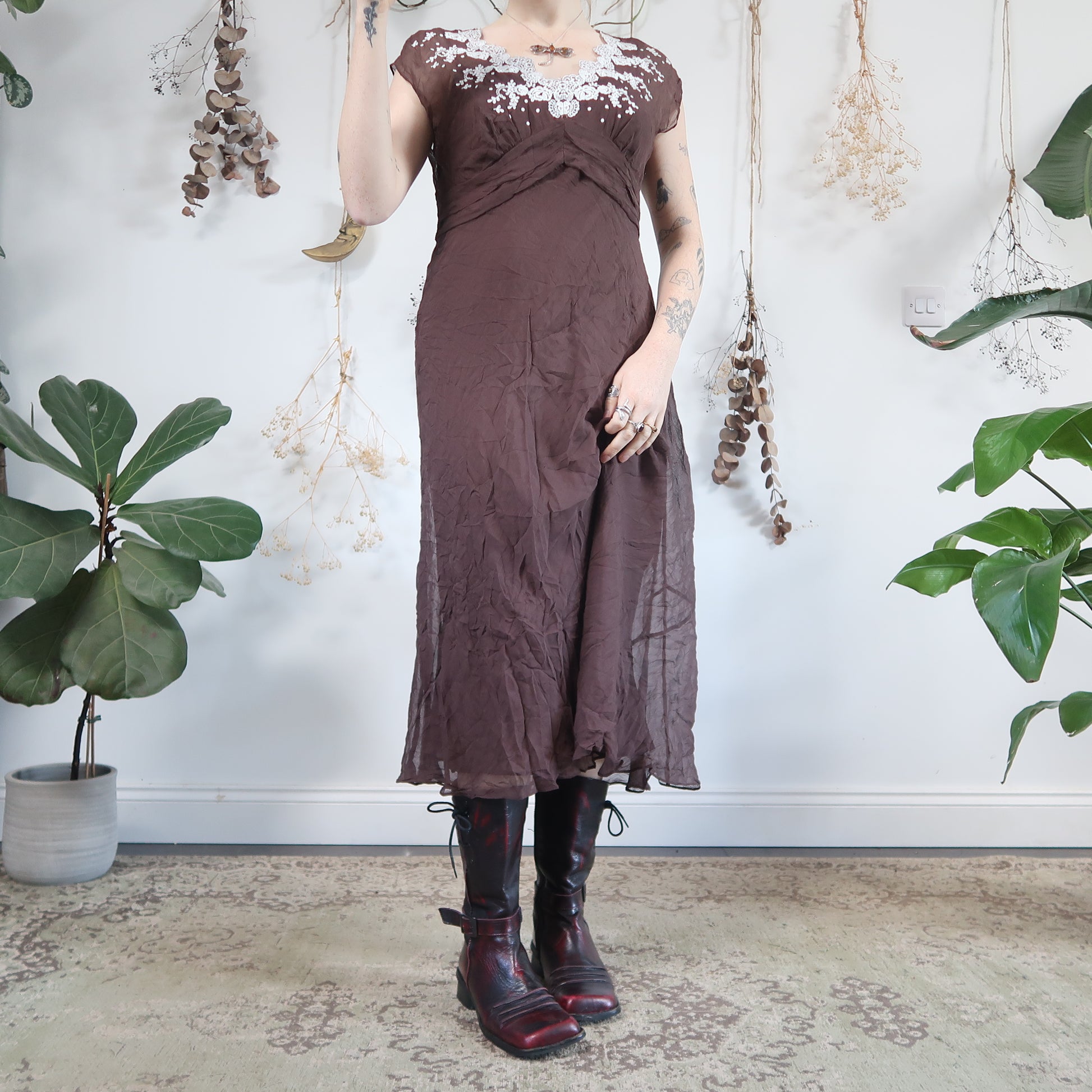 Vintage brown silk midi dress with gorgeous floral embroidered detail