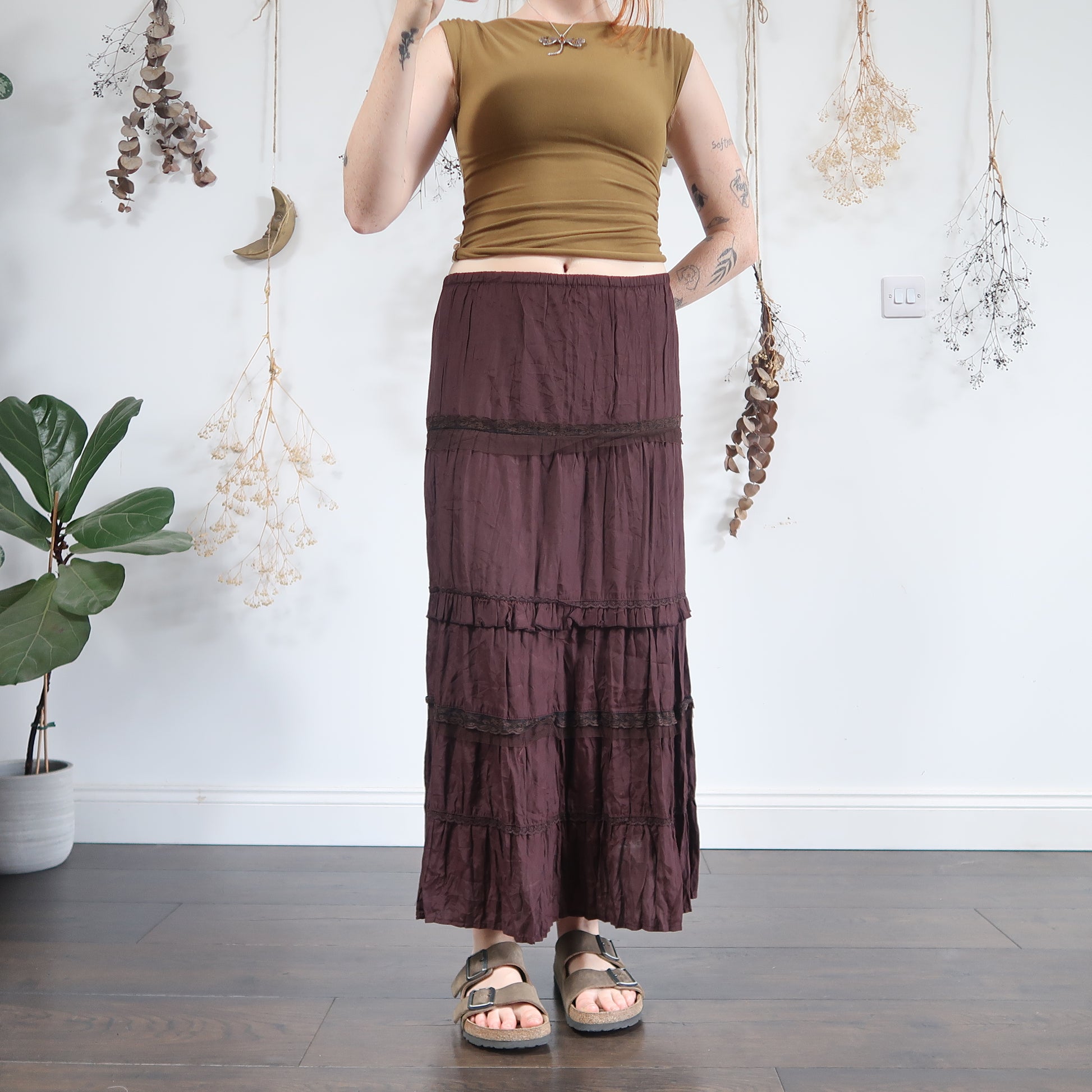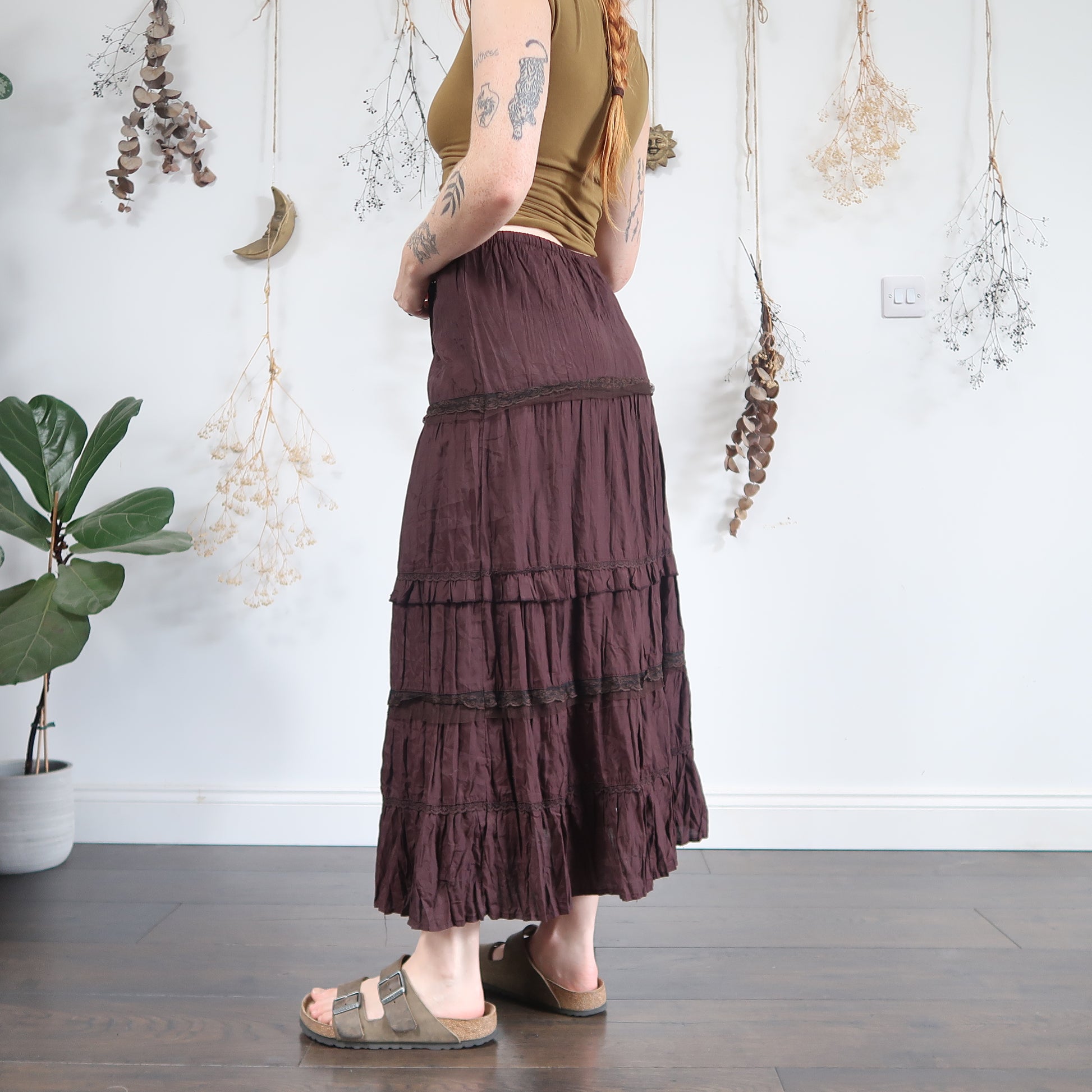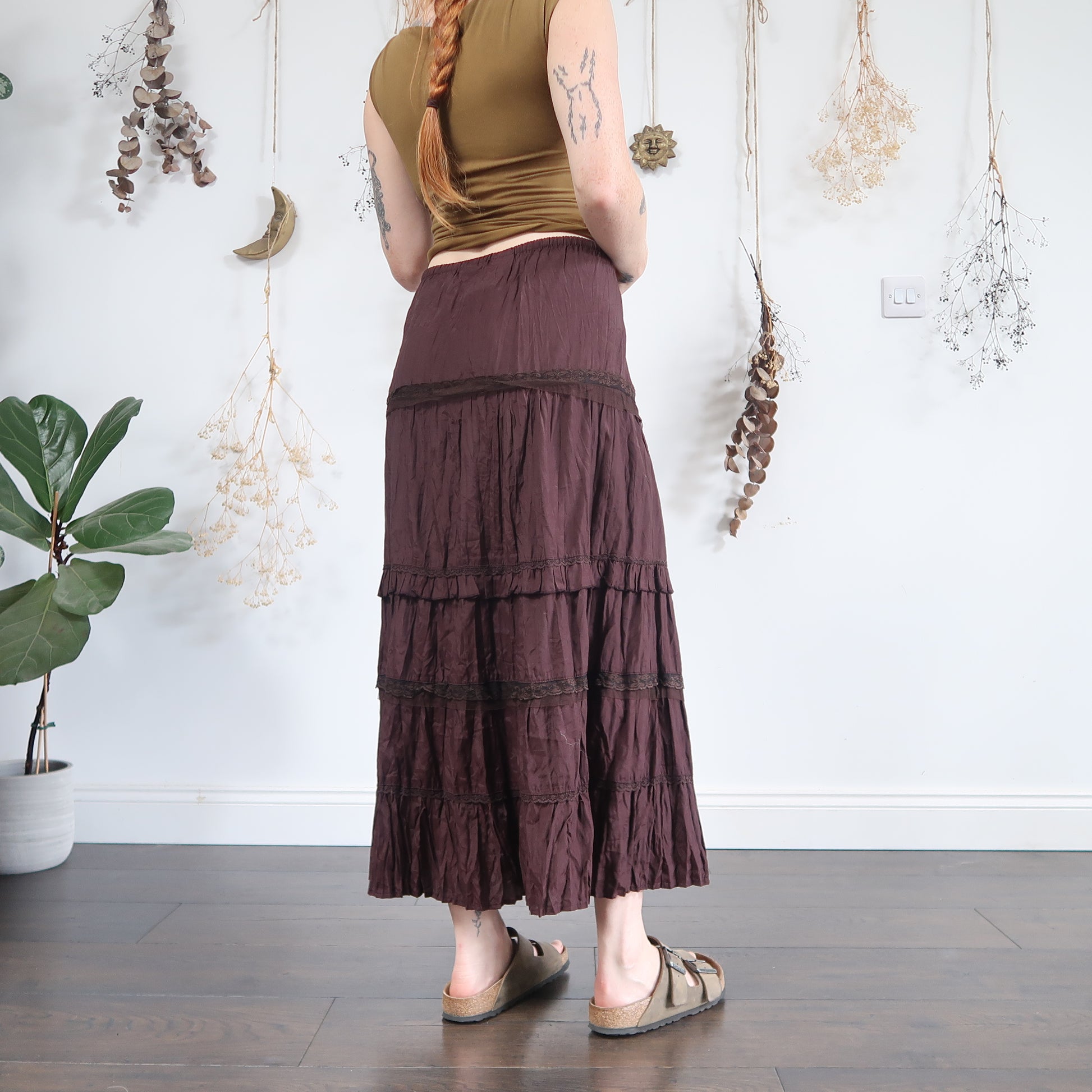 Vintage brown crinkle tiered maxi skirt with lace trims