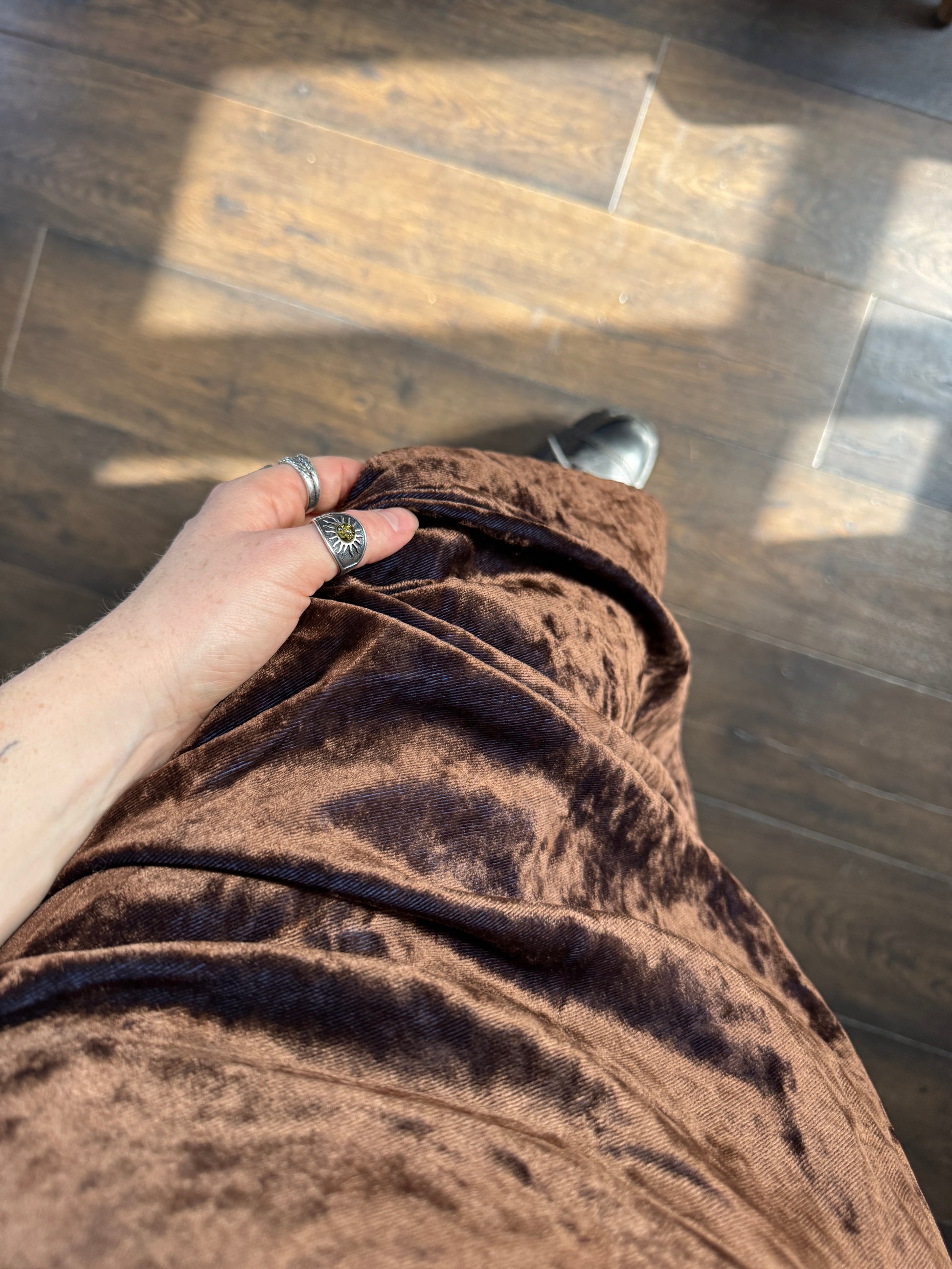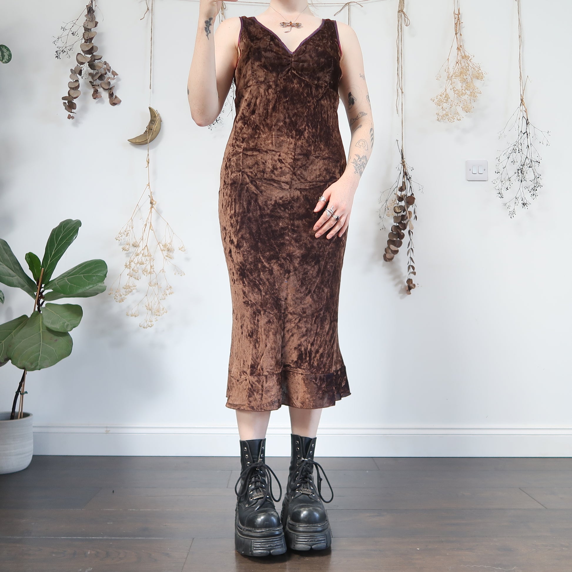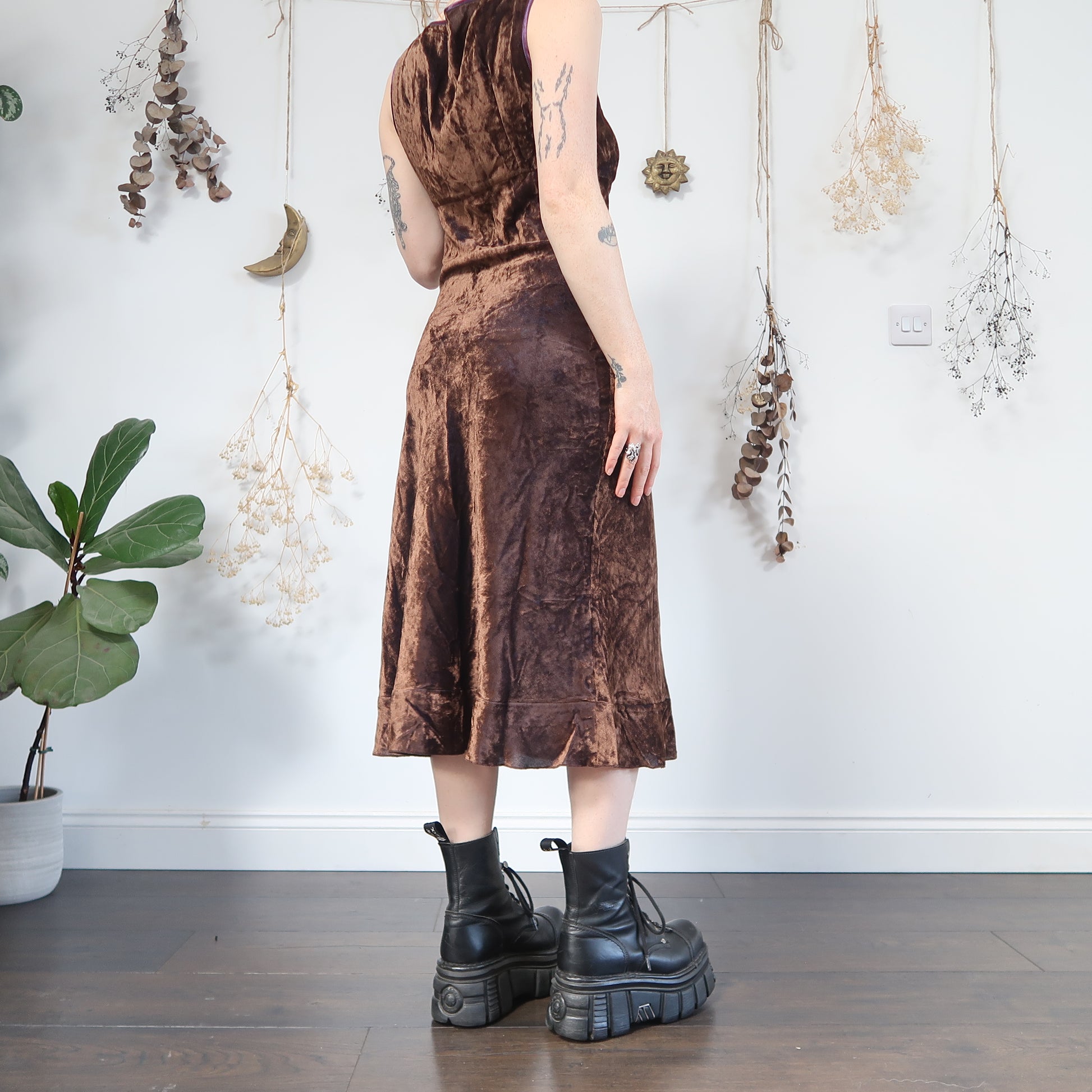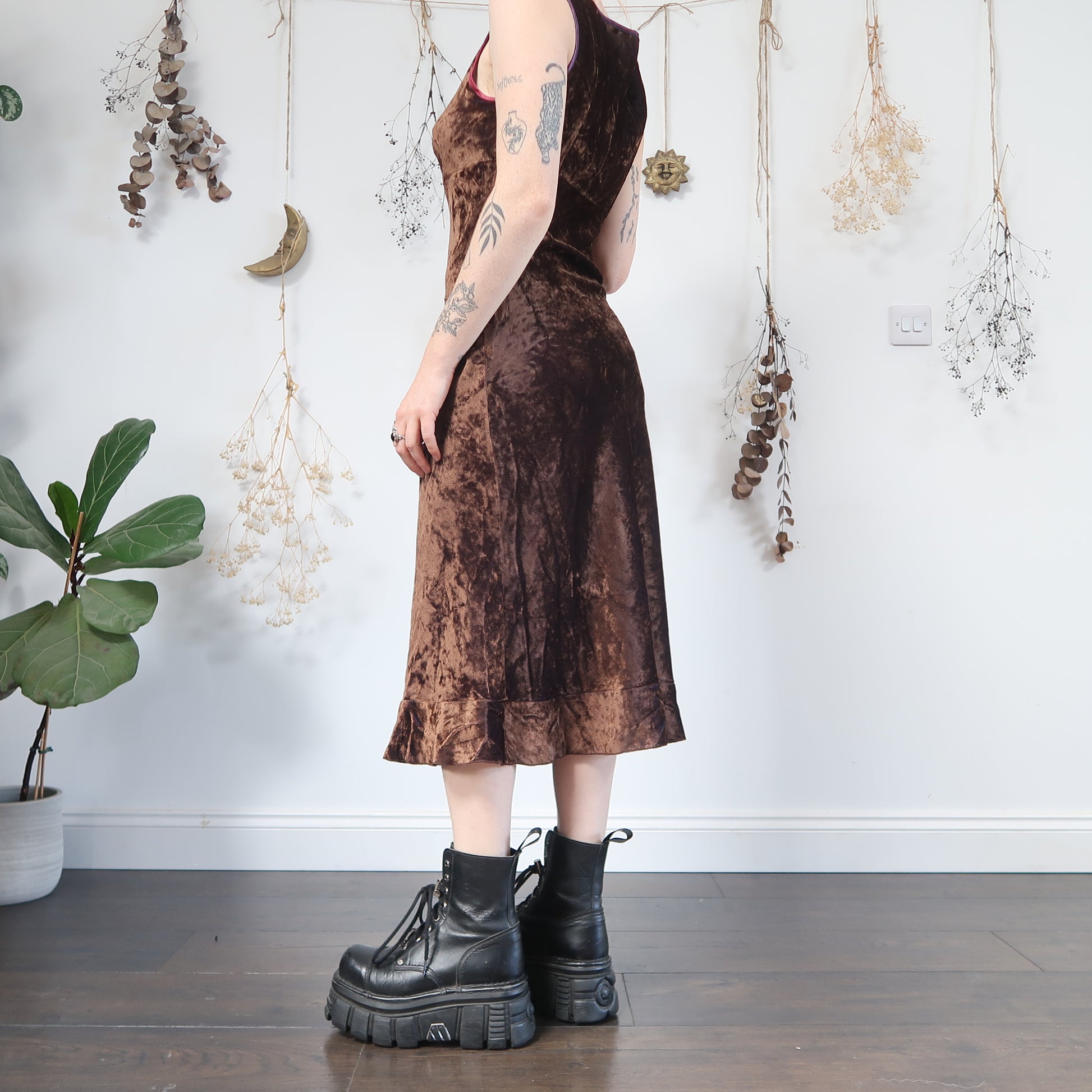 Vintage brown velvet midi dress with a a very subtle blue/purple shift, and a purple trim