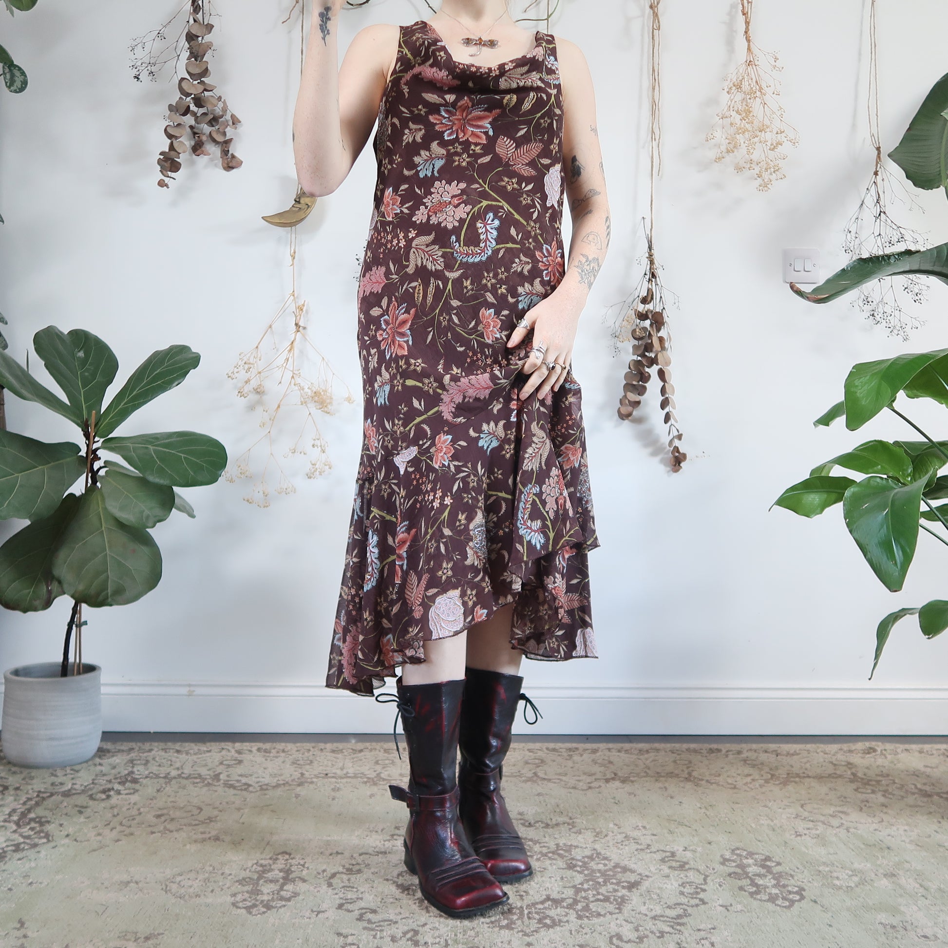 Vintage brown whimsical patterned midi dress with a cowl neck