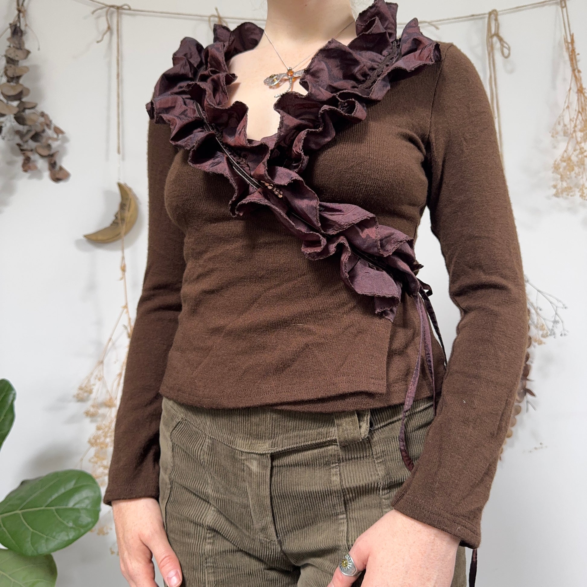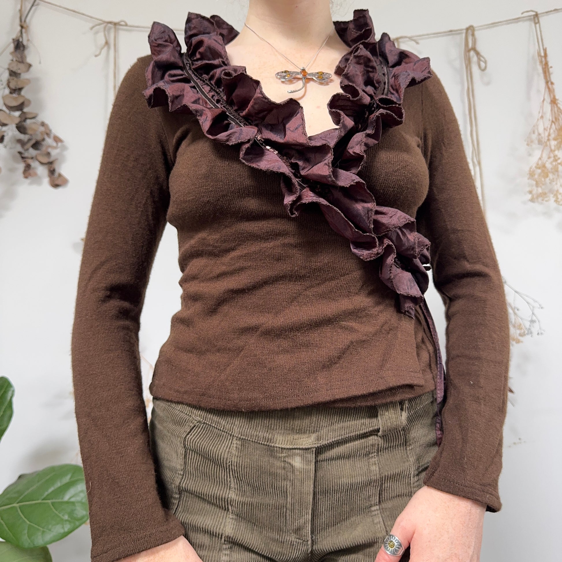 Vintage brown knit wrap top with a purply brown iridescent ruffle trim