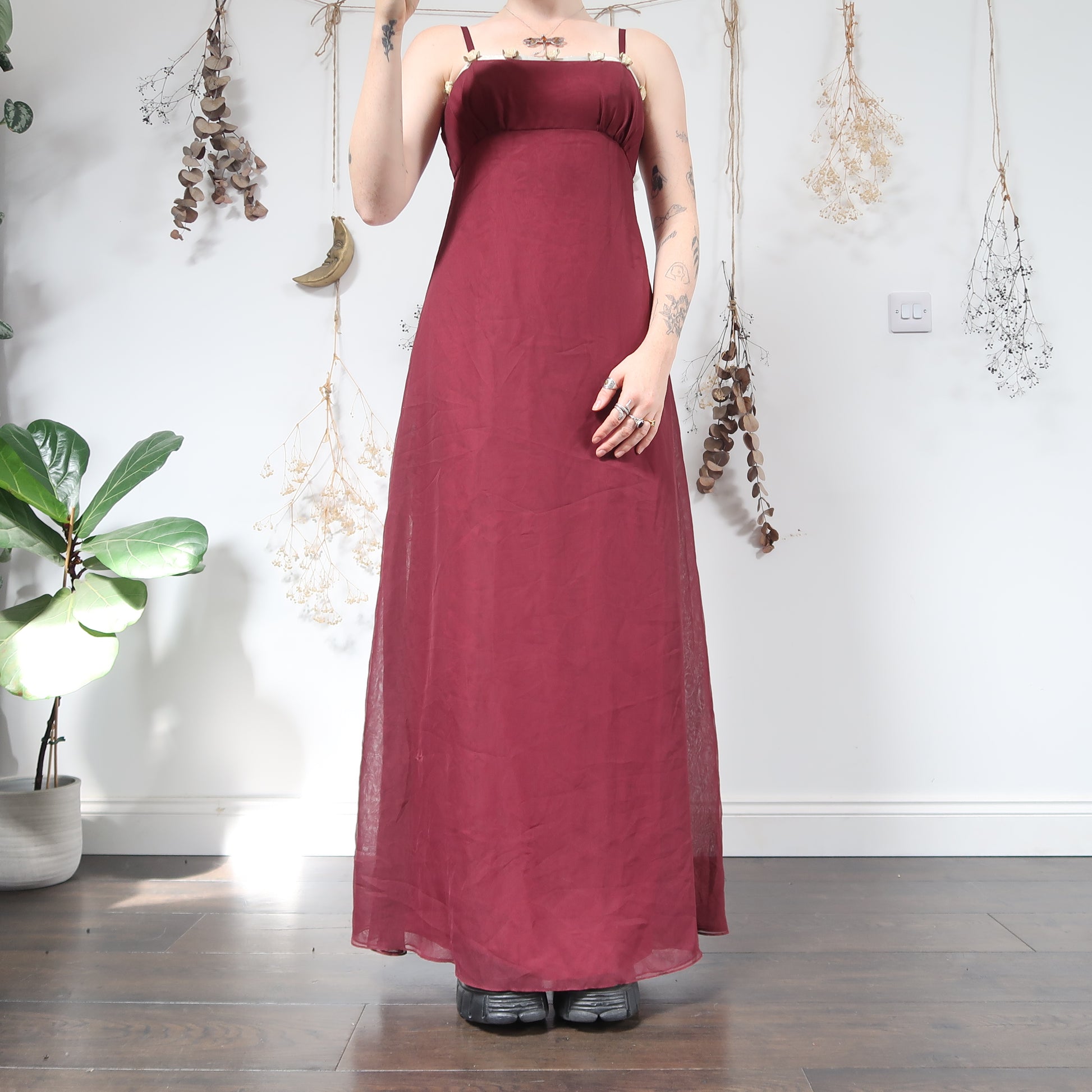 Vintage burgundy special occassion dress with ribbon rosettes and a bow at the back