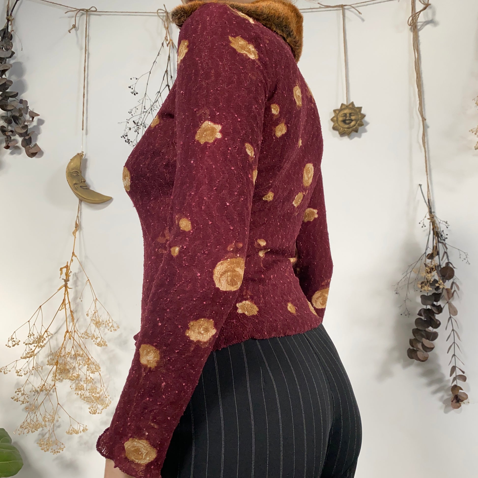 Vintage burgundy mesh floral top with a faux fur collar and 1/4 zip