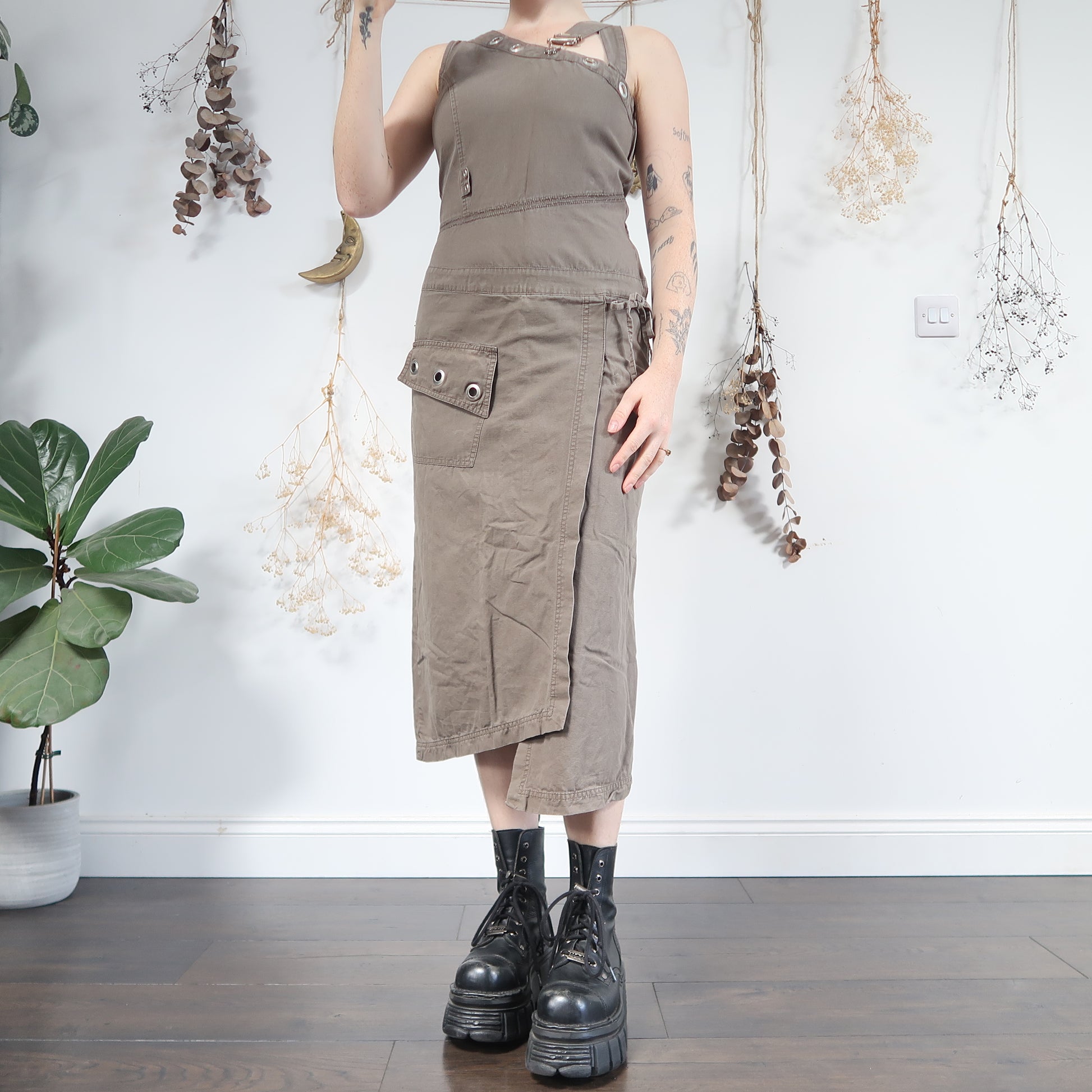Vintage neutral asymmetric cargo dress with grommet hole details