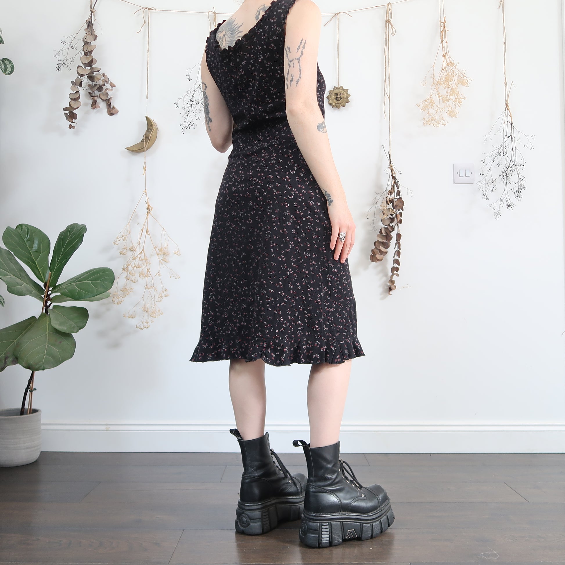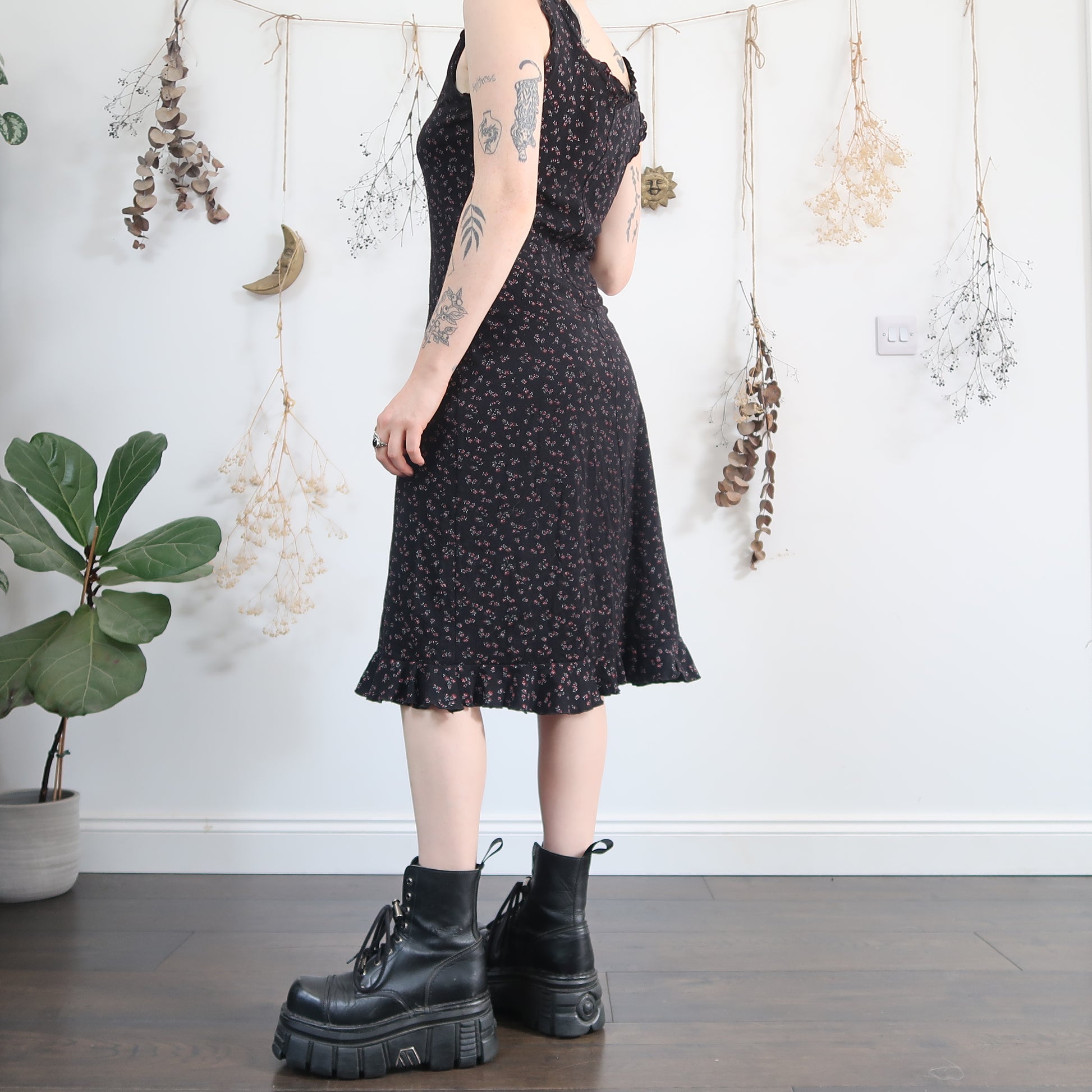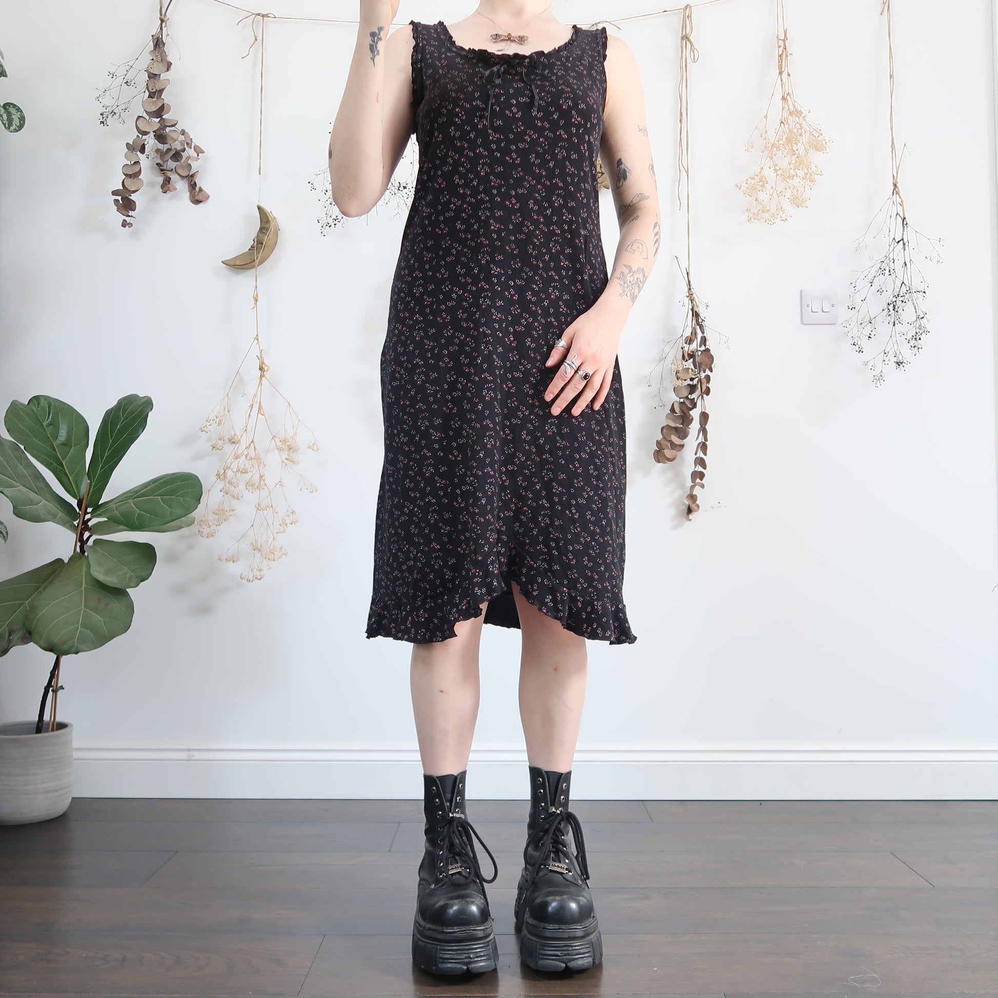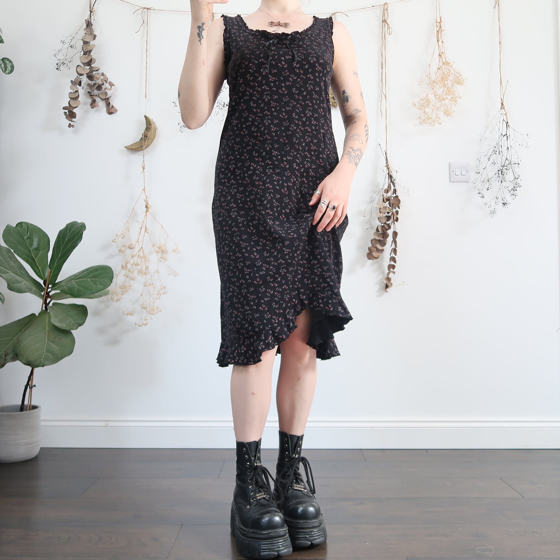 Vintage black ditsy floral print mesh midi dress with a ribbon tie at the bust