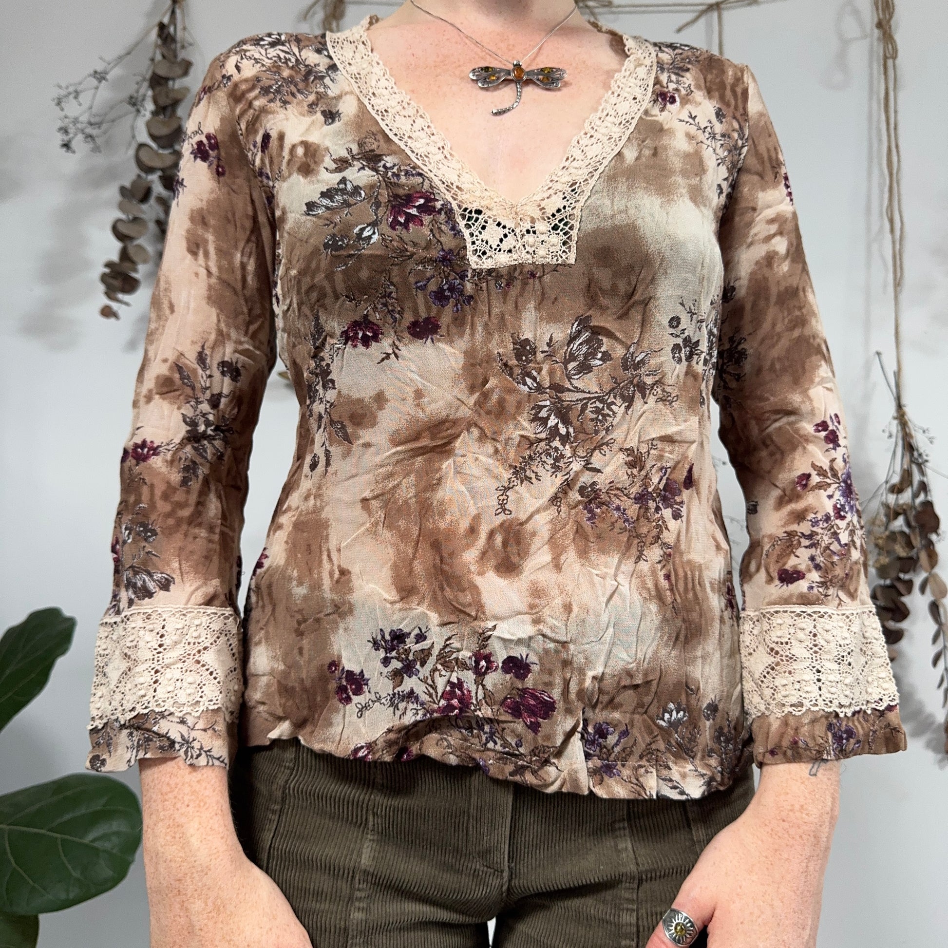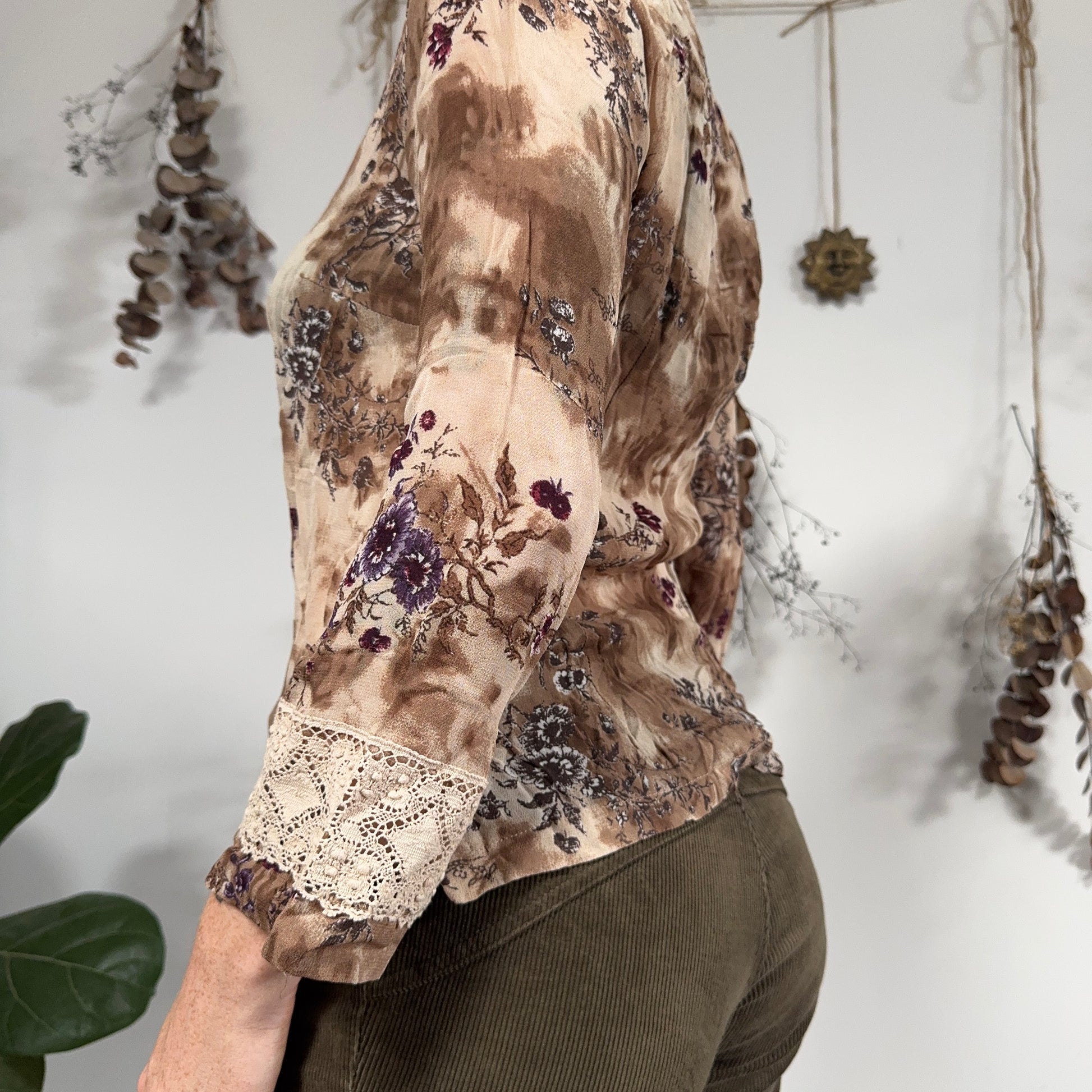 Vintage earthy whimsical blouse with cream lace trims