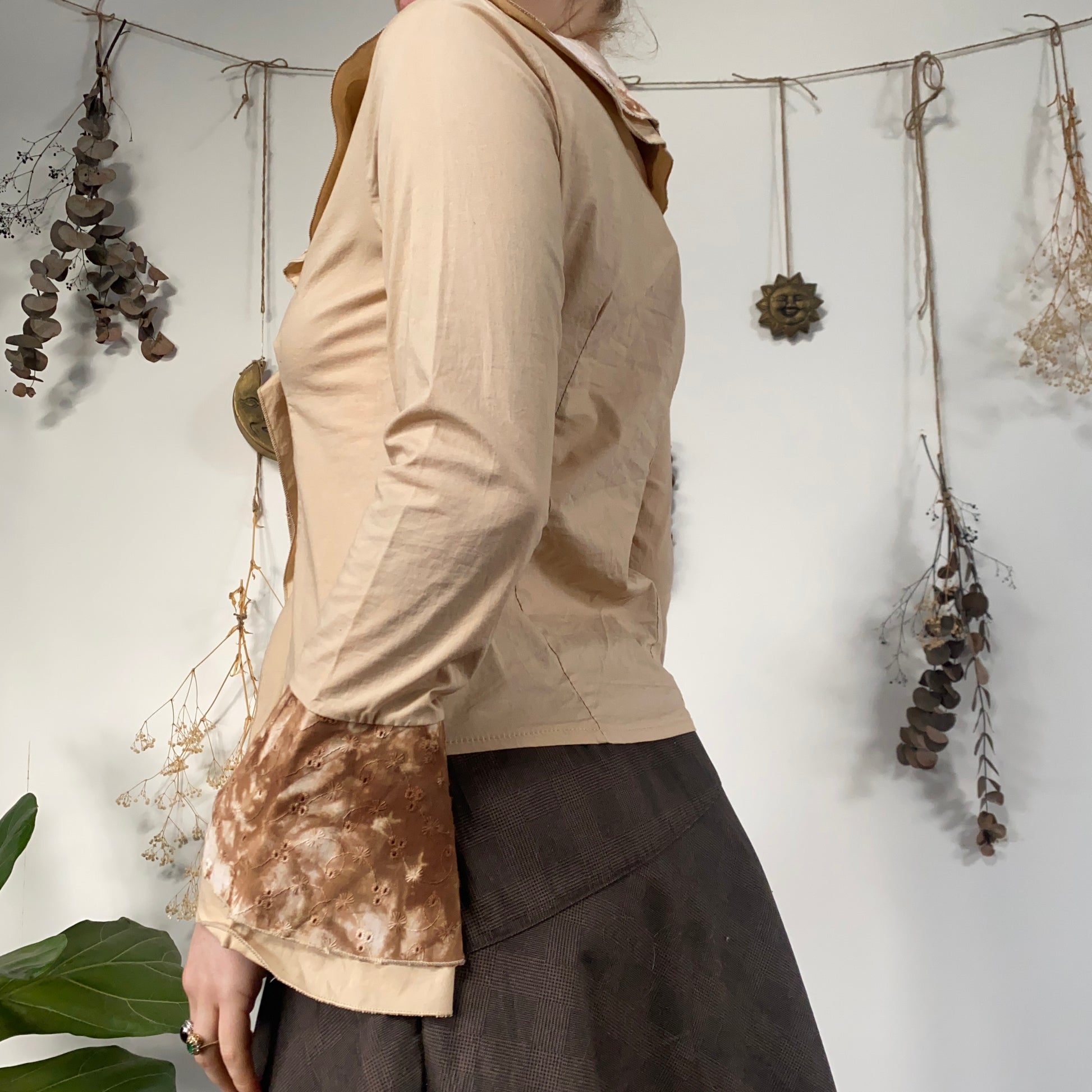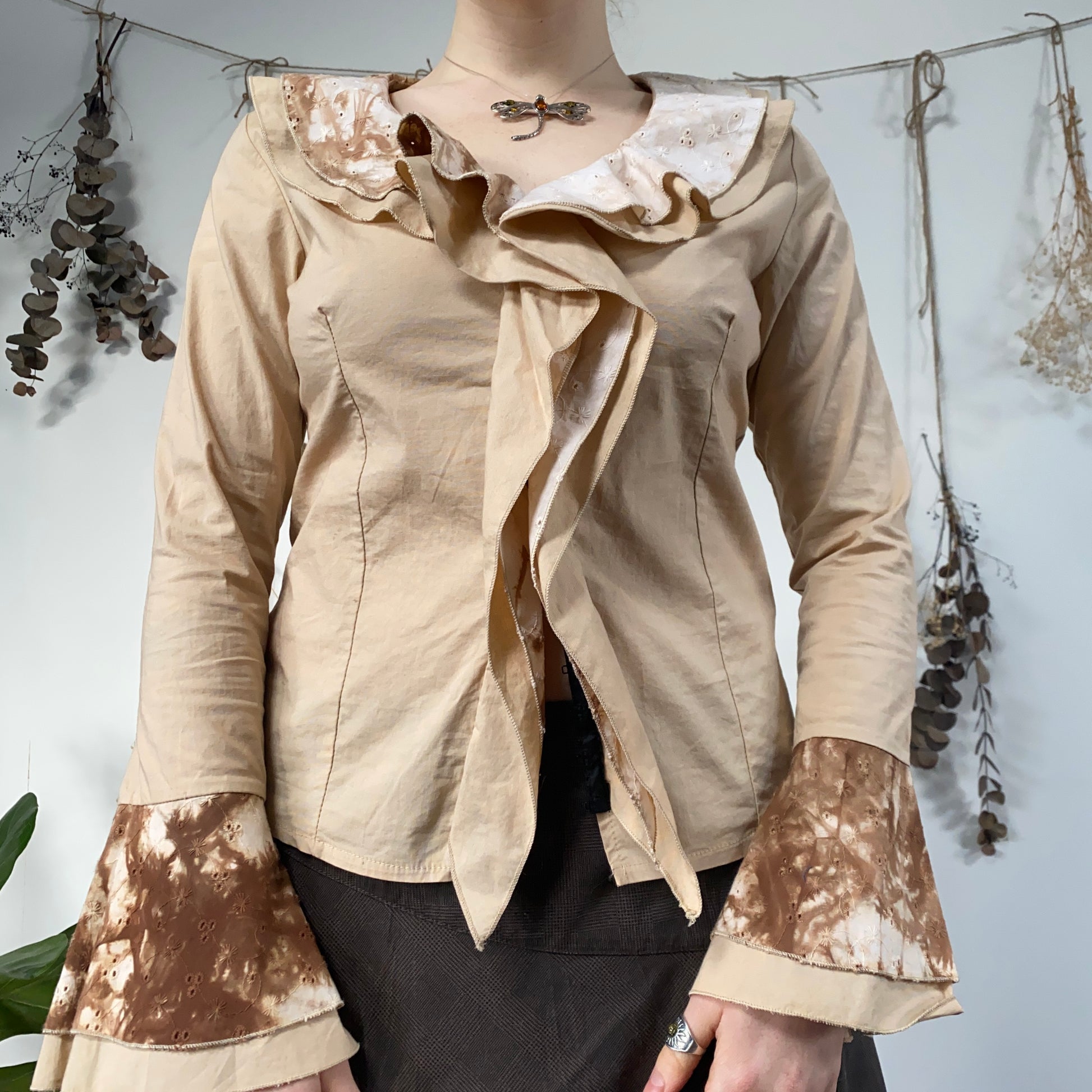 Vintage earthy hook and eye shirt with flared sleeves and ruffle detail