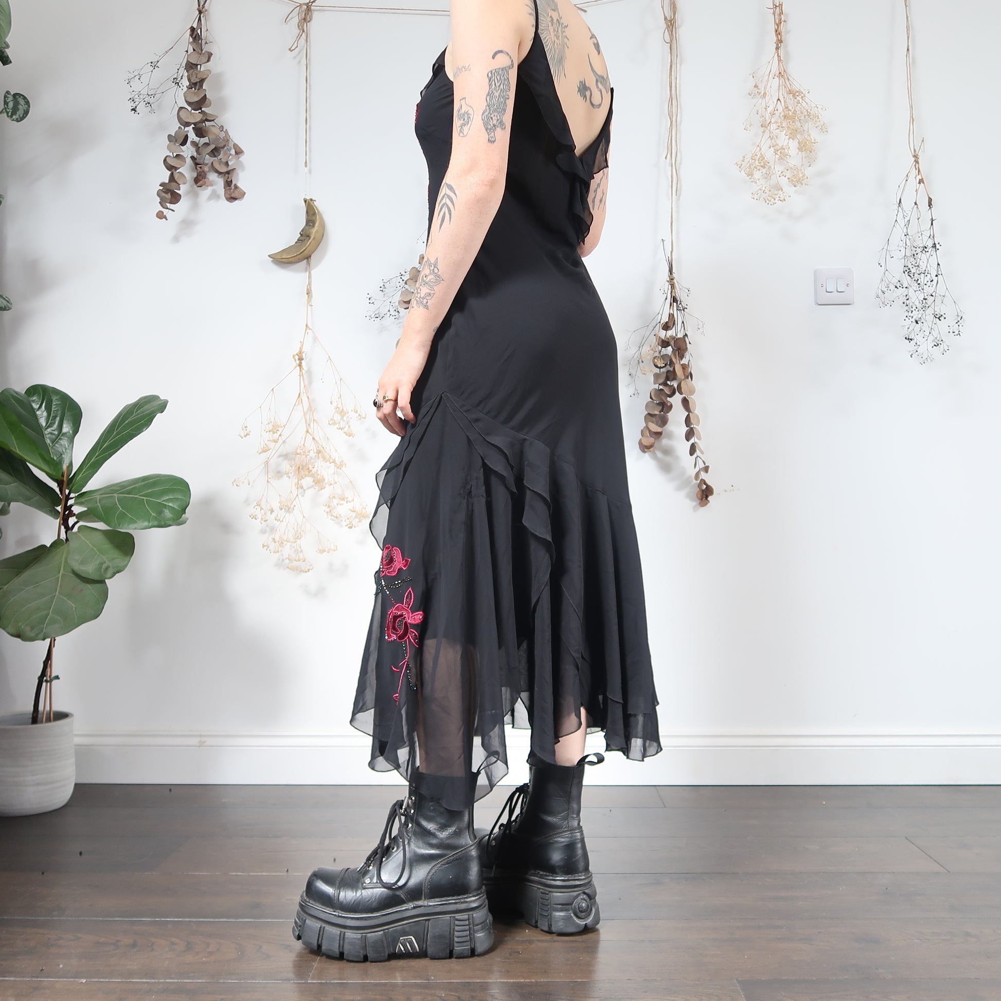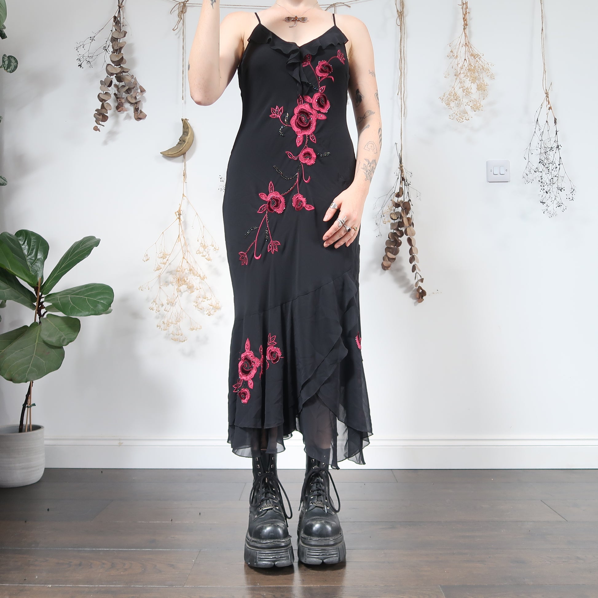 Vintage black flowy dress with gorgeous pink floral embroidery and beading