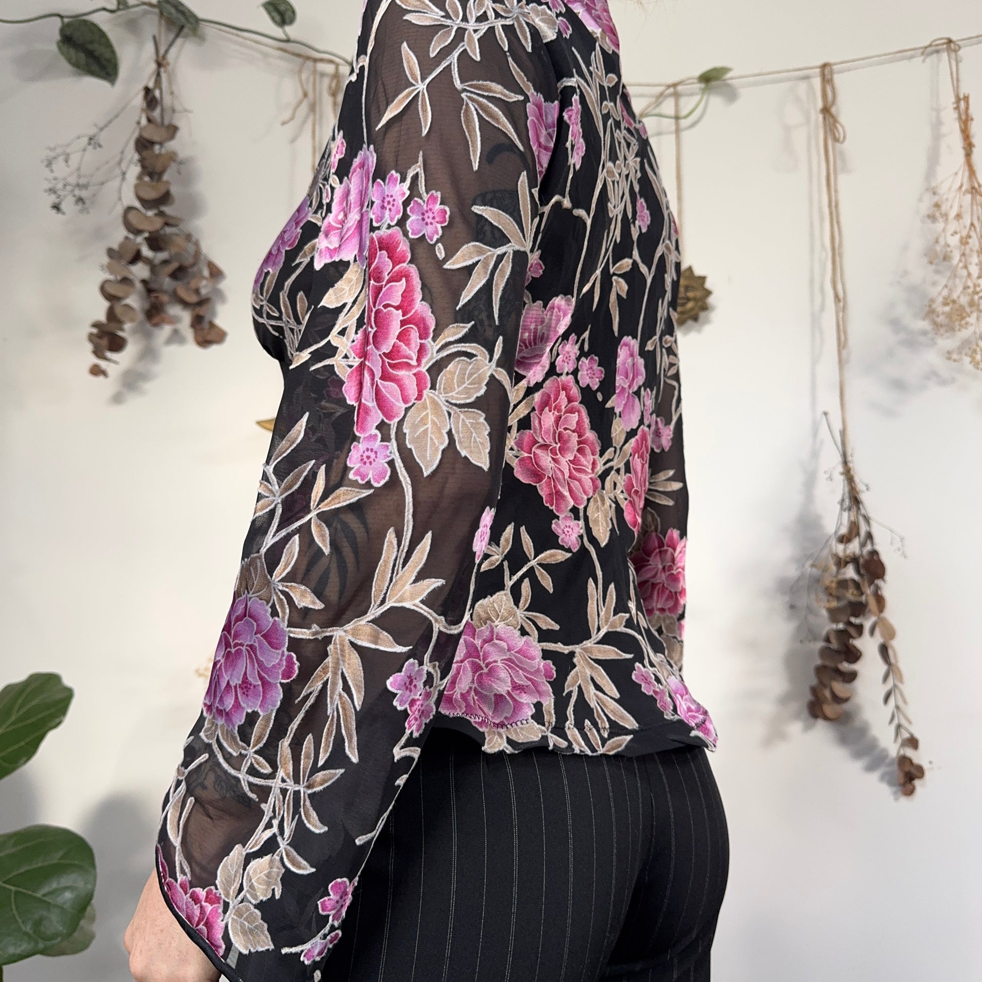 Vintage black blouse with a pink/purple floral devore pattern and sheer flared sleeves