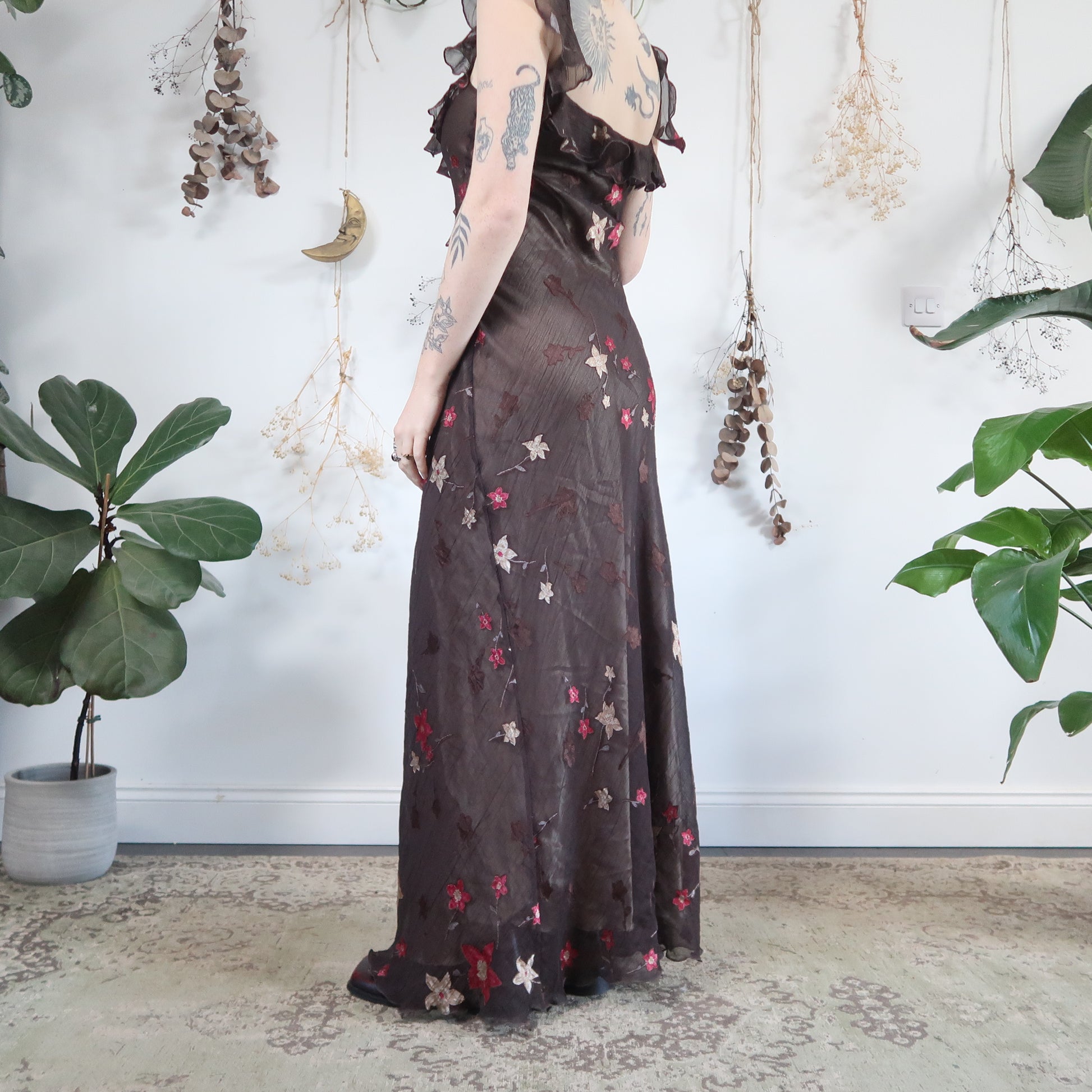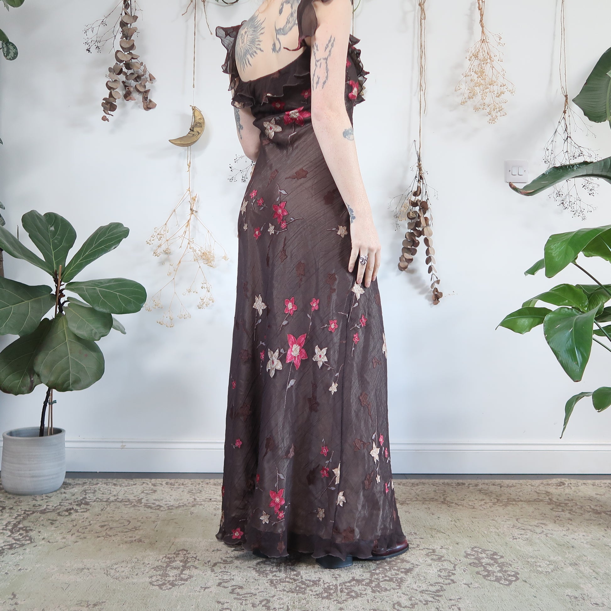 Vintage brown floral occassion dress with a ruffled neckline