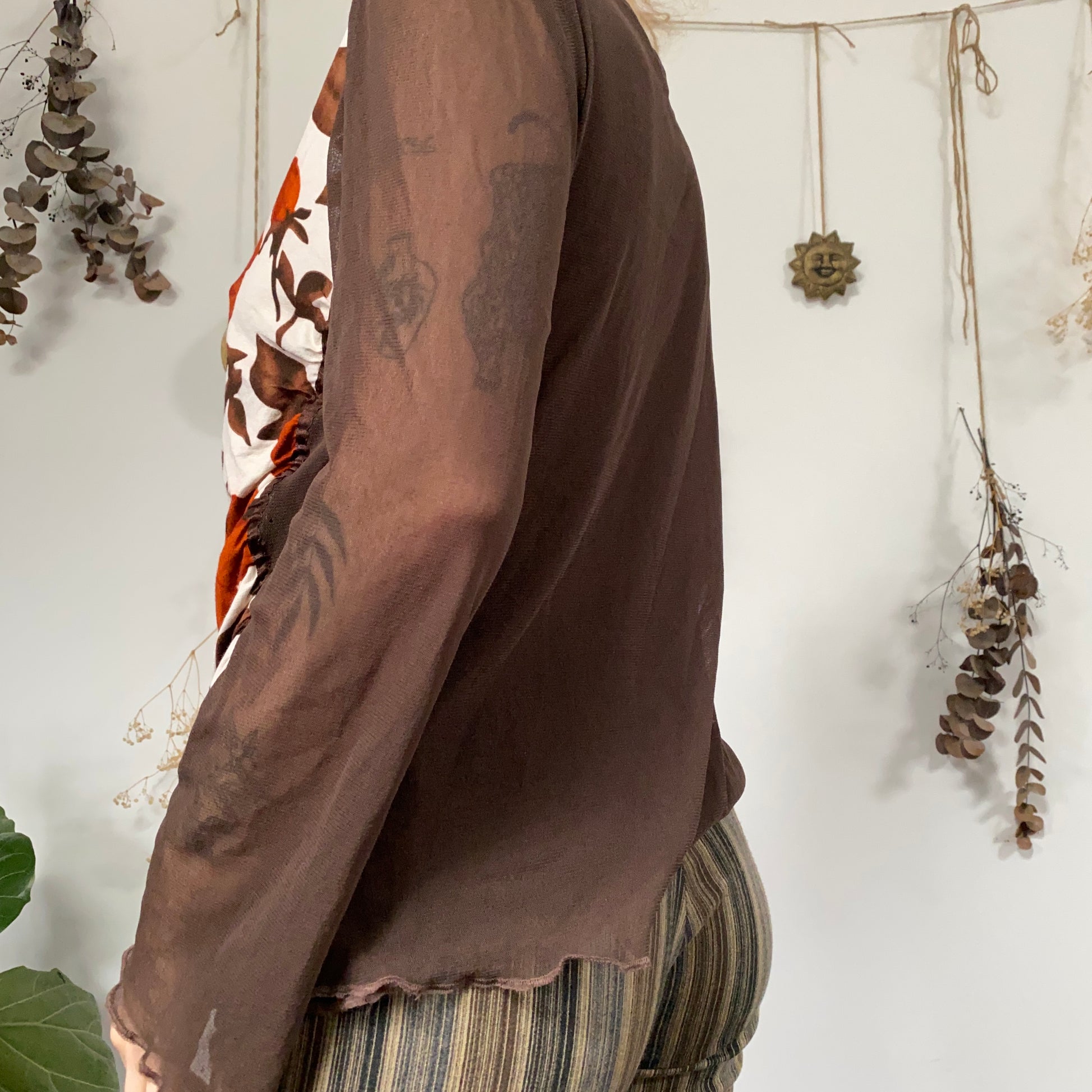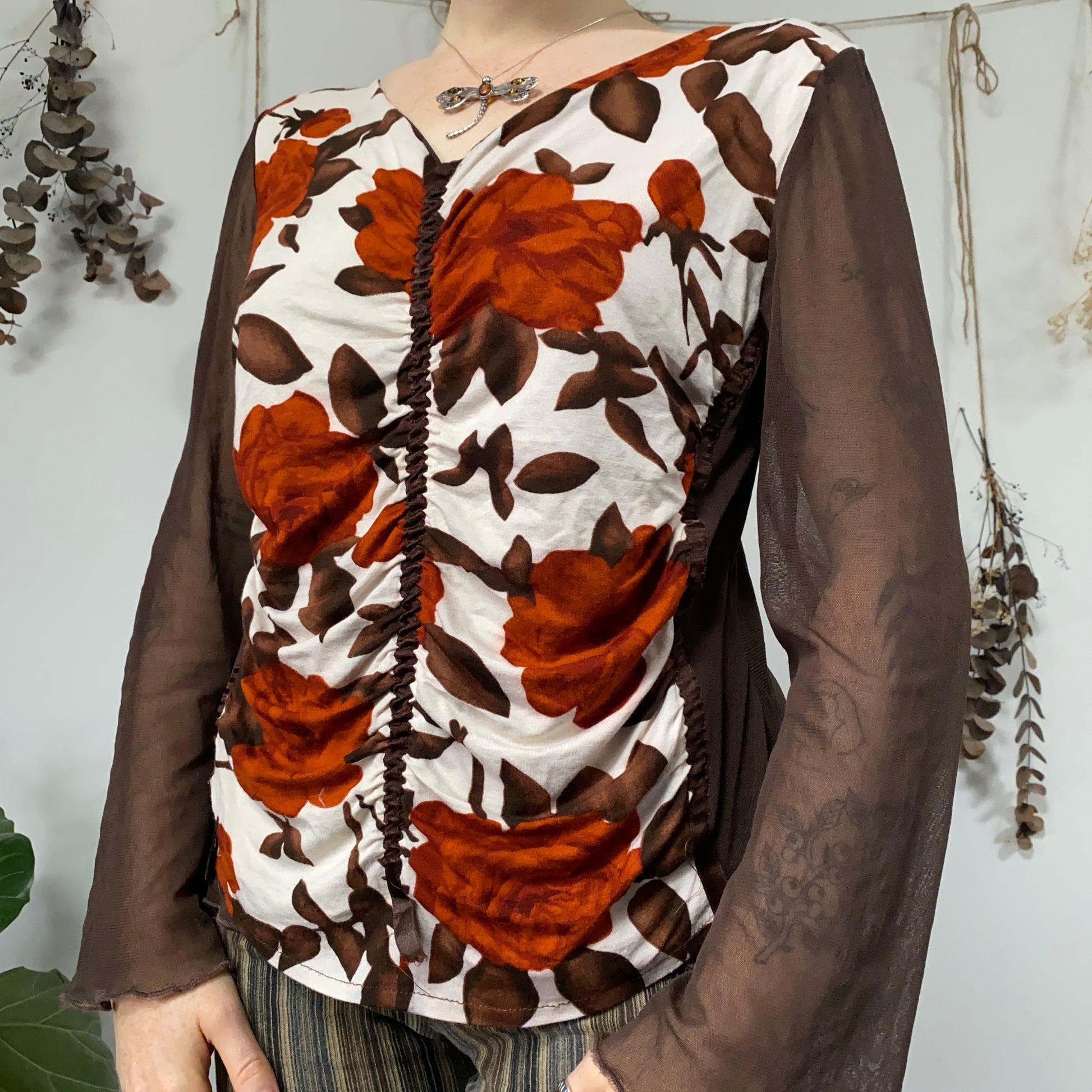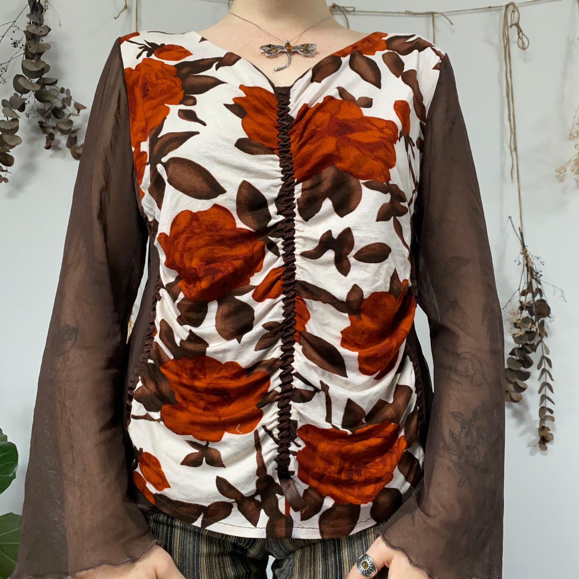 Vintage brown orange floral top with sheer brown mesh flared sleeves