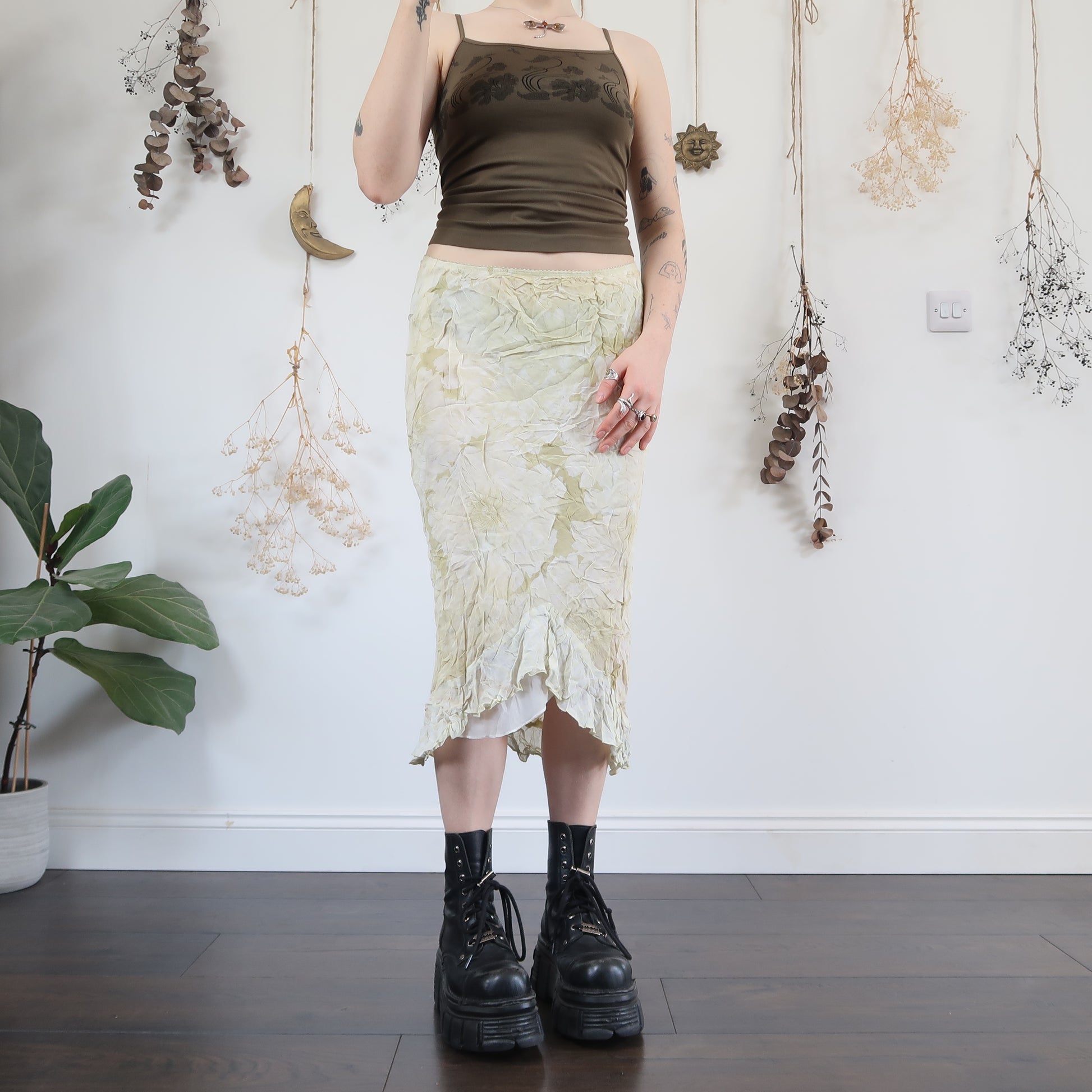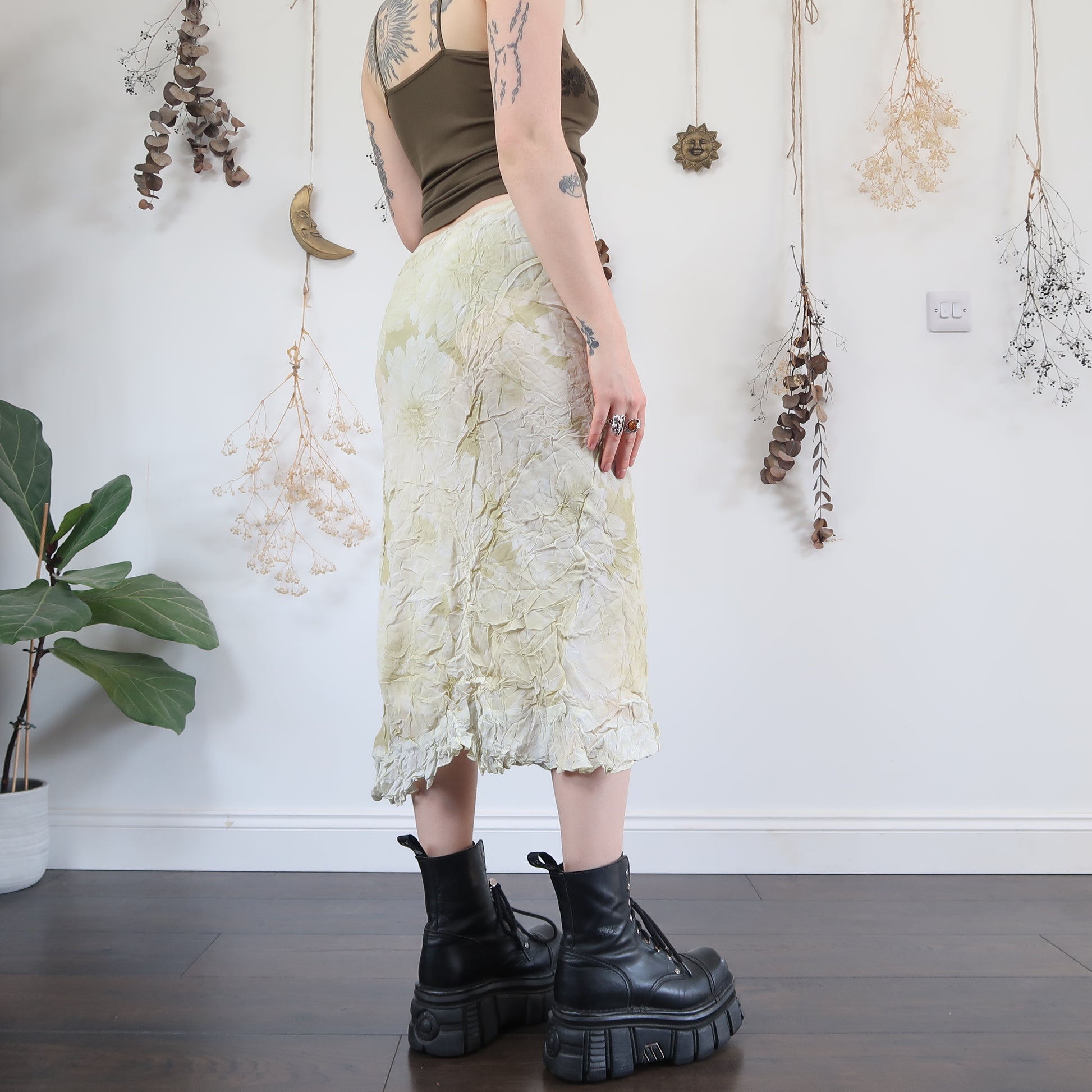 Vintage pale green floral midi skirt with a picot trim
