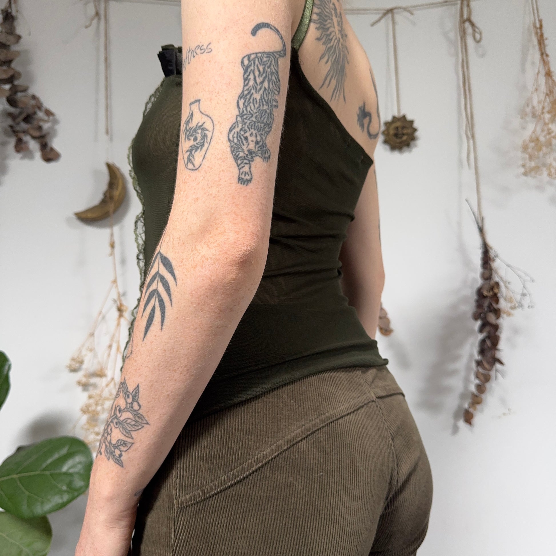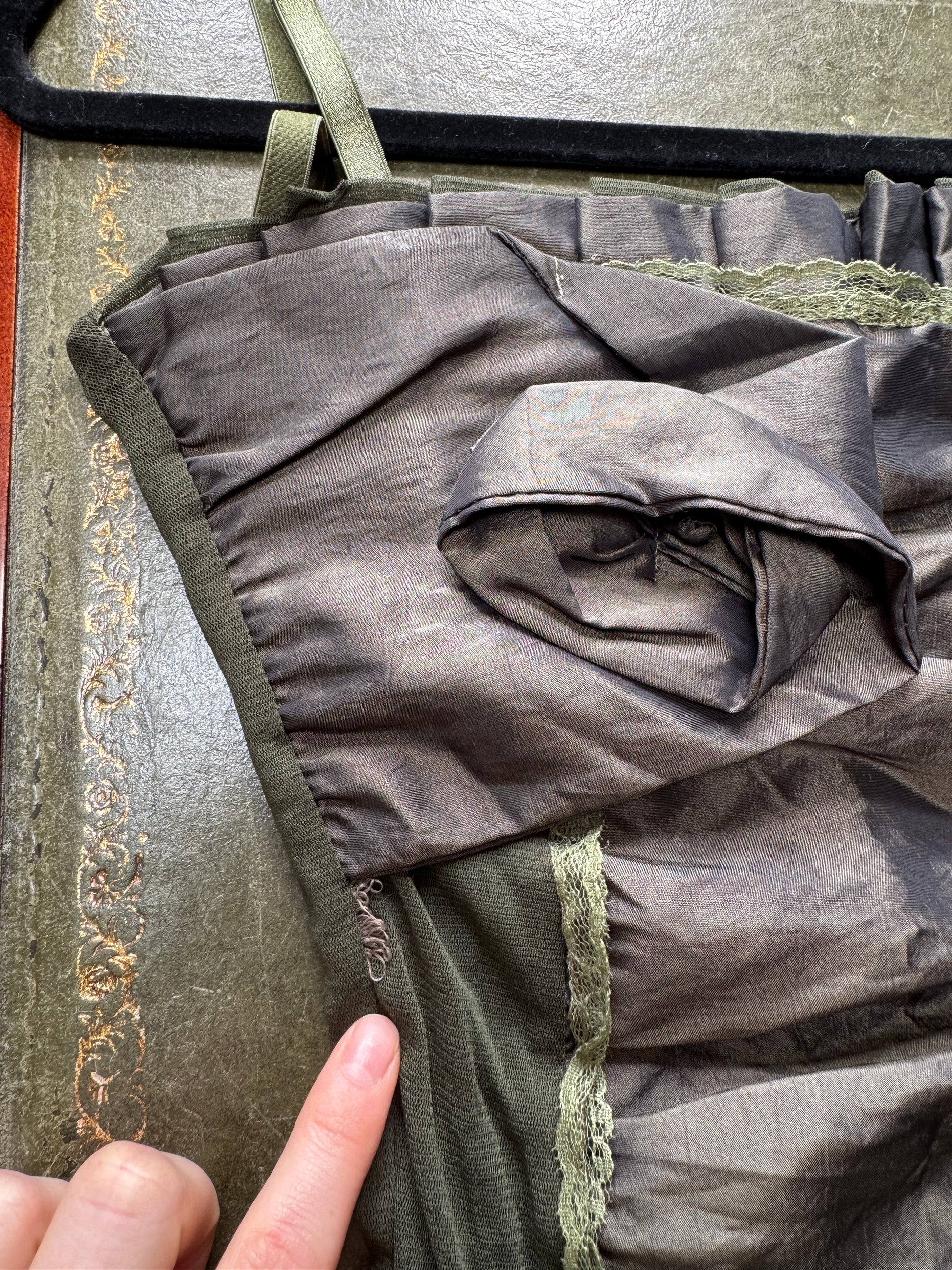 Vintage green iridescent ruffle cami with lace trim and a mesh back