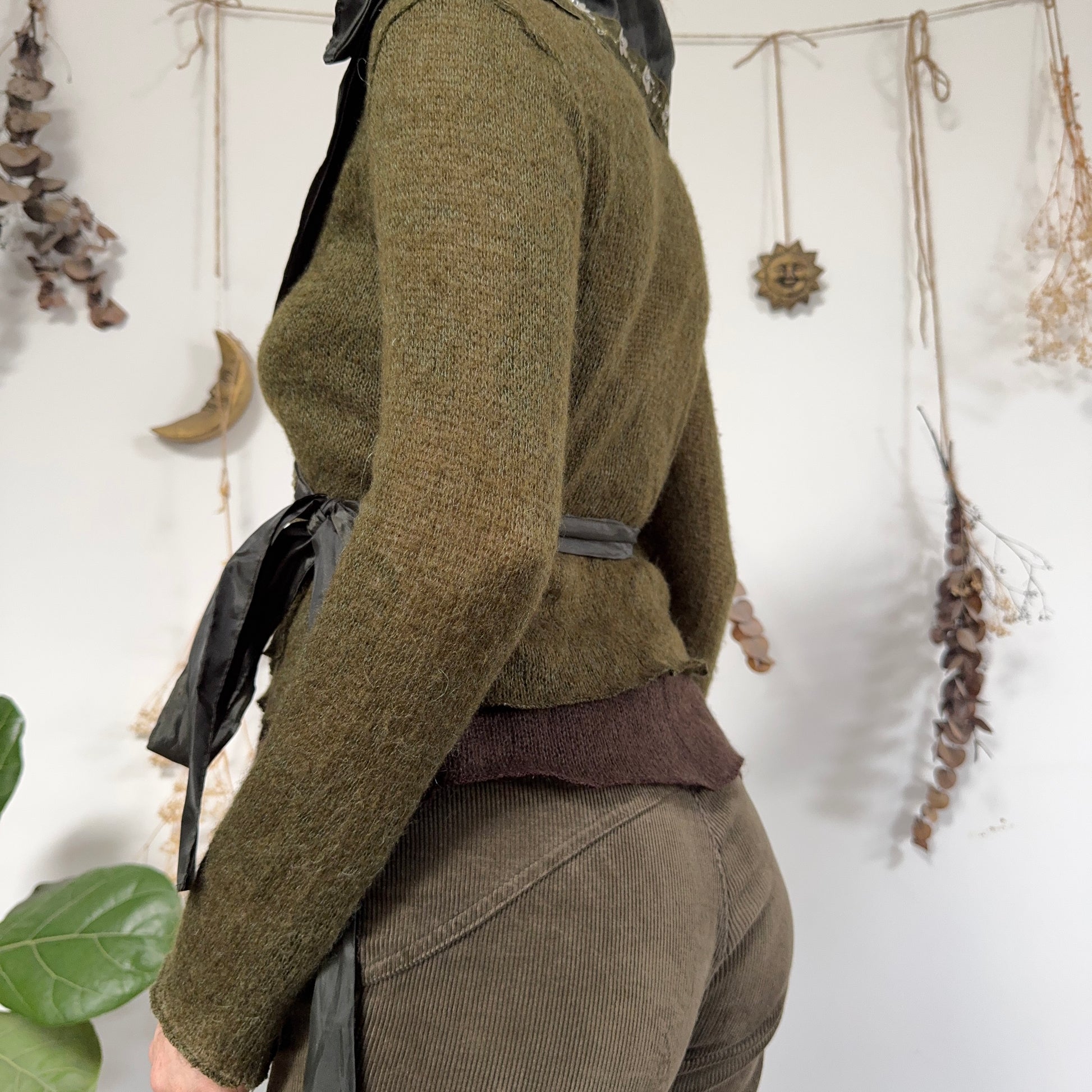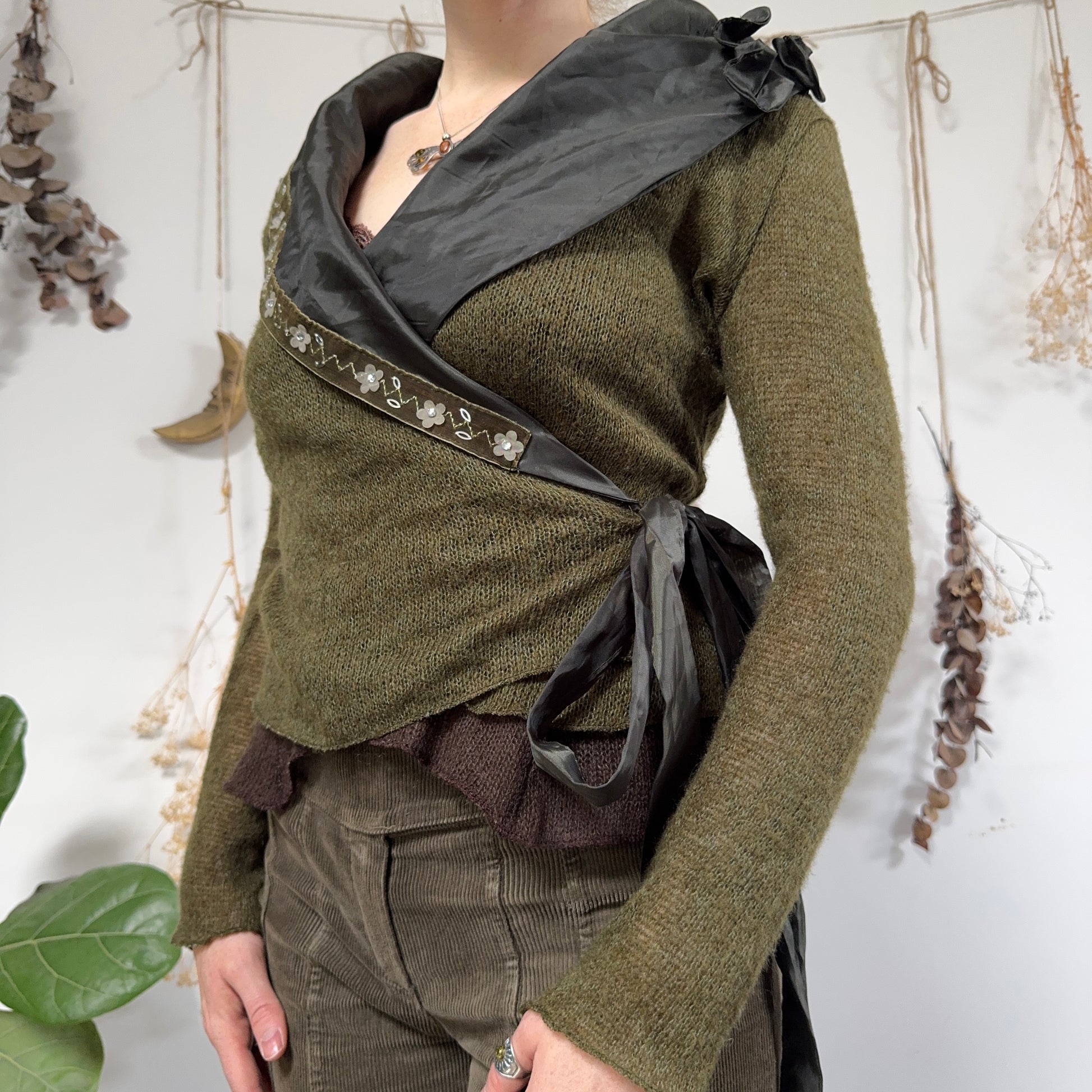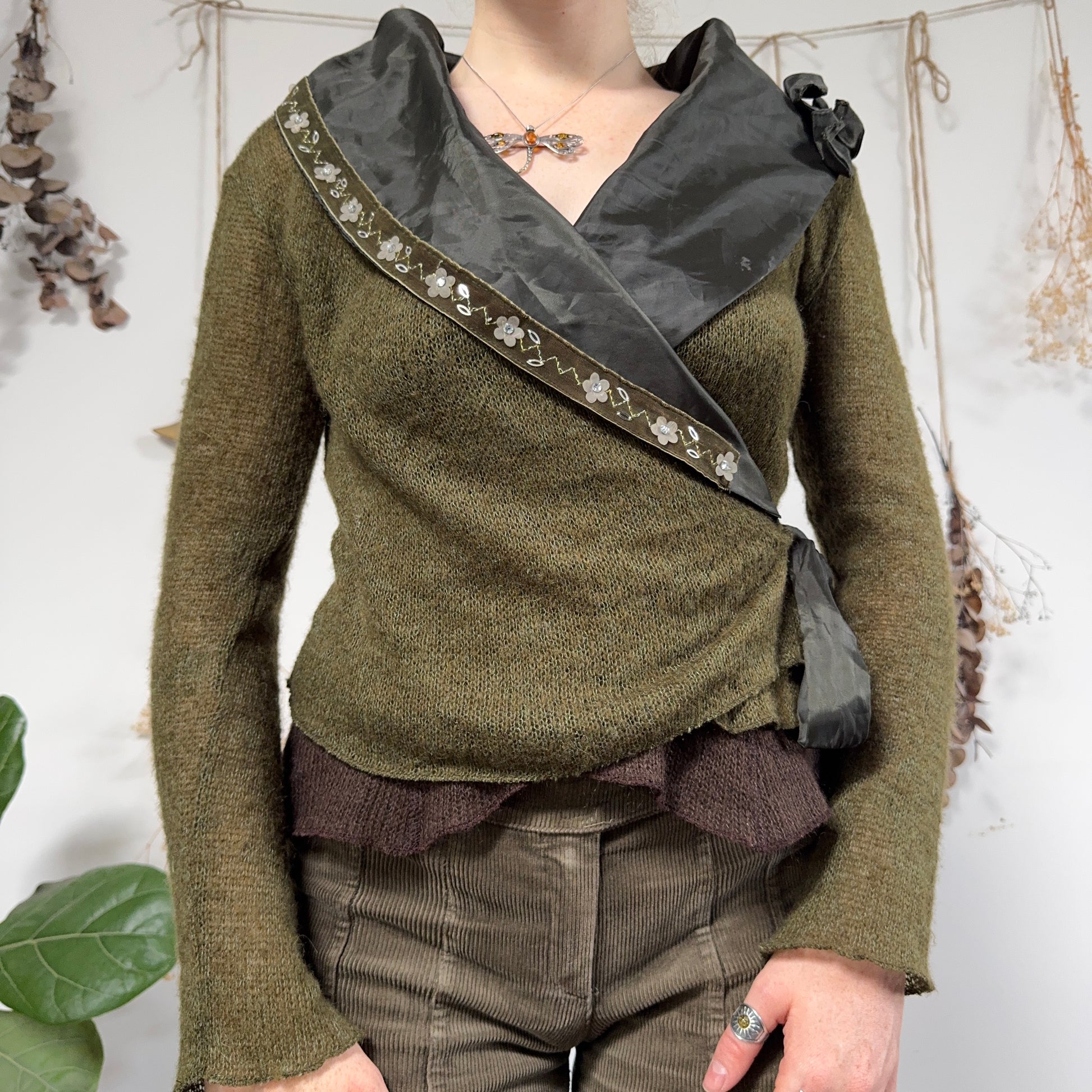 Vintage green knit wrap top with iridescent taffeta and a velvet trim with floral detail