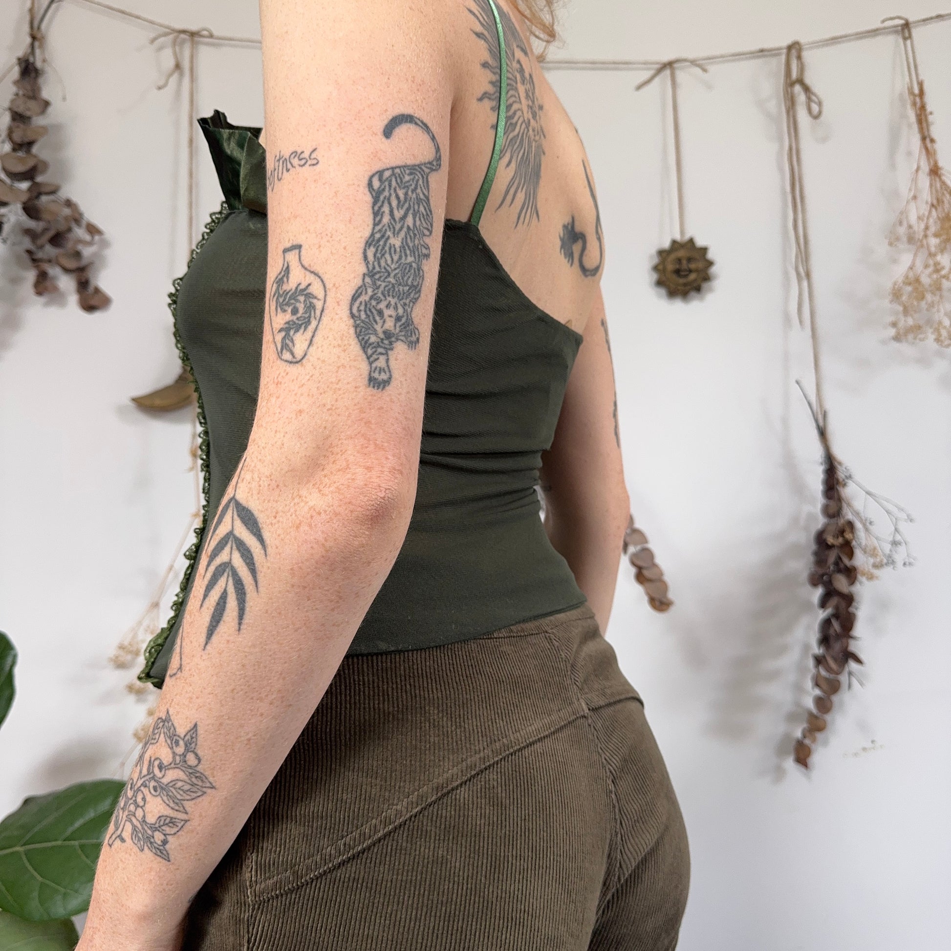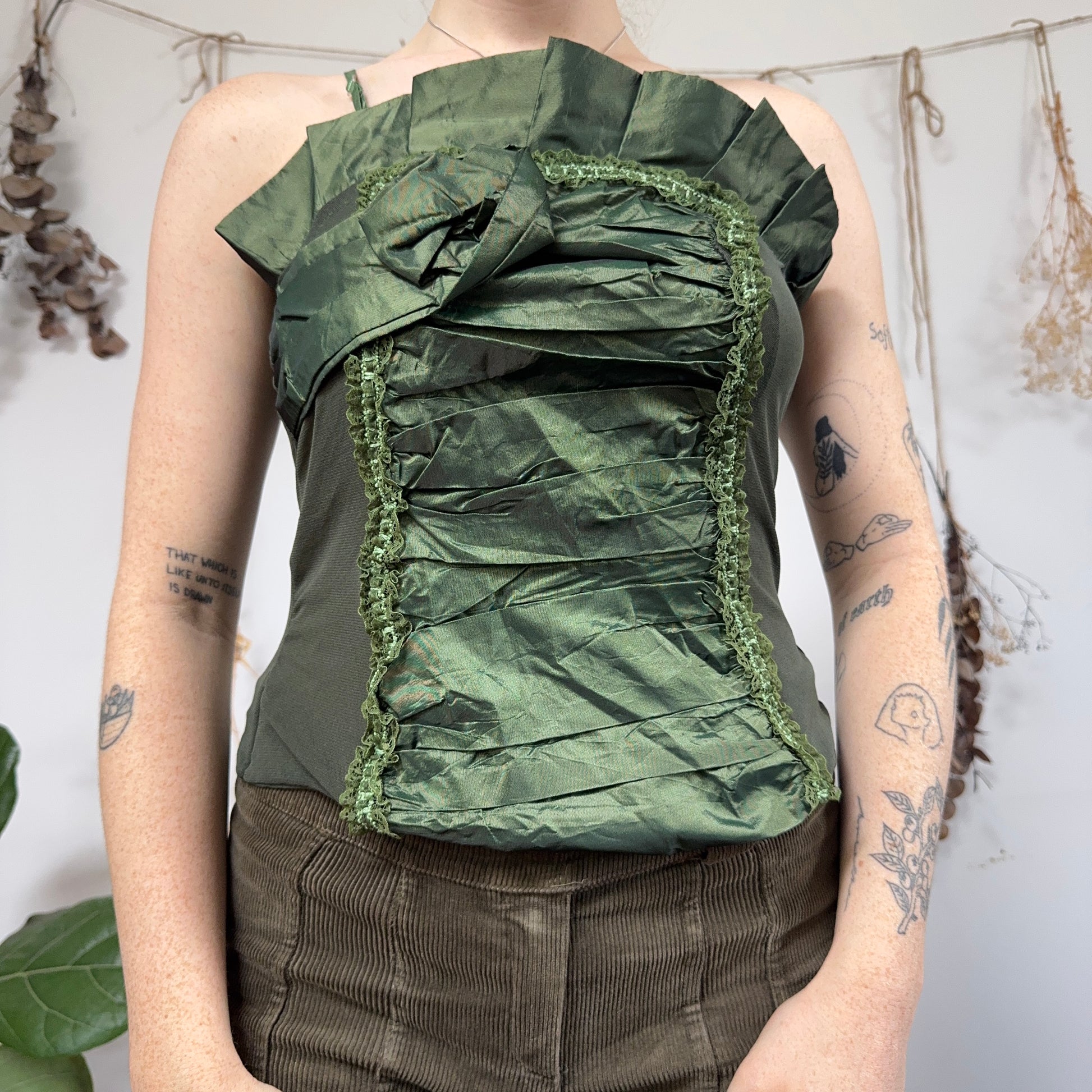 Vintage iridescent green ruffle cami with a stretchy mesh back