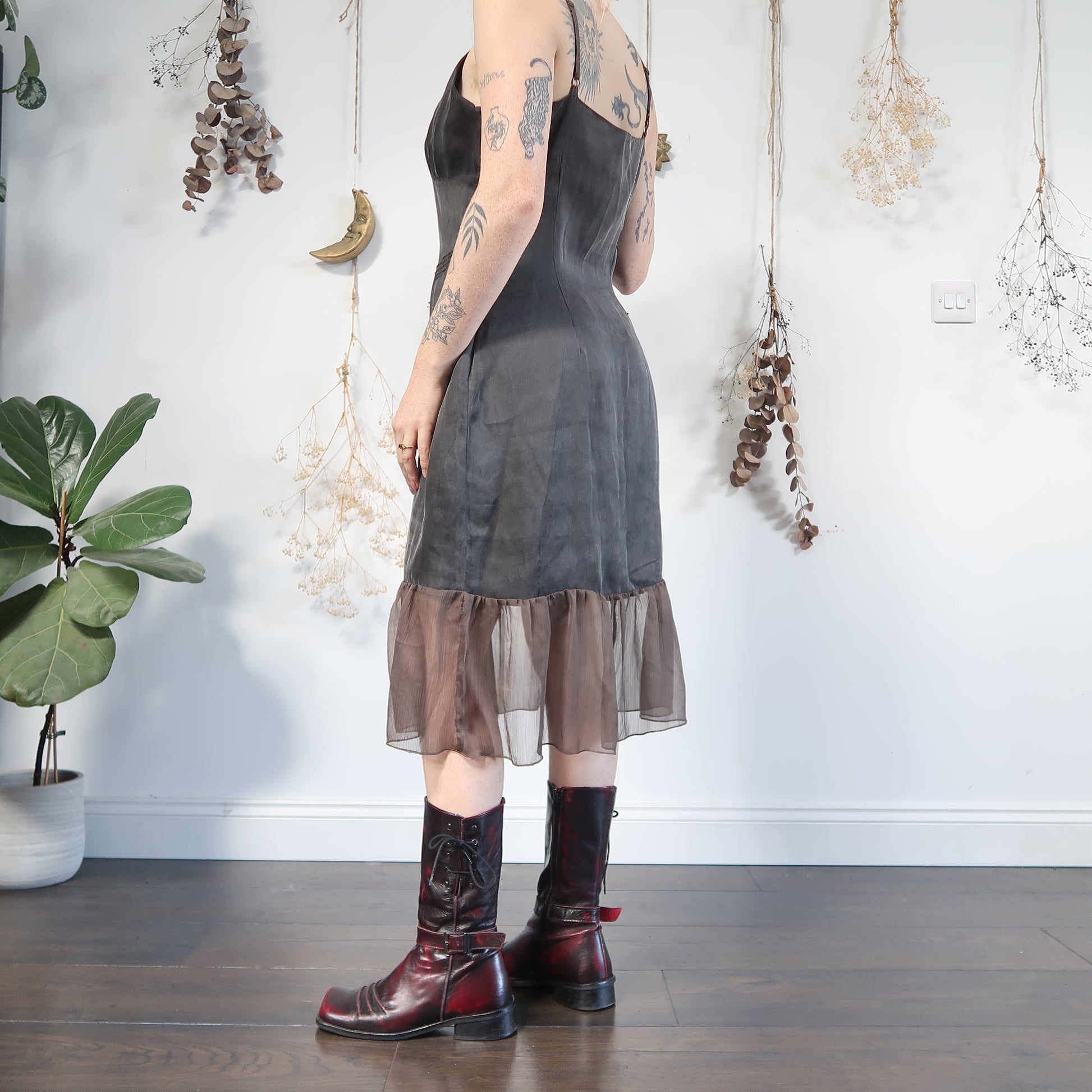 French vintage slate grey and cool brown midi dress with a lace up front and sheer hem