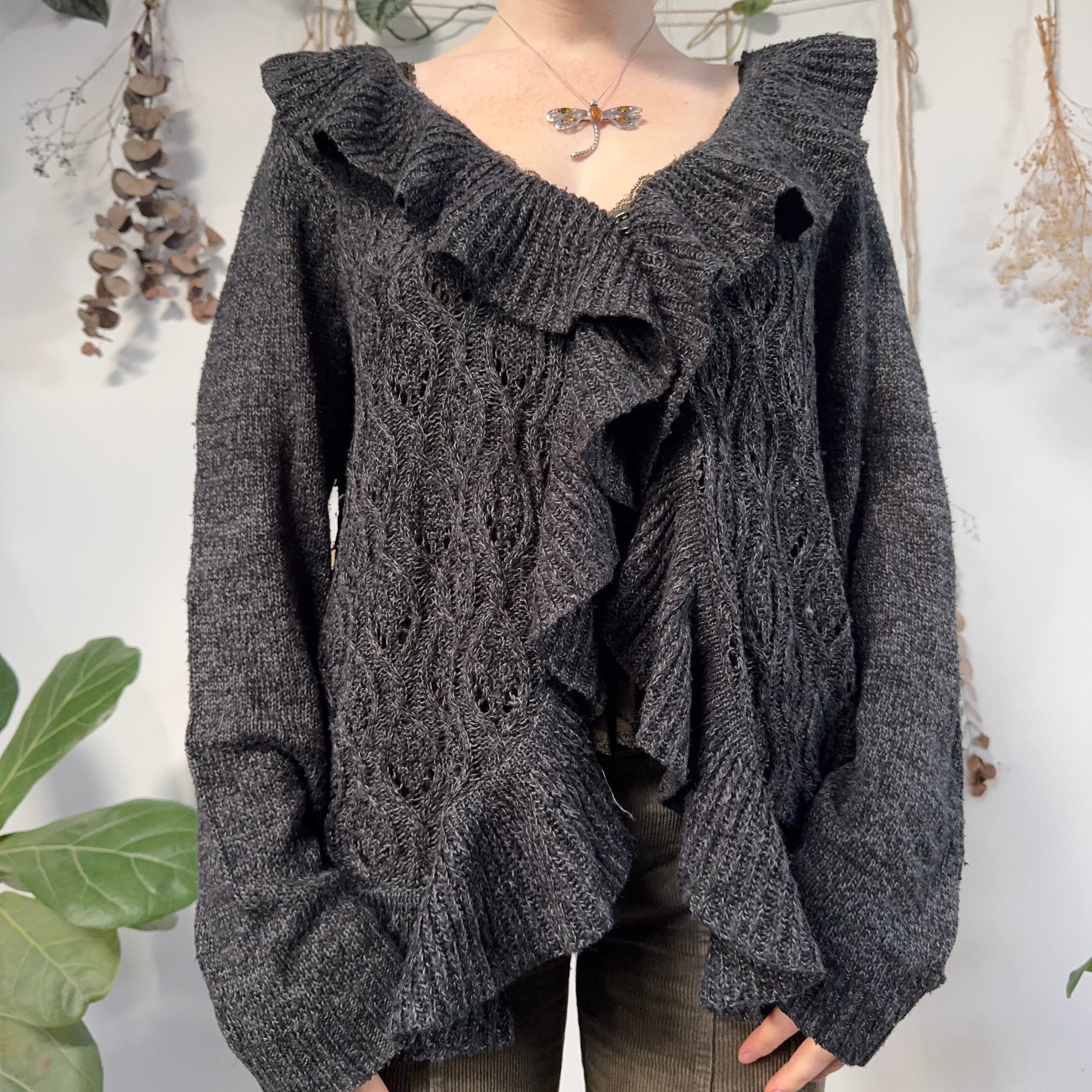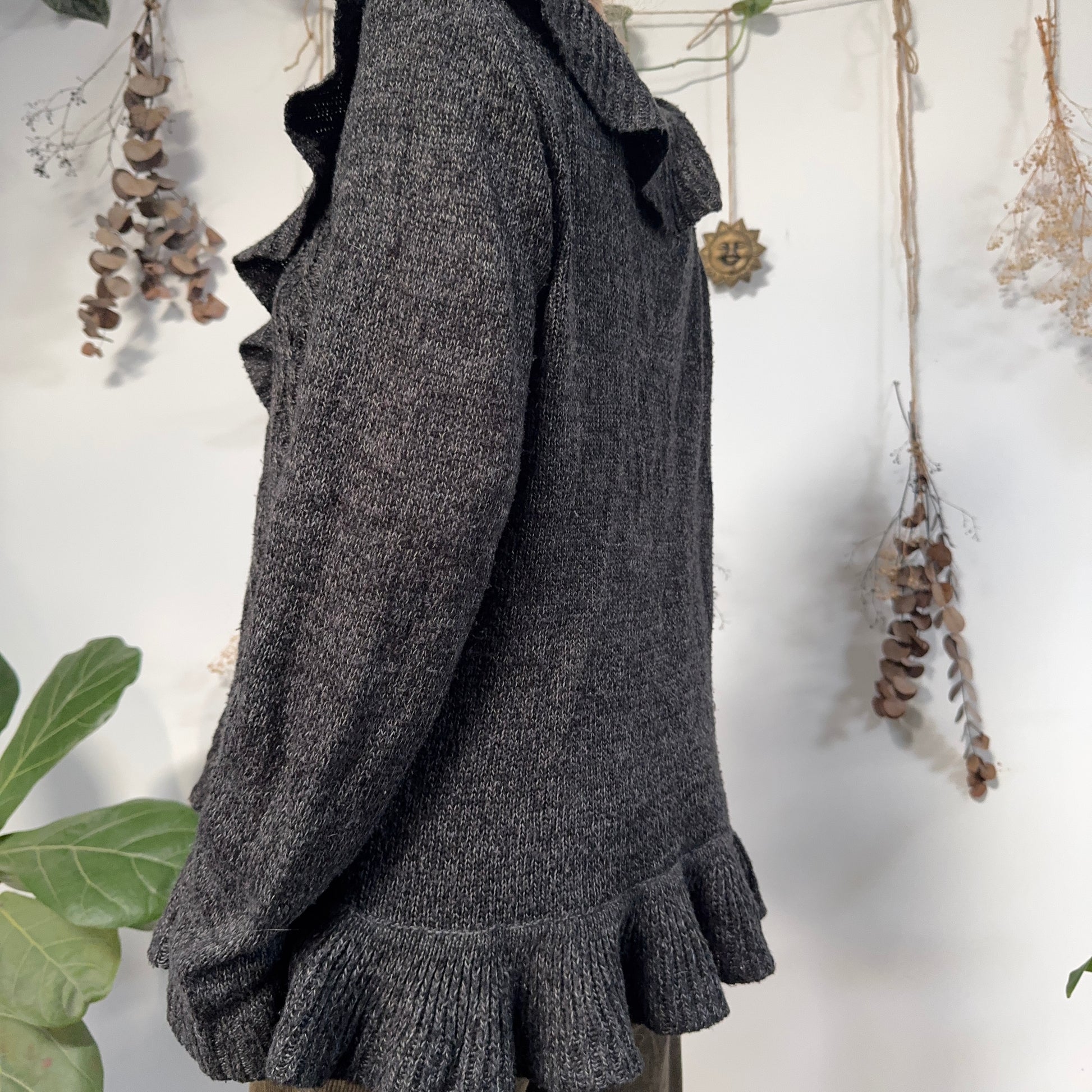 Vintage dark grey knit ruffle trim cardigan