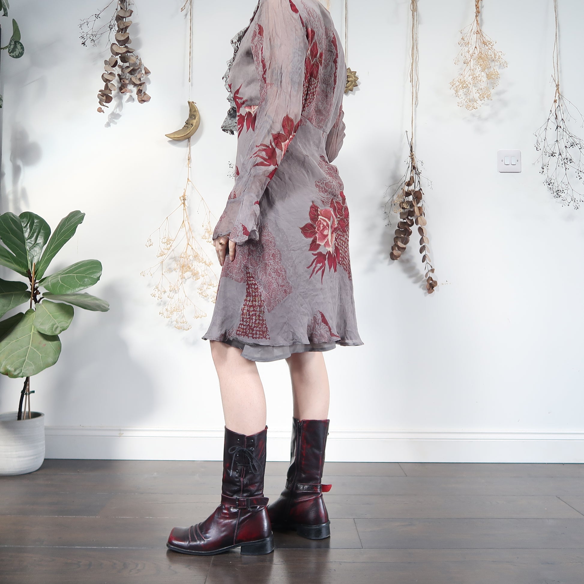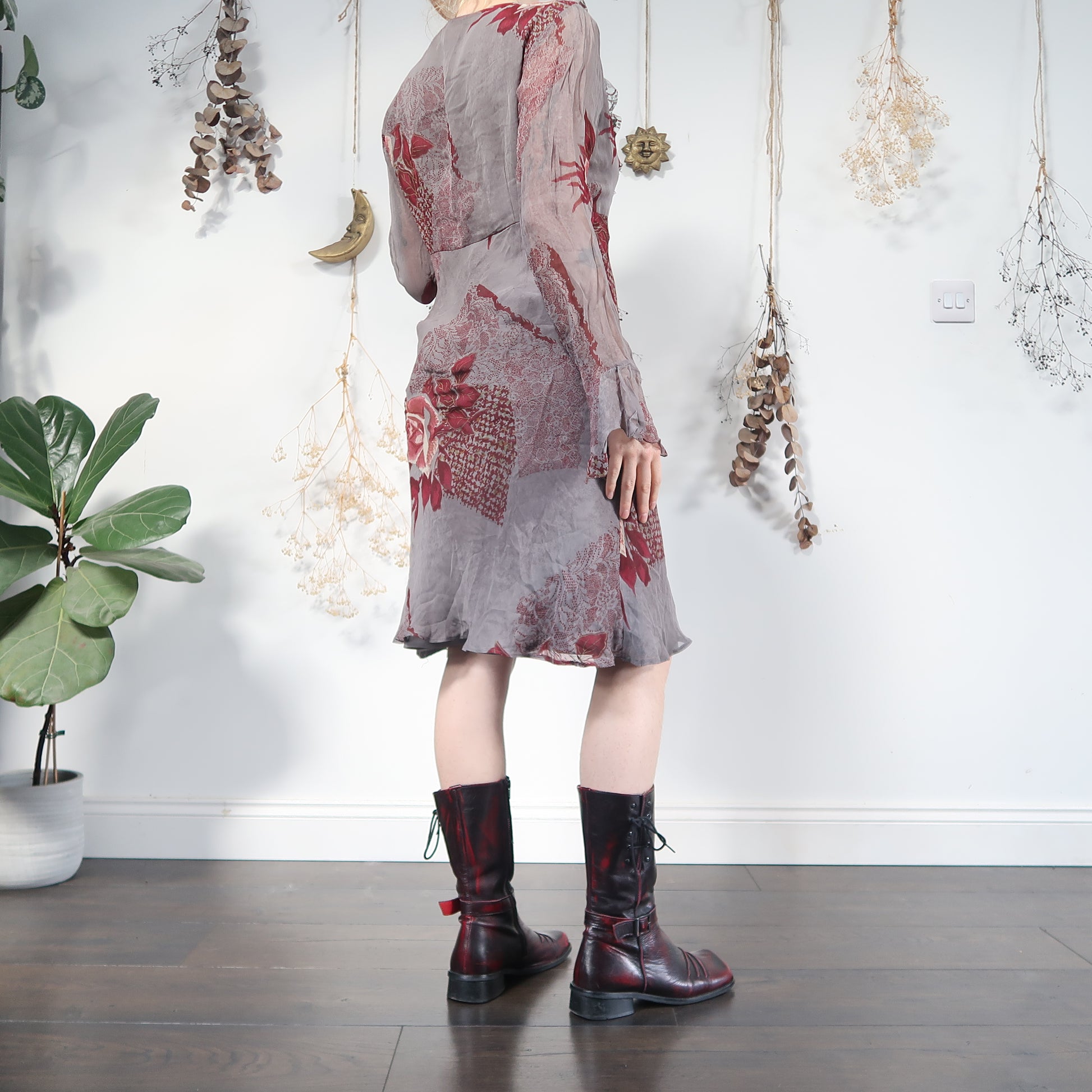 Vintage grey and burgundy floral midi dress with long flared sleeves and ruffle detail