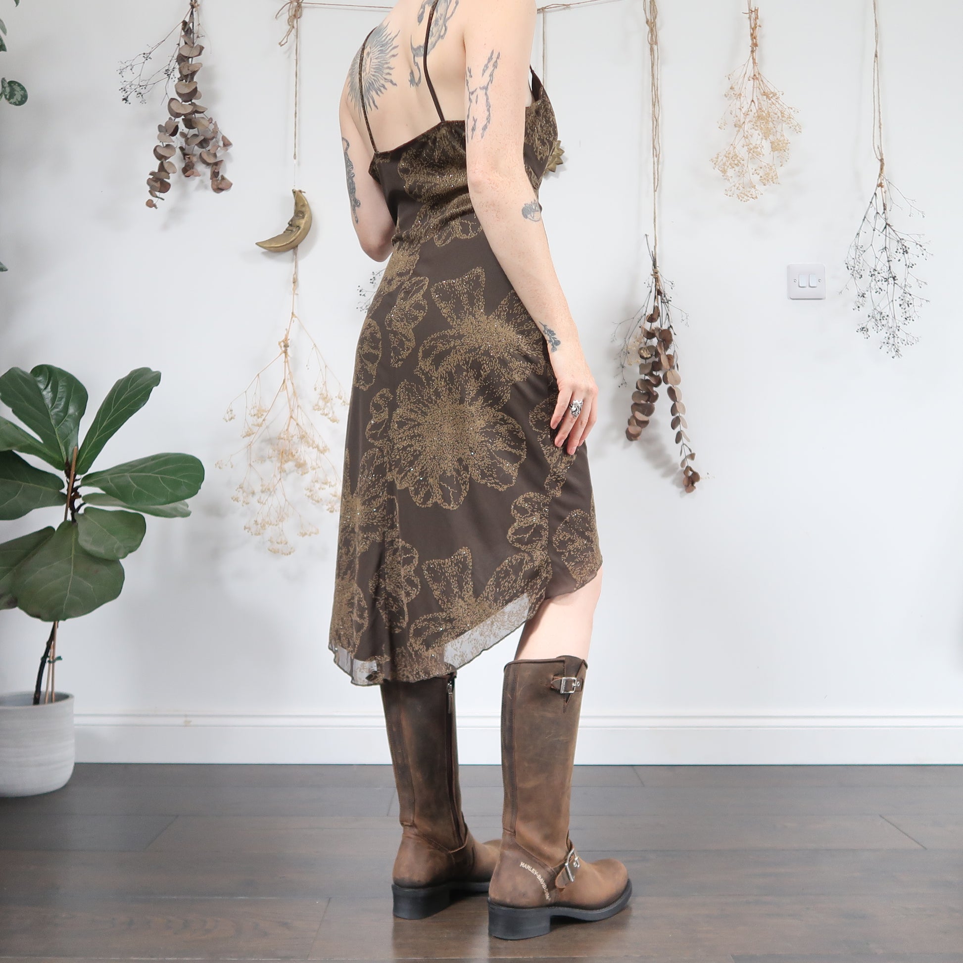 Vintage khaki velvety embossed patterened midi dress with some glitter, stretchy fabric, cowl neck and a dipped hem
