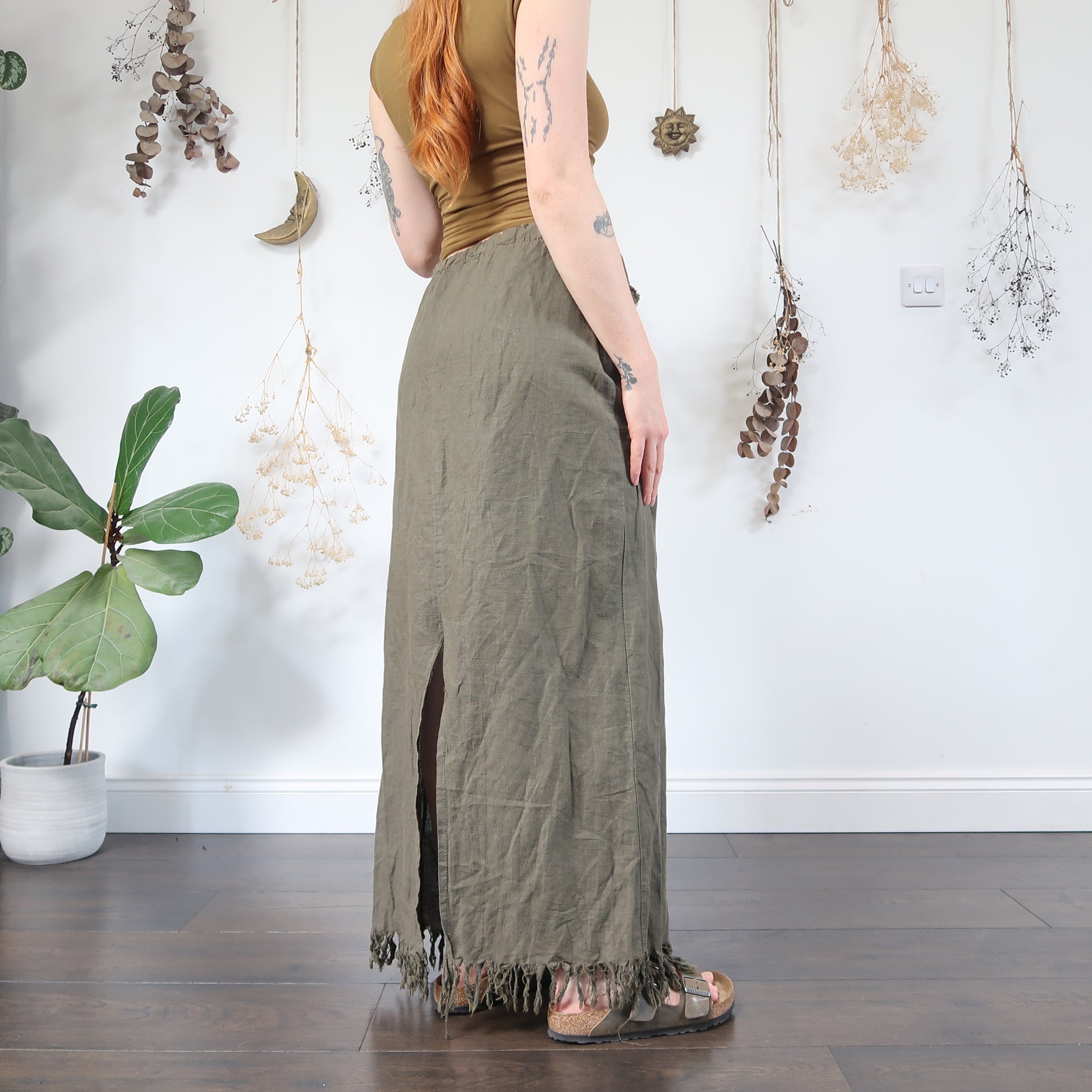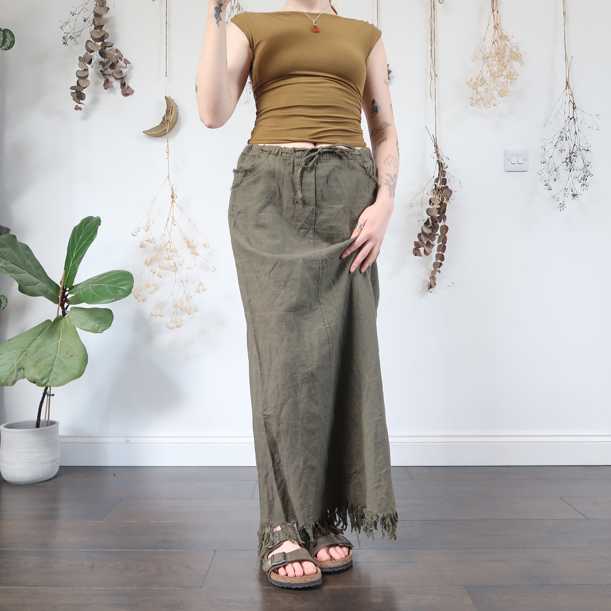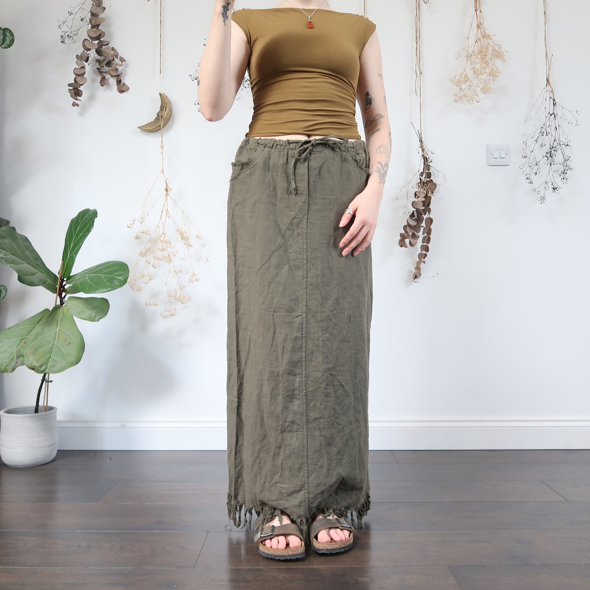 Vintage khaki linen maxi skirt with a fringe hem, pockets and a drawstring