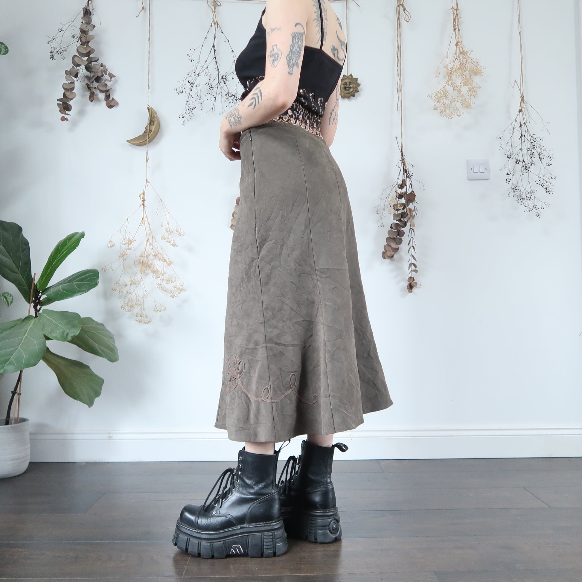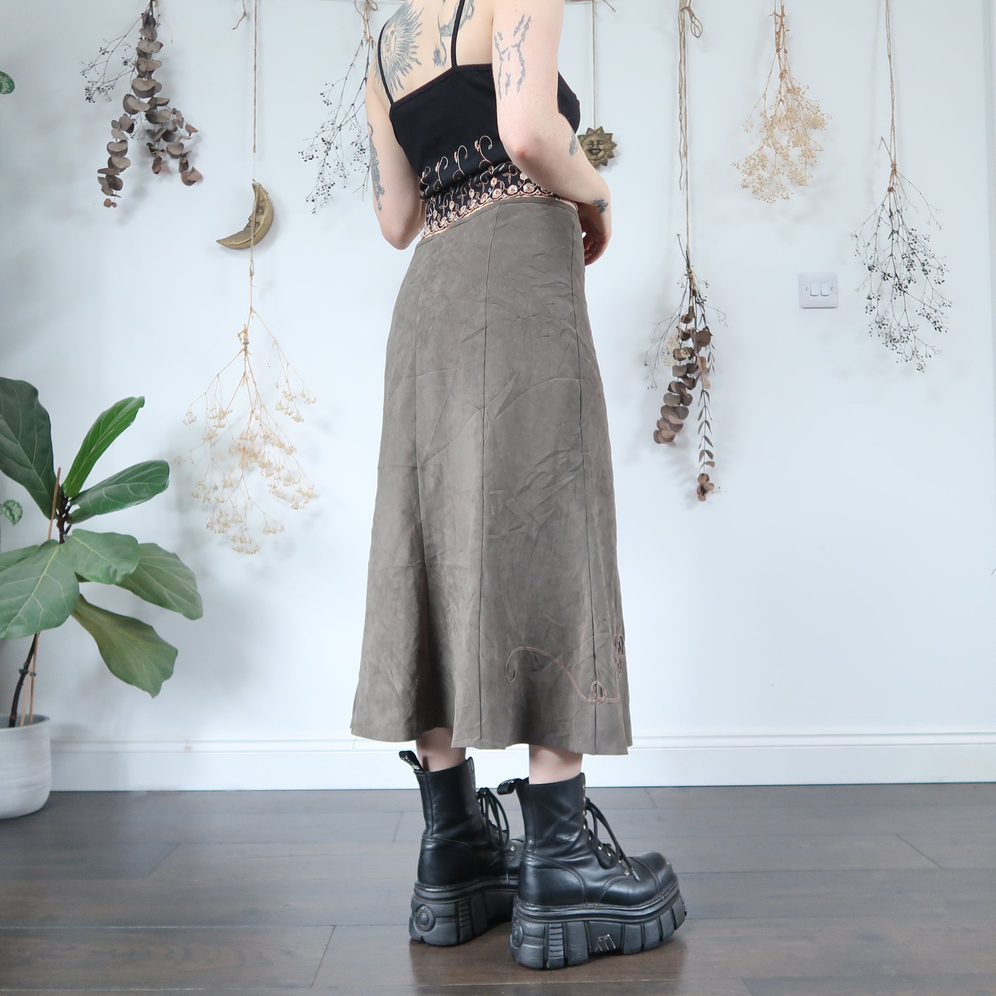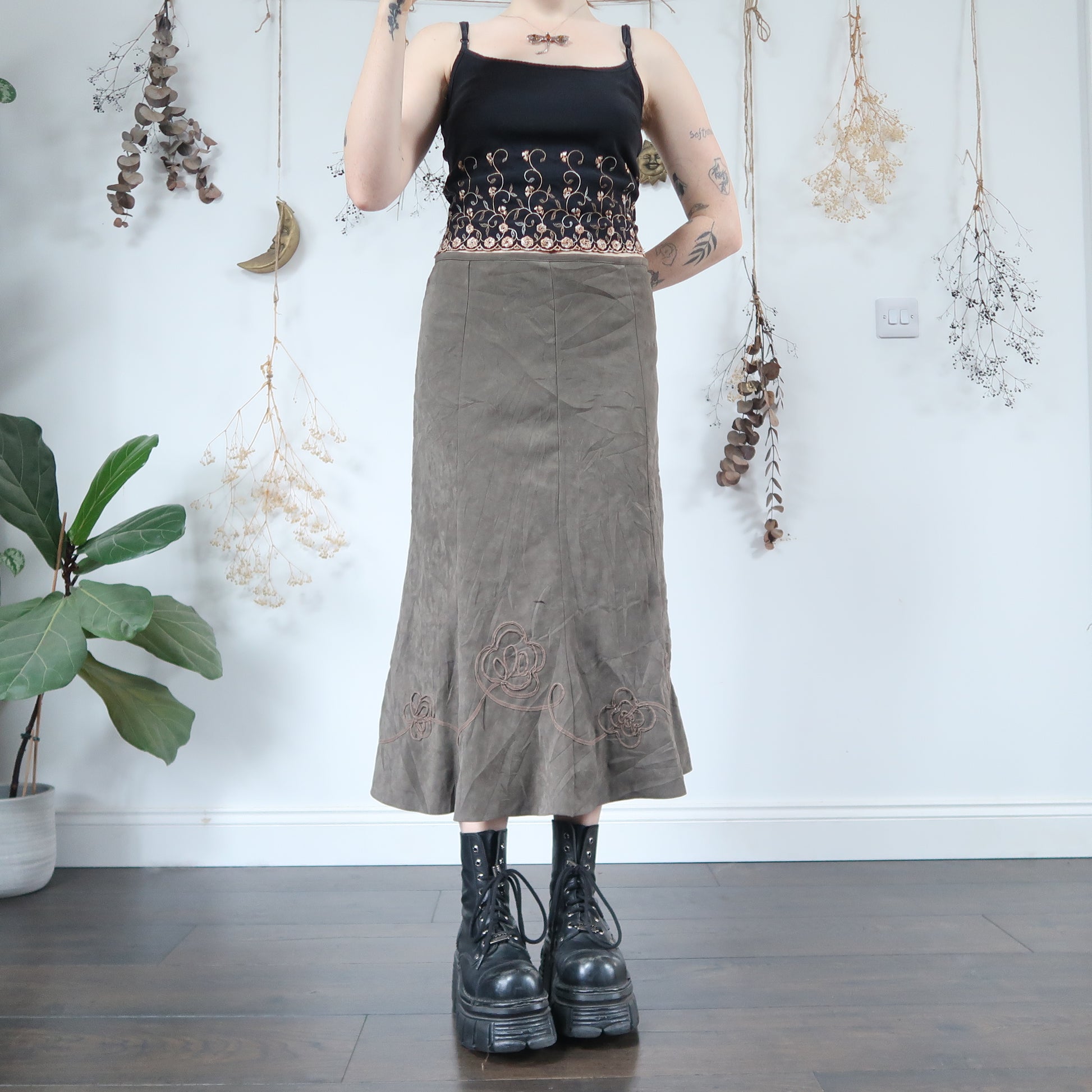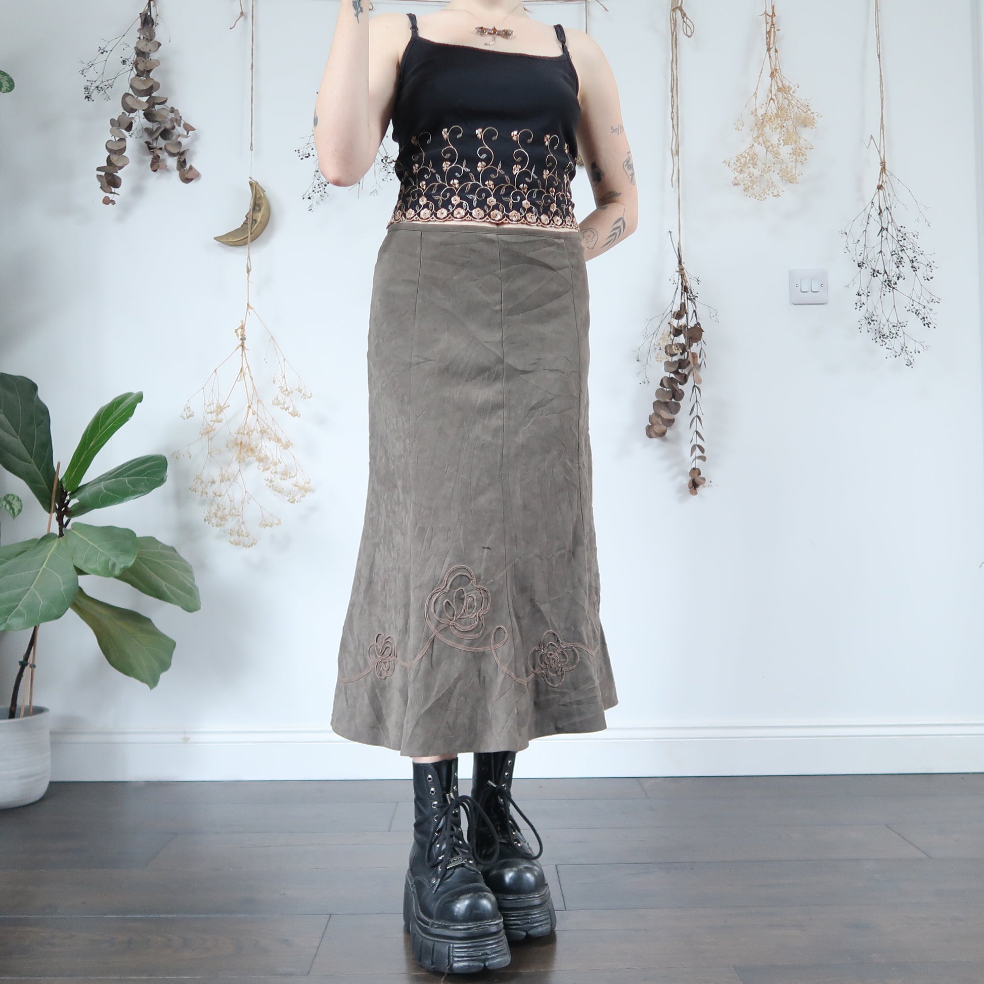 Vintage soft khaki skirt with floral detail