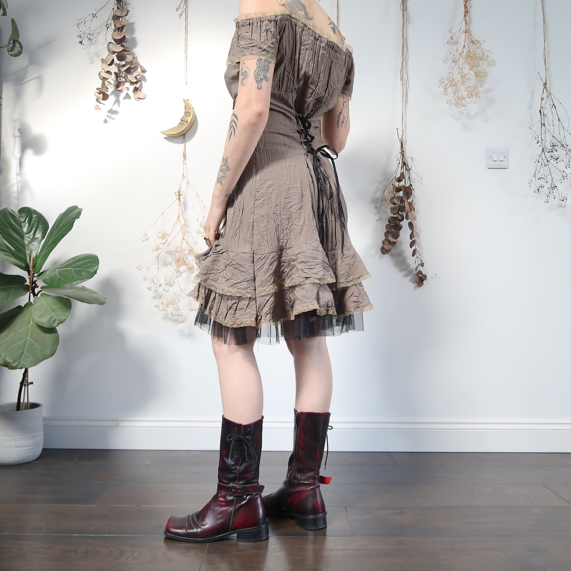 Vintage soft mink brown midi dress, it has velvet adjustable straps, a ruffled hem with lace trim and a corset lace up back