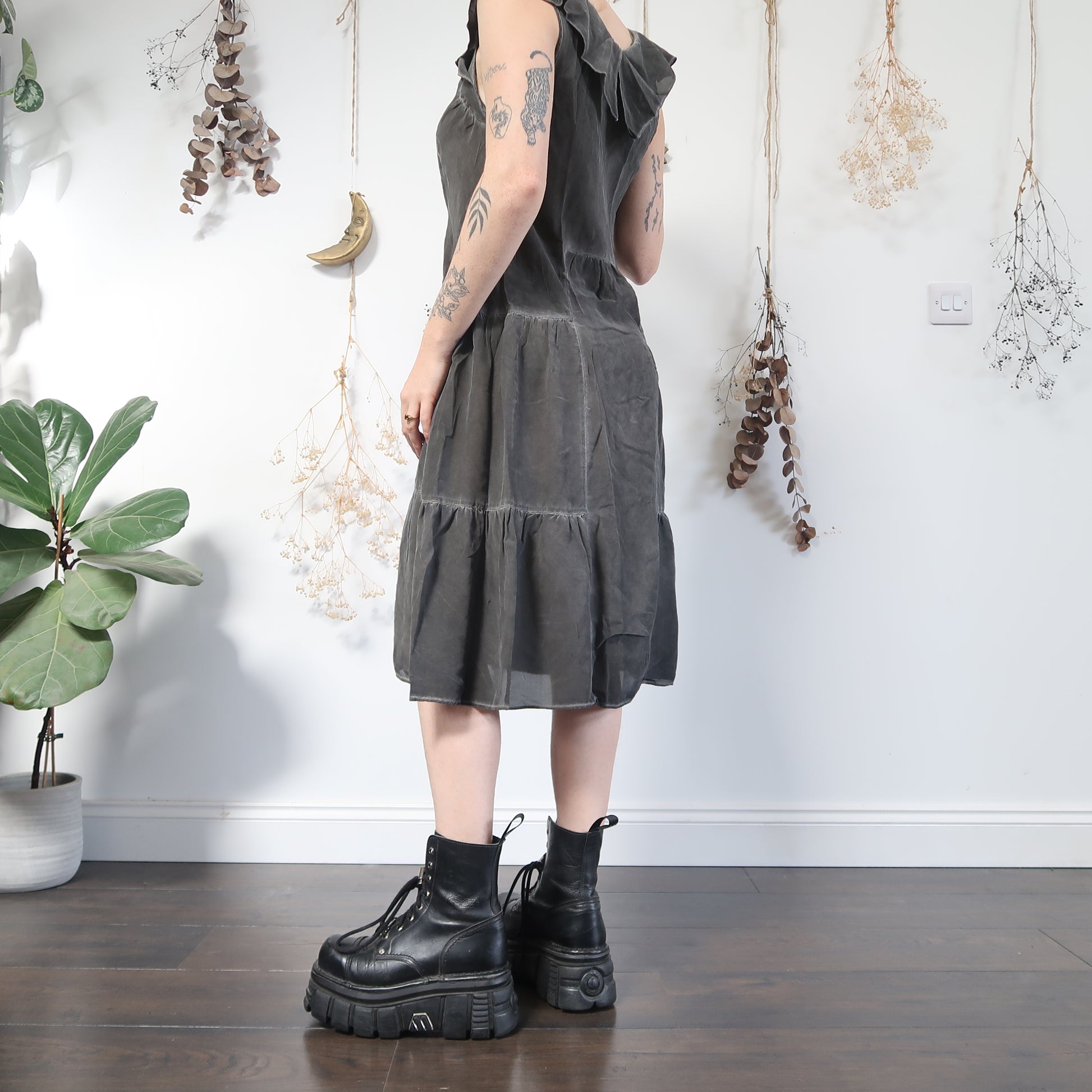 Vintage Cop Copine grey silk grunge midi dress with a sheer moth design on the front