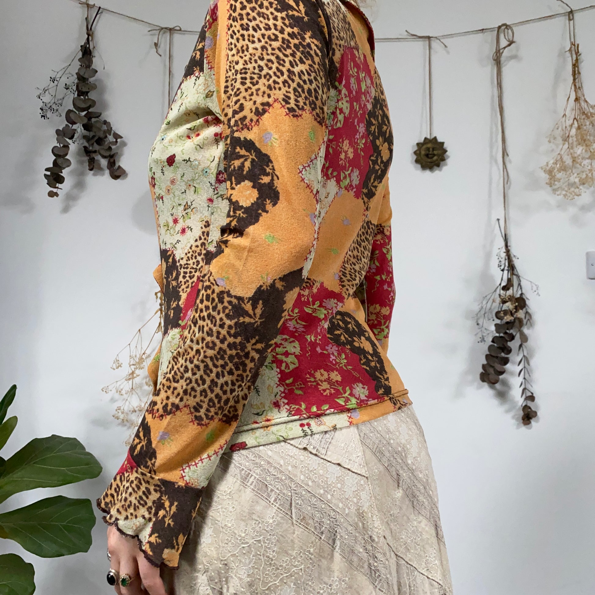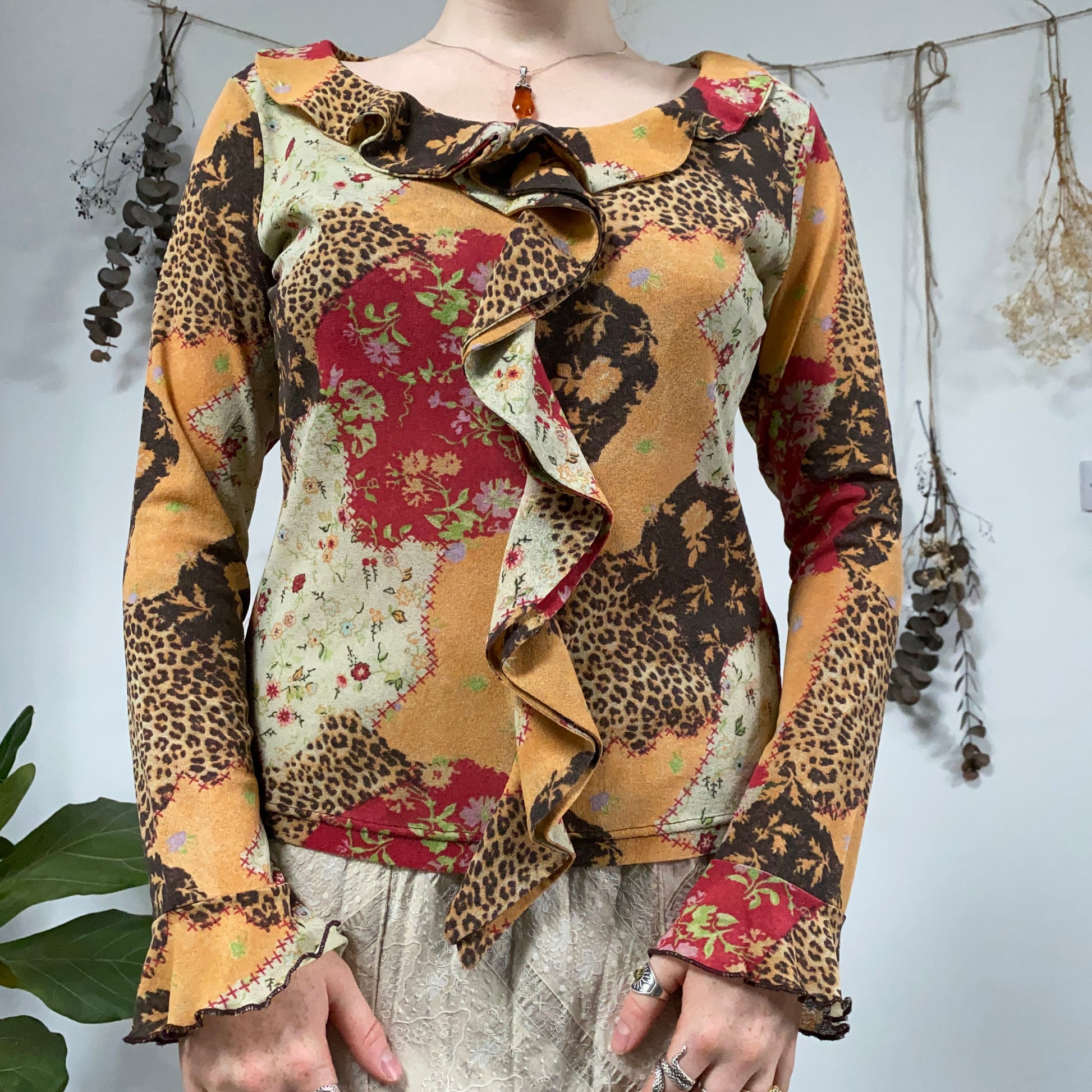 Vintage patchwork patterned mesh top with frill detail and flared sleeves
