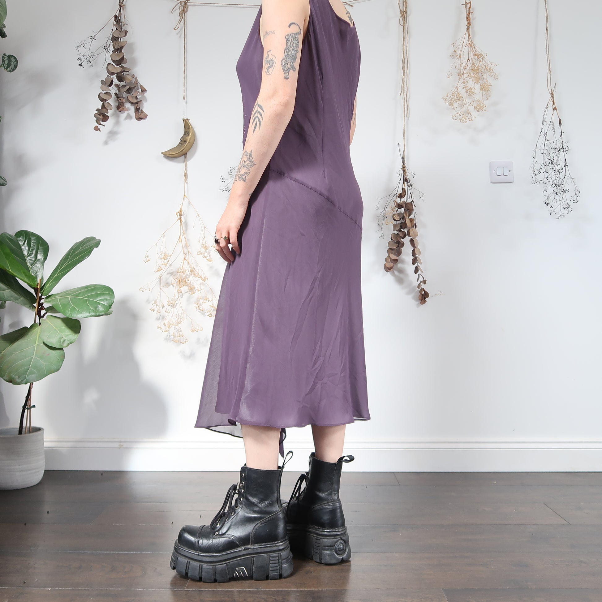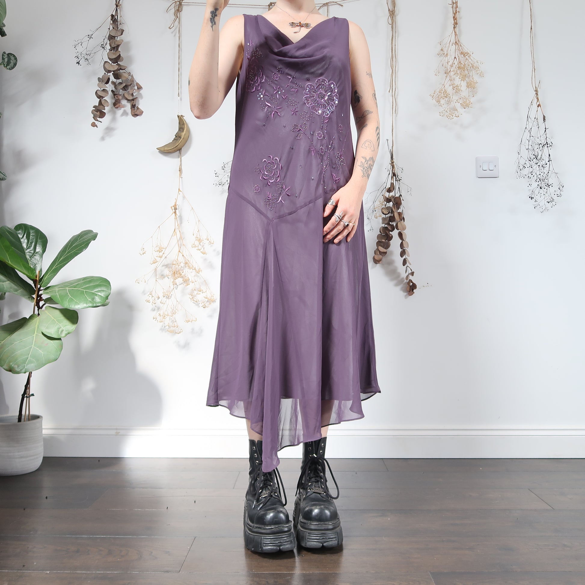 Vintage purple flowy beaded and embroidered dress with a cowl neck