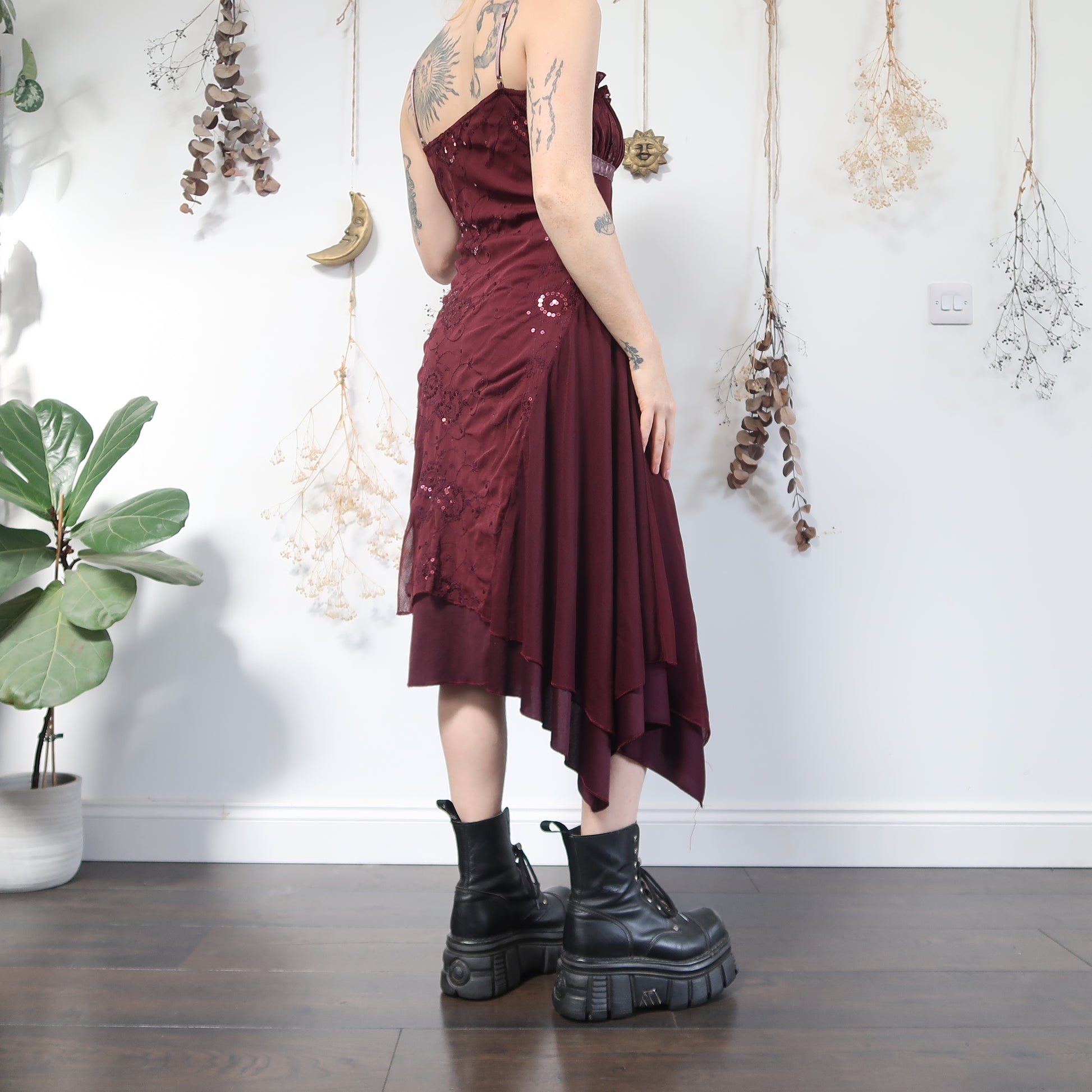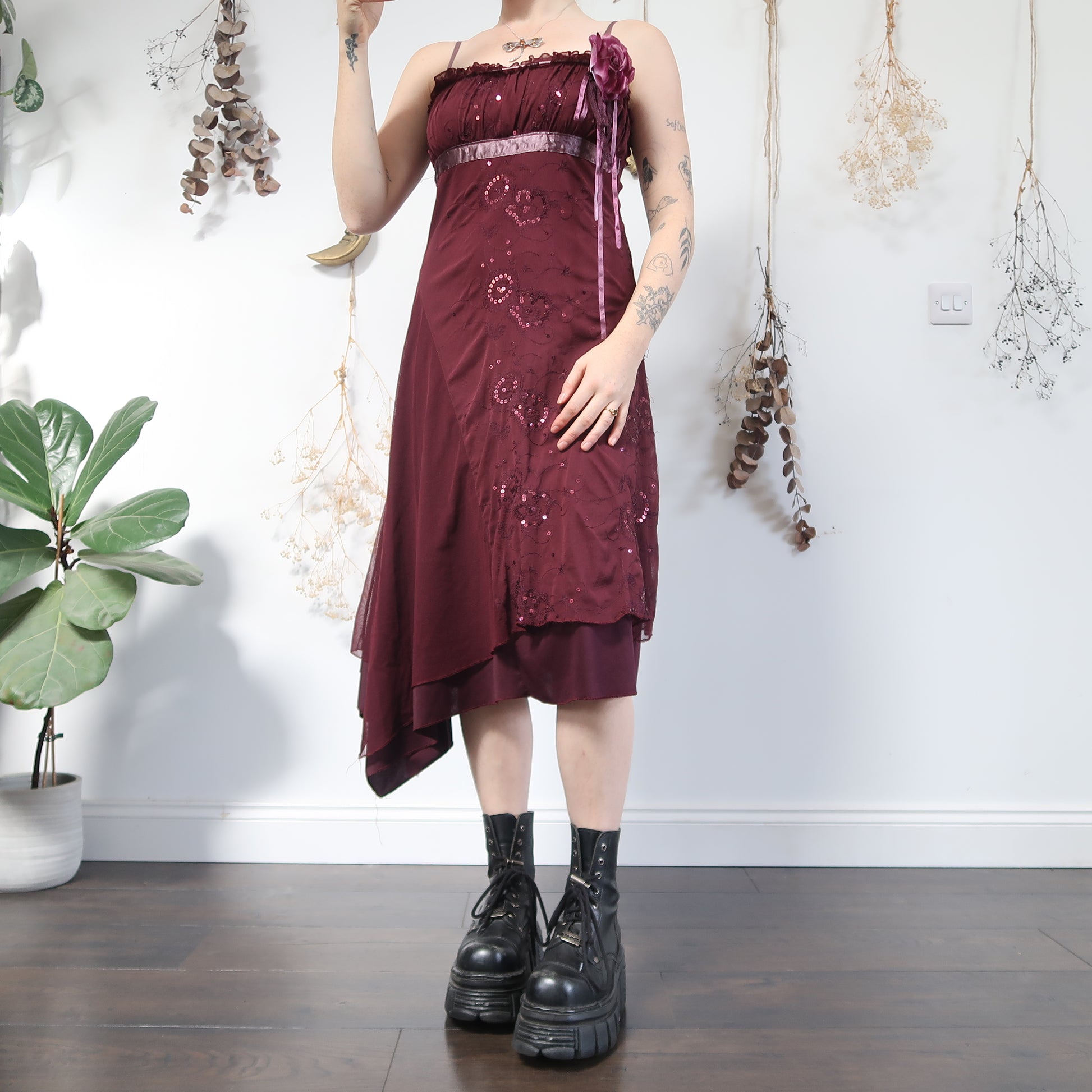 Dreamy vintage LM Lulu purple mesh midi dress with an asymmetric hem, ruched bust and gorgeous floral detail