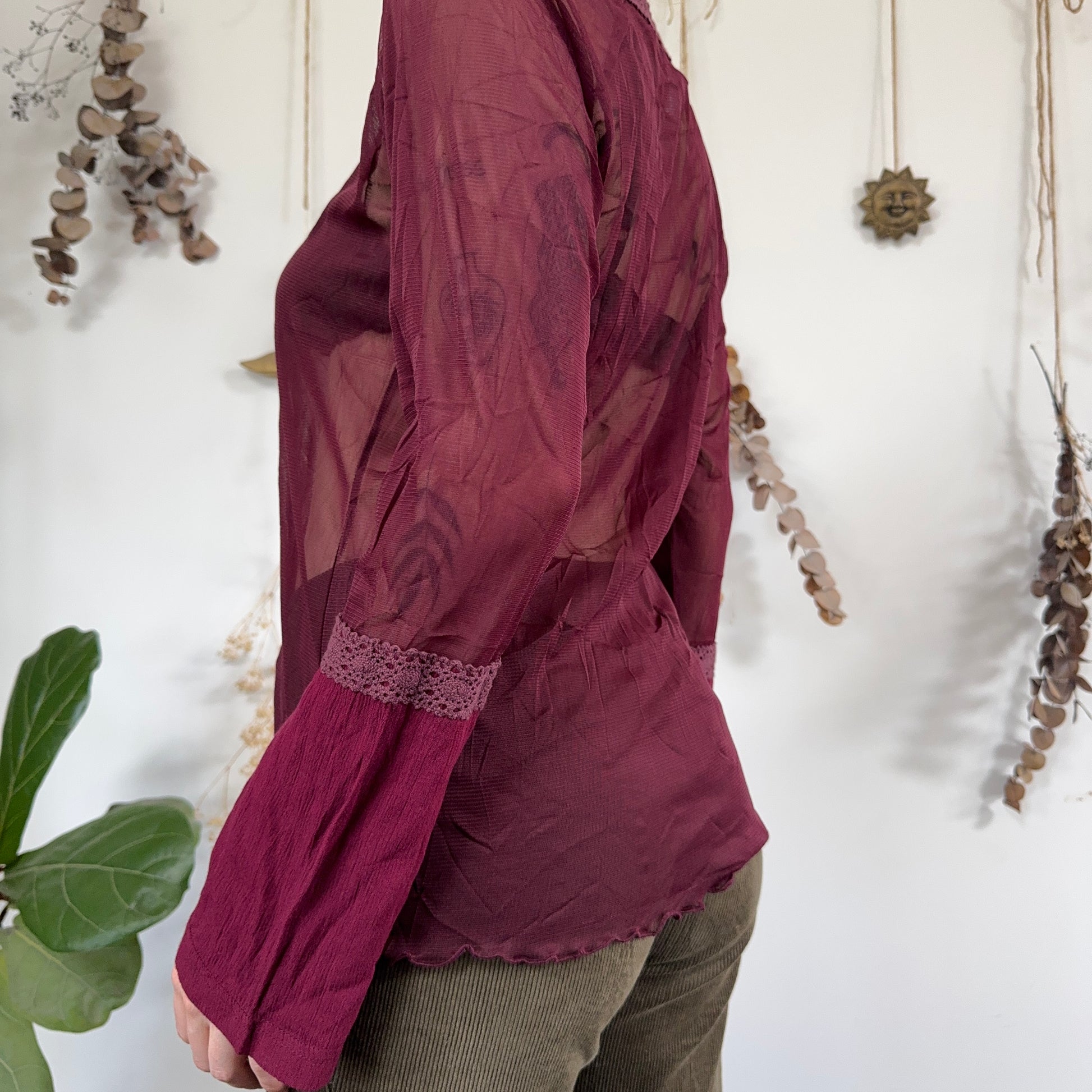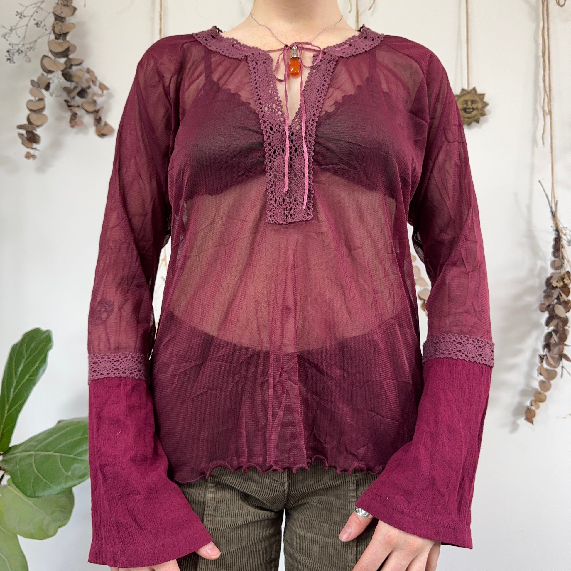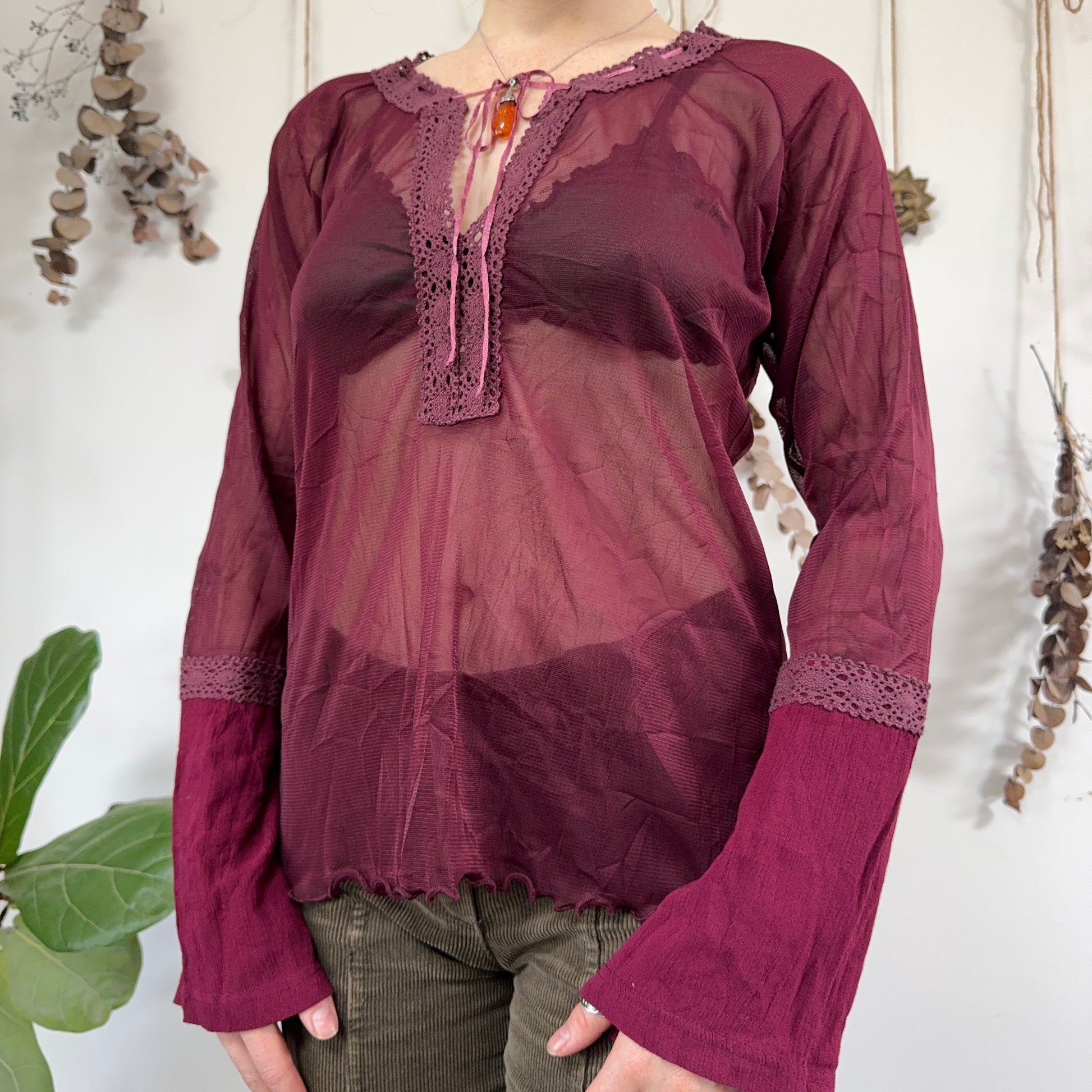 Vintage grape purple mesh top with lace up detail and flared sleeves